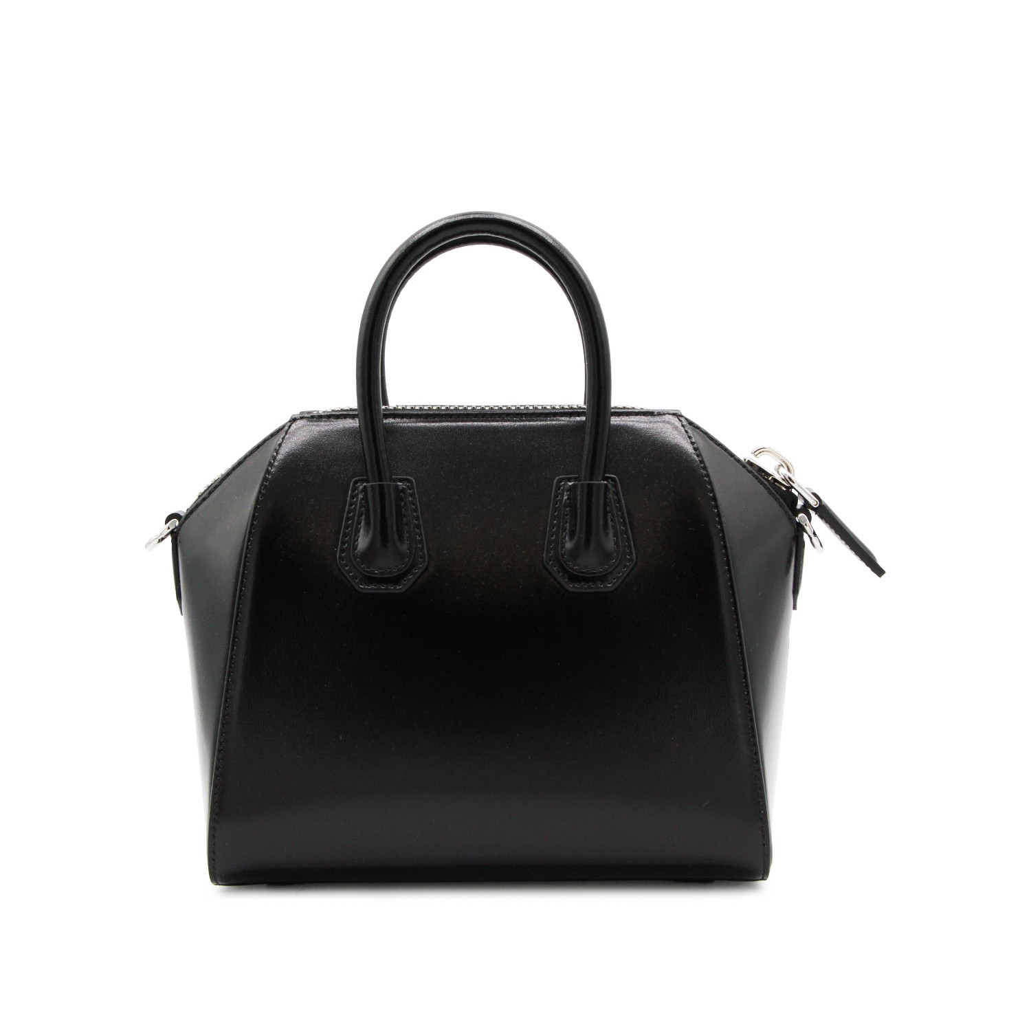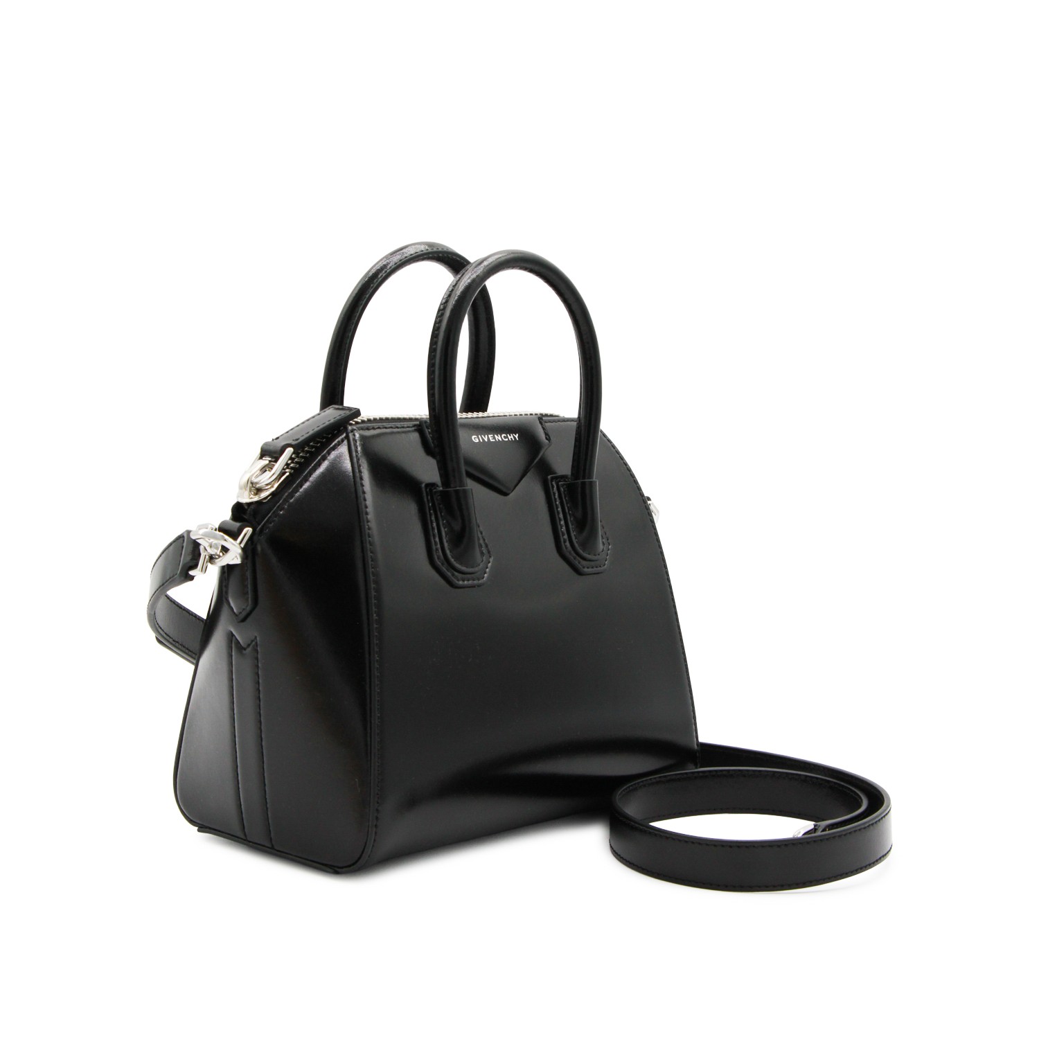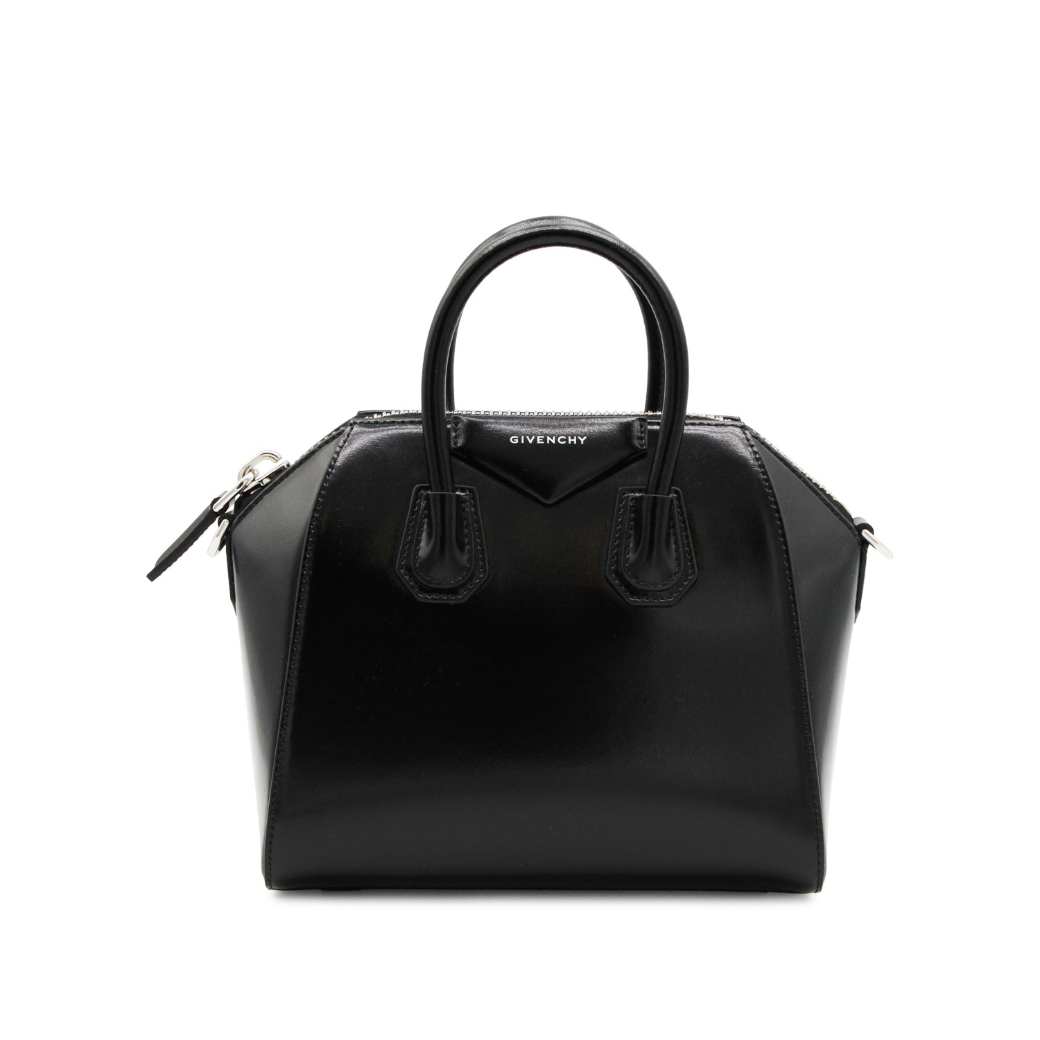 Black leather Antigona top handle bag from Givenchy featuring top handles, zip fastening, inside pocket and frontal logo.