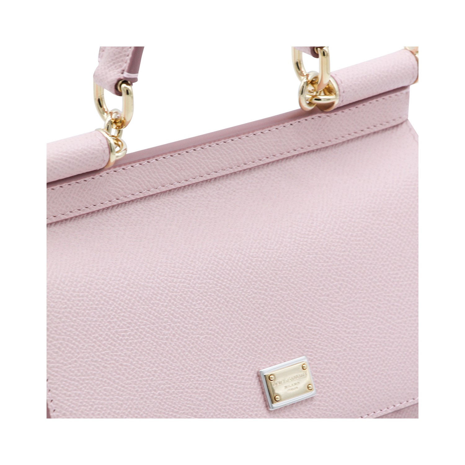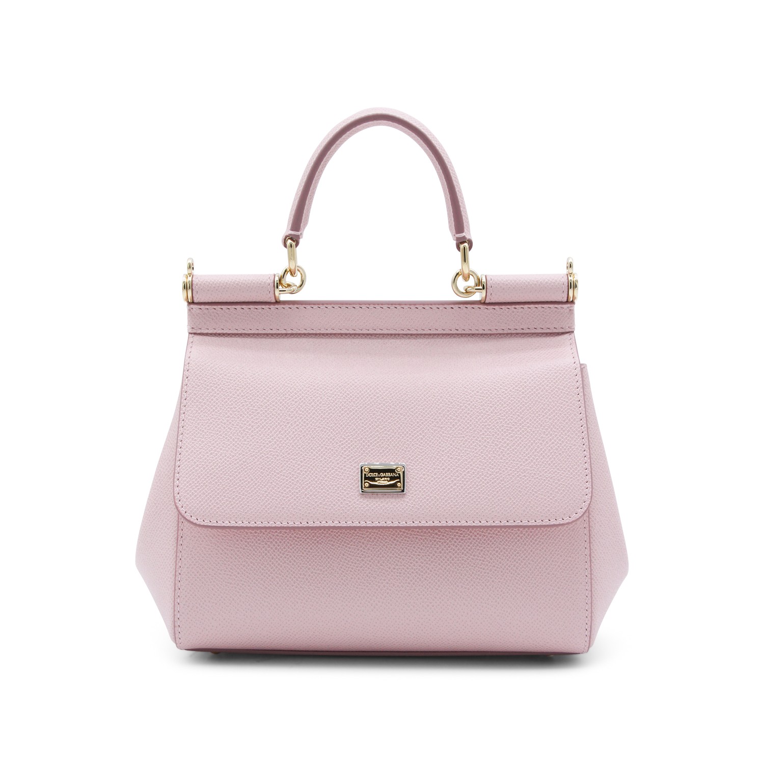Pink leather Sicily small top handle bag from Dolce & Gabbana featuring top handle, frontal fastening, gold tone hardware, adjustable and removable shoulder strap, main compartment and inside pocket.