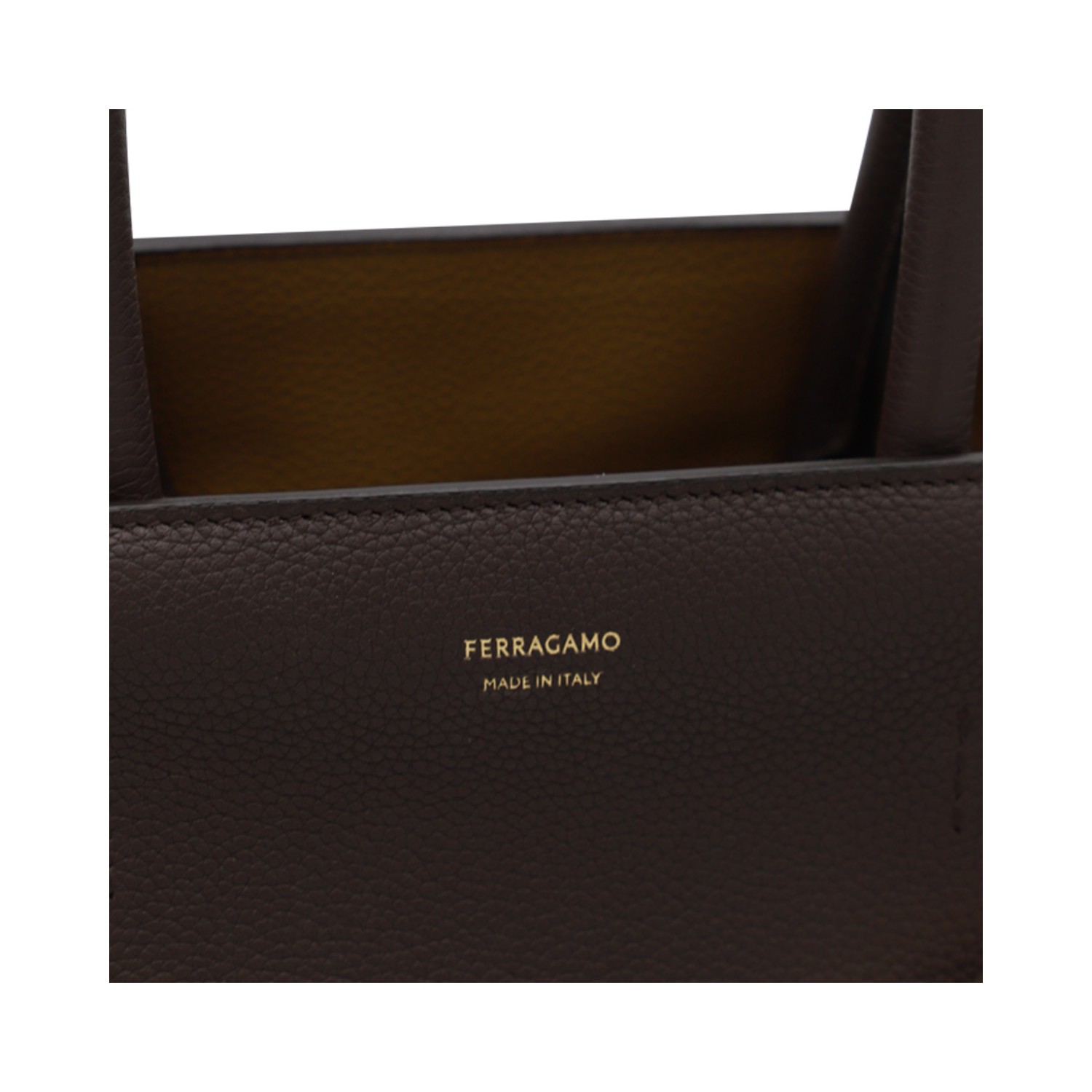 Dark brown leather Hug S top handle bag from Ferragamo featuring handles, frontal logo print, buckle details, main compartment and inside pockets.