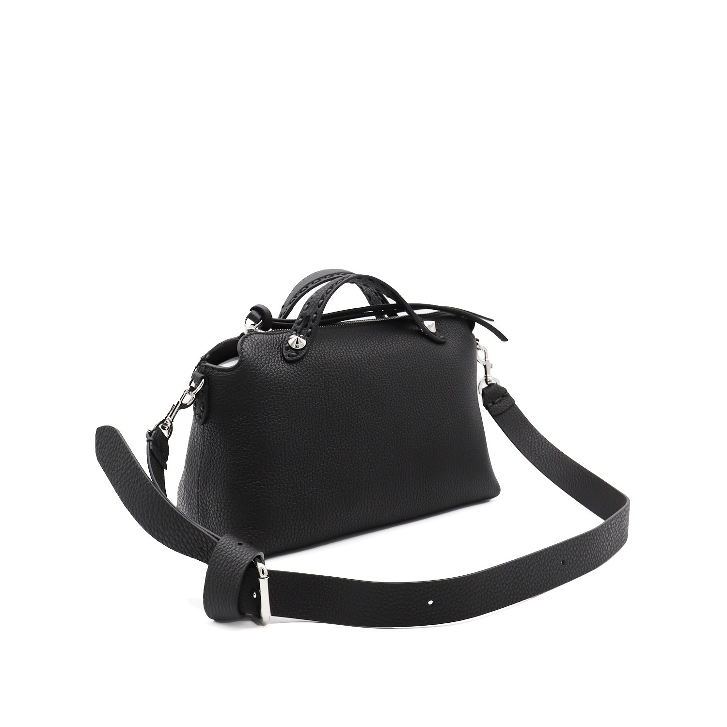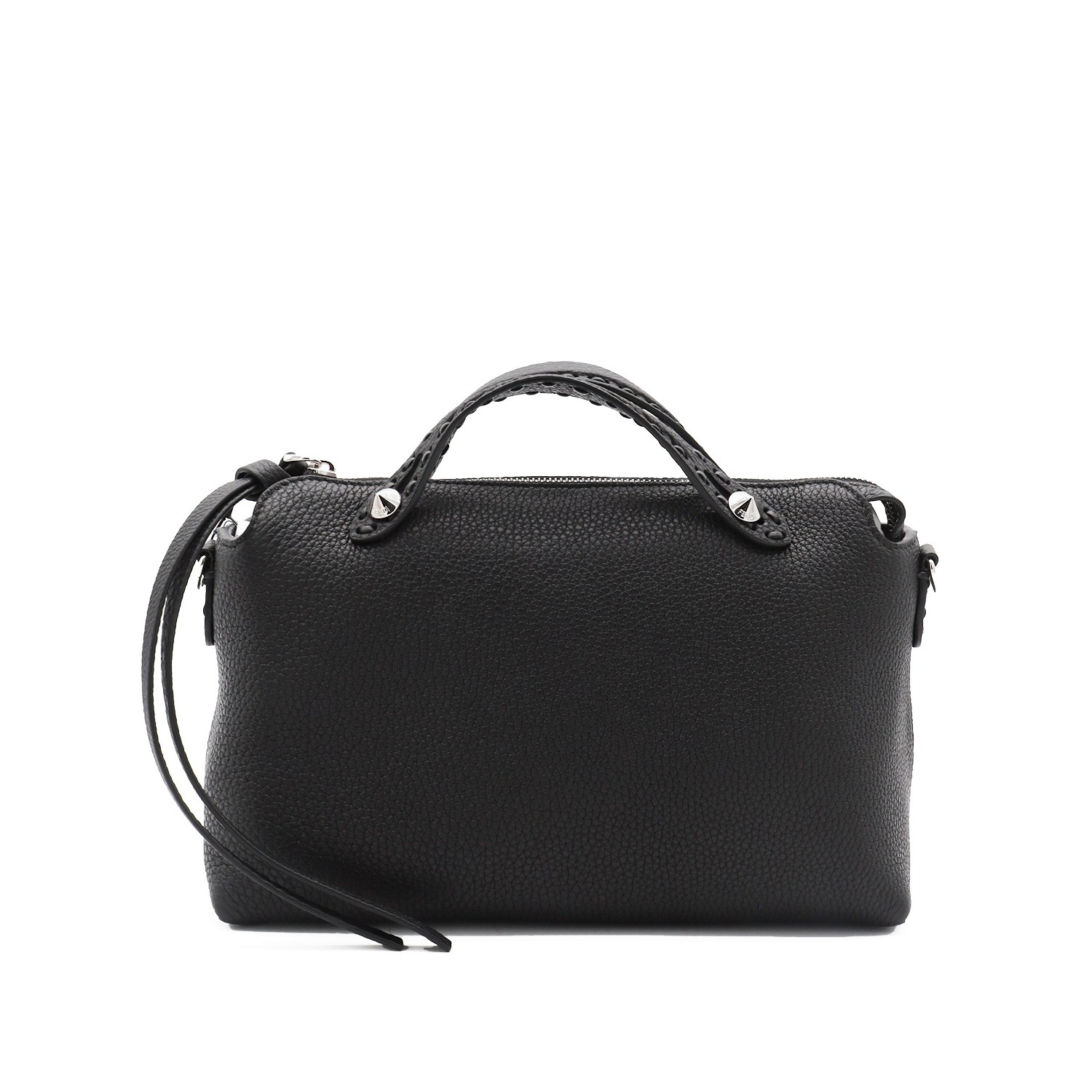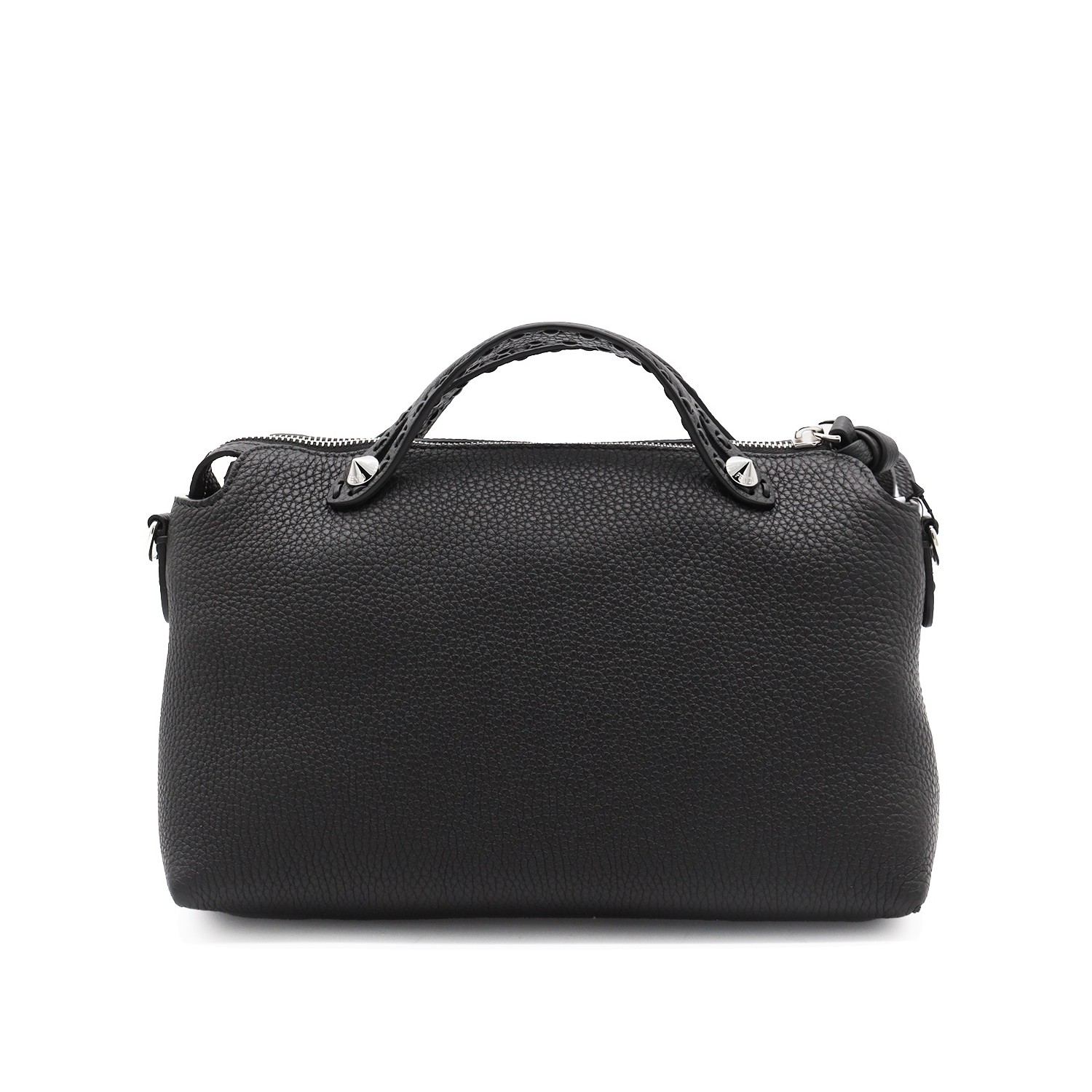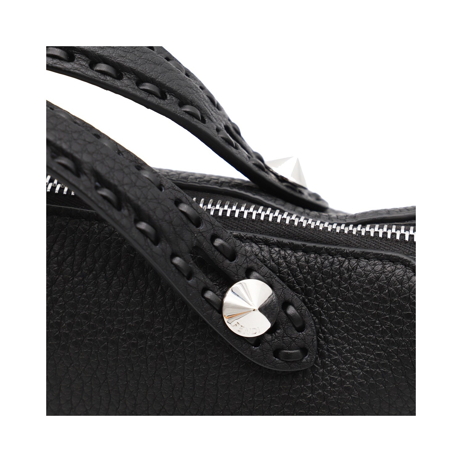 Black leather top handle bag from Fendi featuring top handles, zip fastening, adjustable shoulder strap, silver tone hardware, main compartment and pocket.
