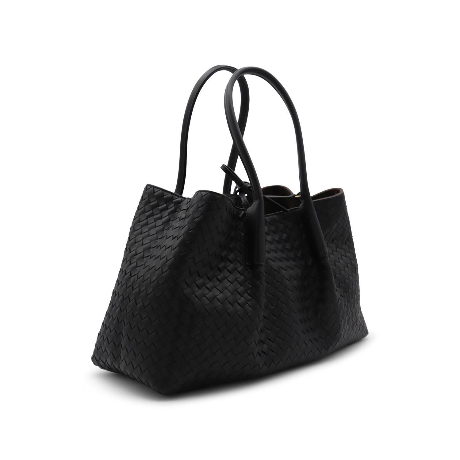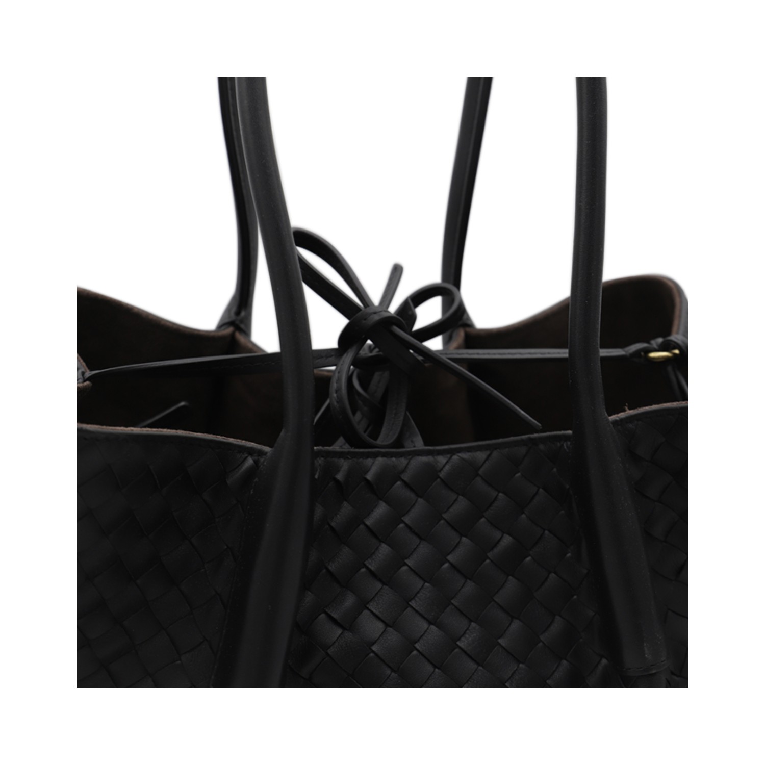 Black leather Pinacoteca bag featuring all-over Intreccio motif, top handles, drawstrings fastening, suede, main compartment and inside pocket.