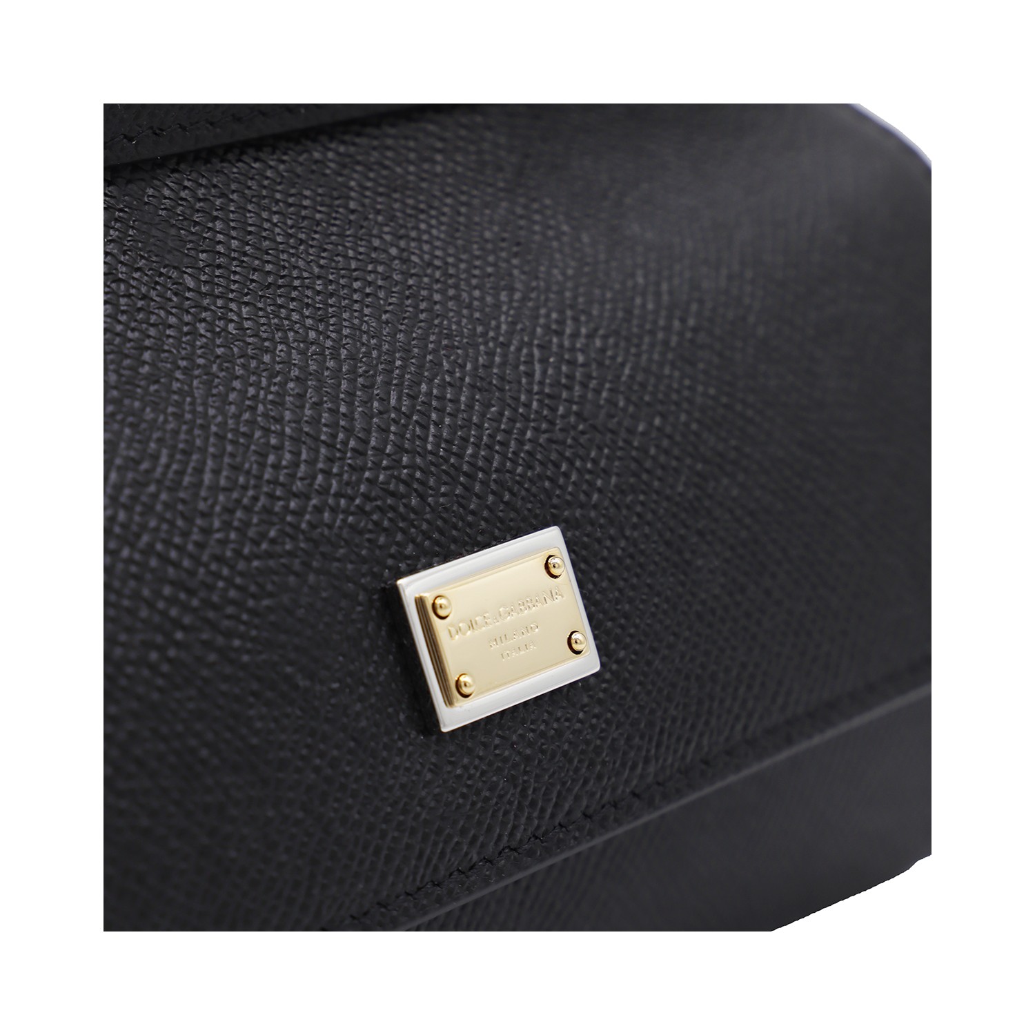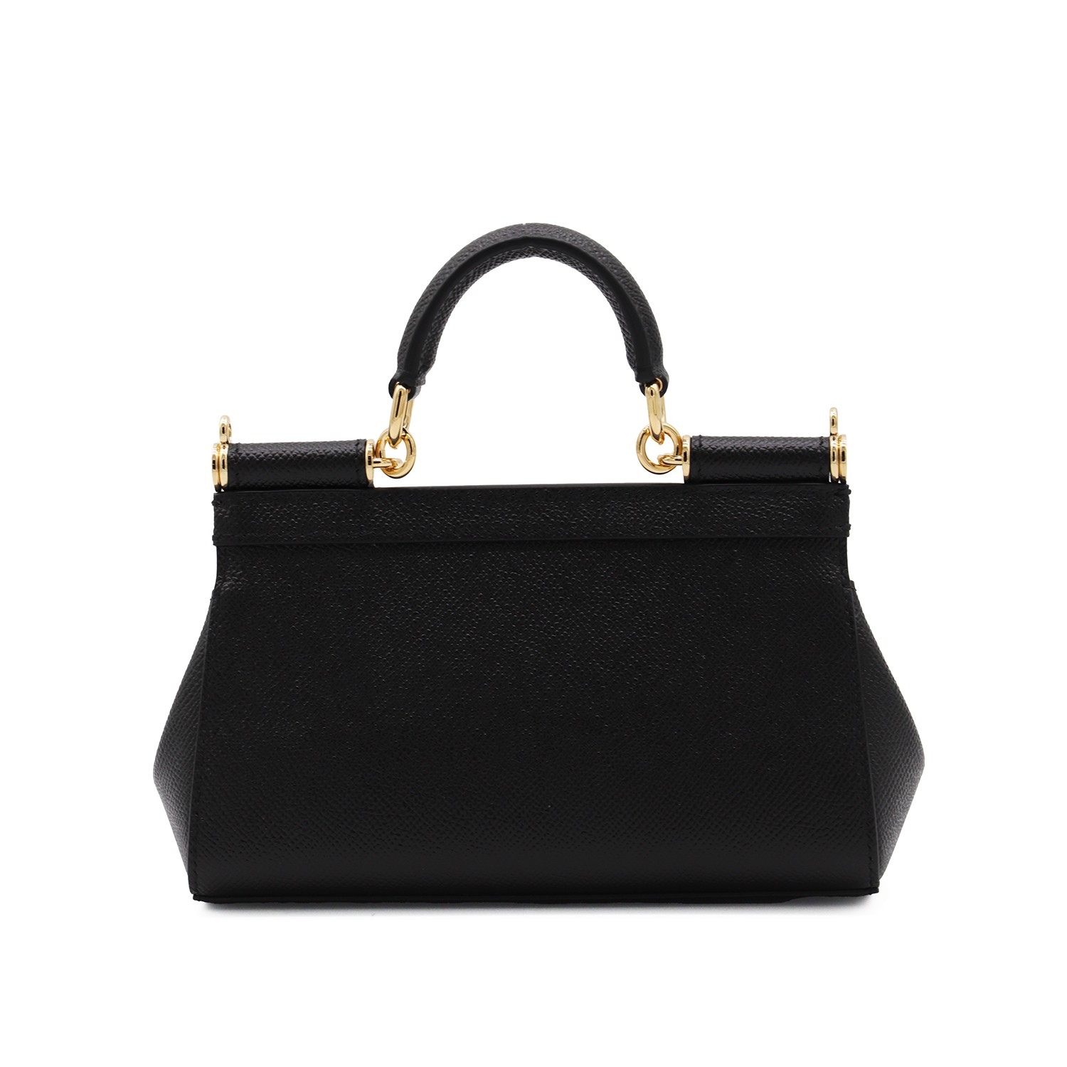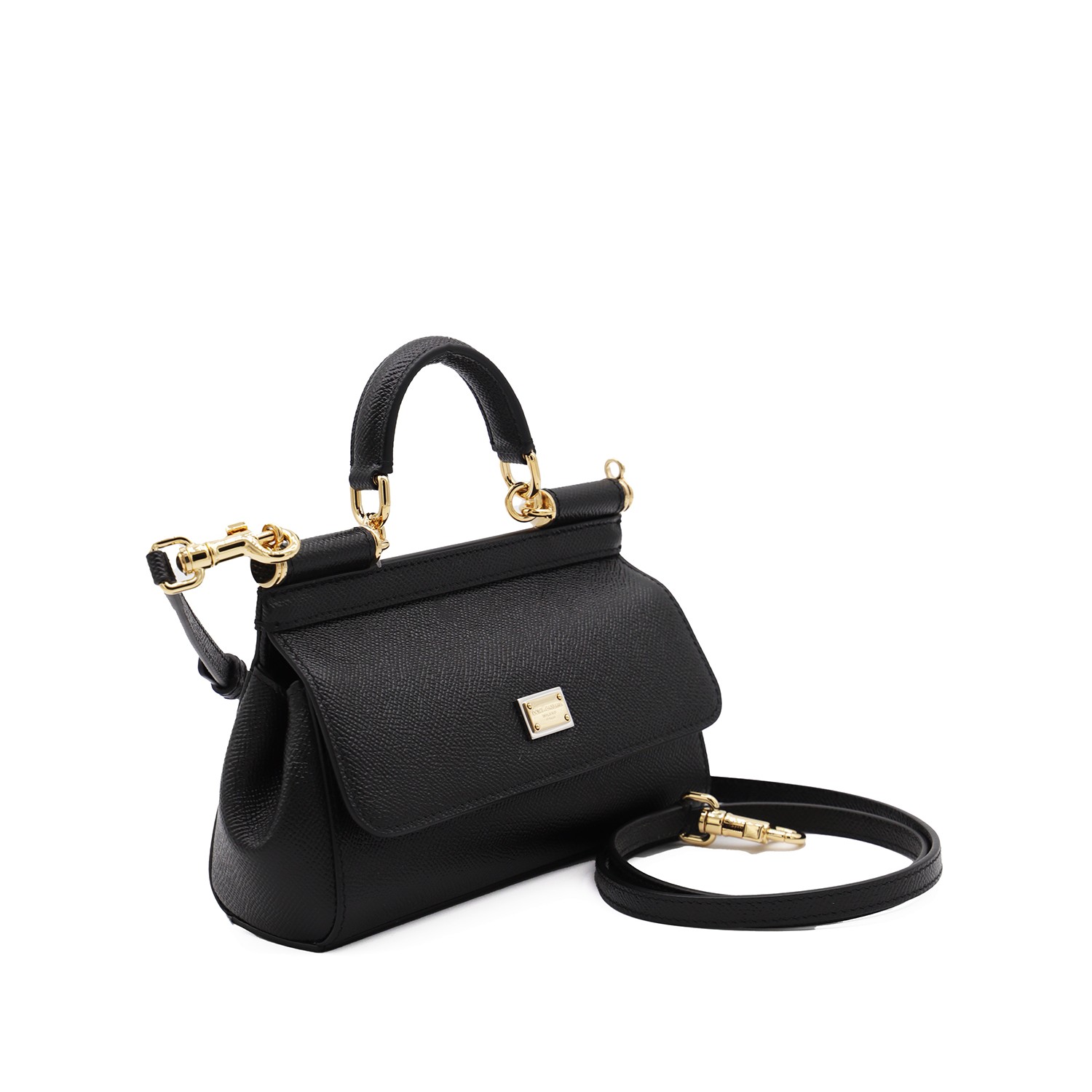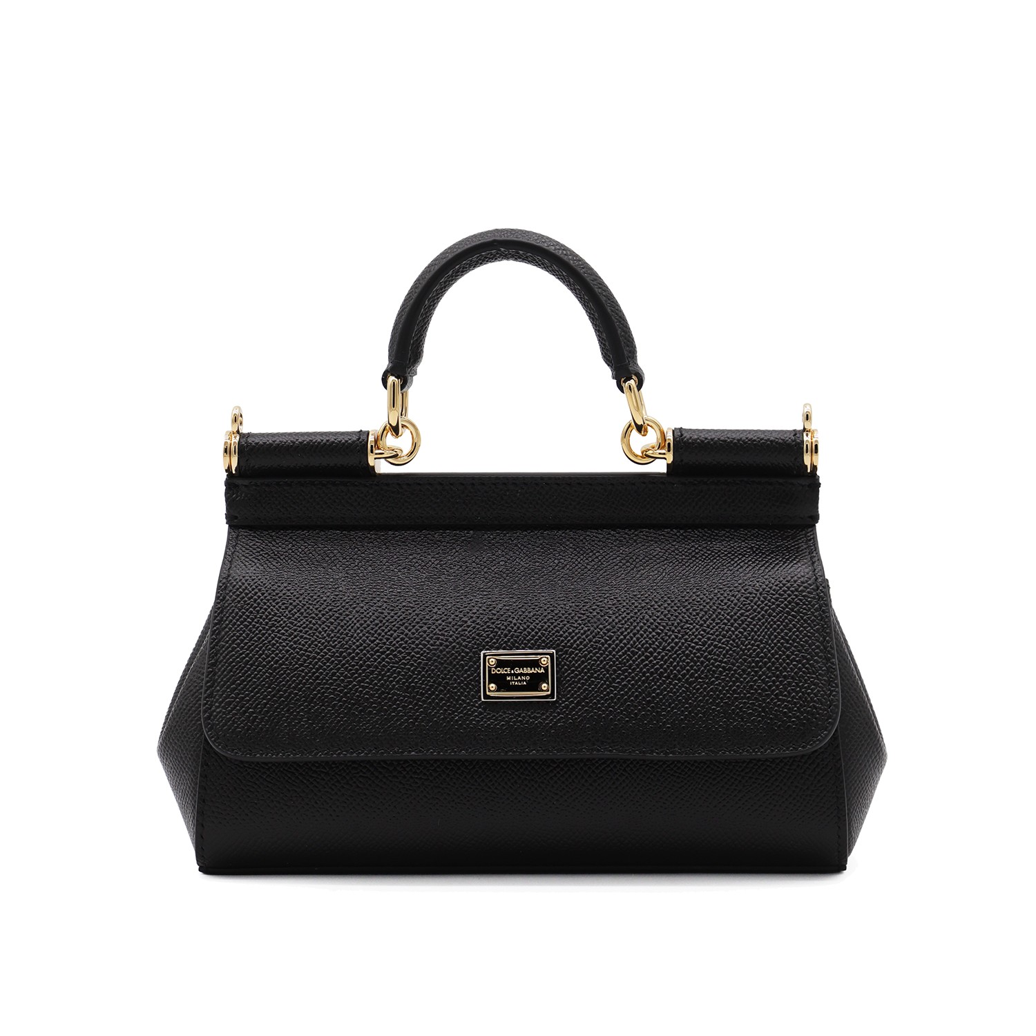 Black leather Sicily small top handle bag from Dolce & Gabbana featuring top handle, gold tone metal hardware, gold tone logo plaque, removable and adjustable shoulder strap, main compartment and flap with magnetic closure.