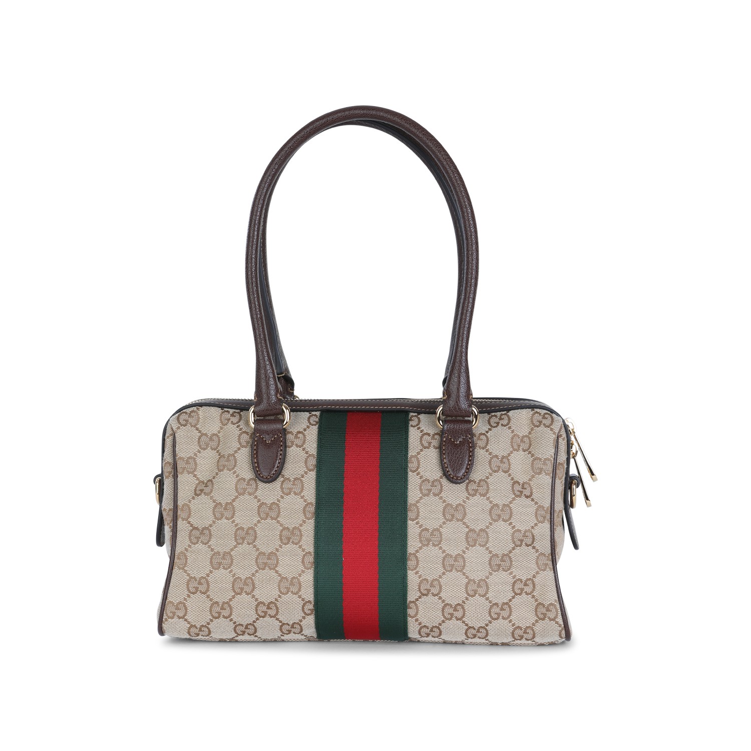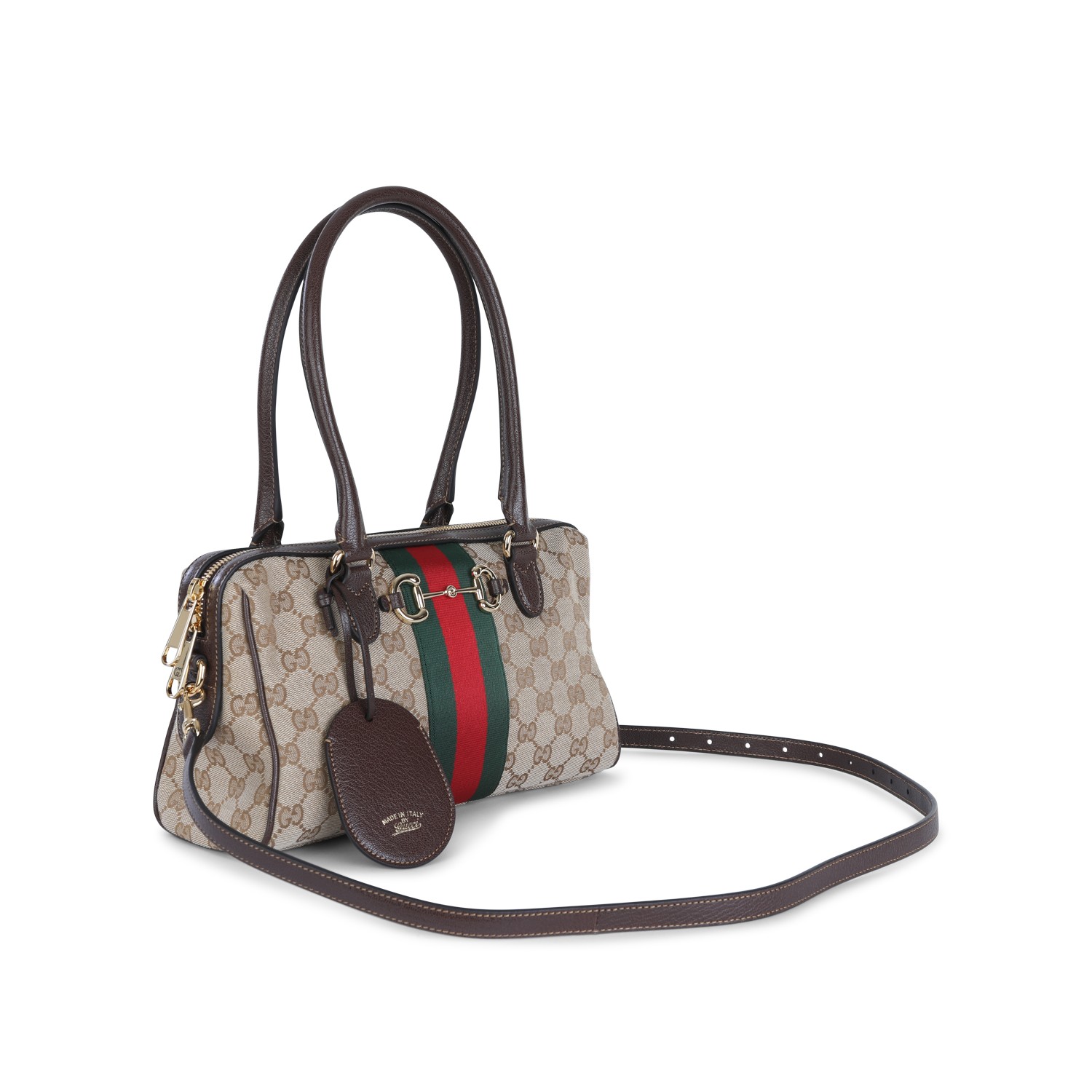 Beige Horsbit Web small top handle bag from Gucci featuring all-over GG texture, leather trims, gold tone hardware, Web band details, adjustable and removable shoulder strap, branded leather tag, double zip fastening and main compartment.