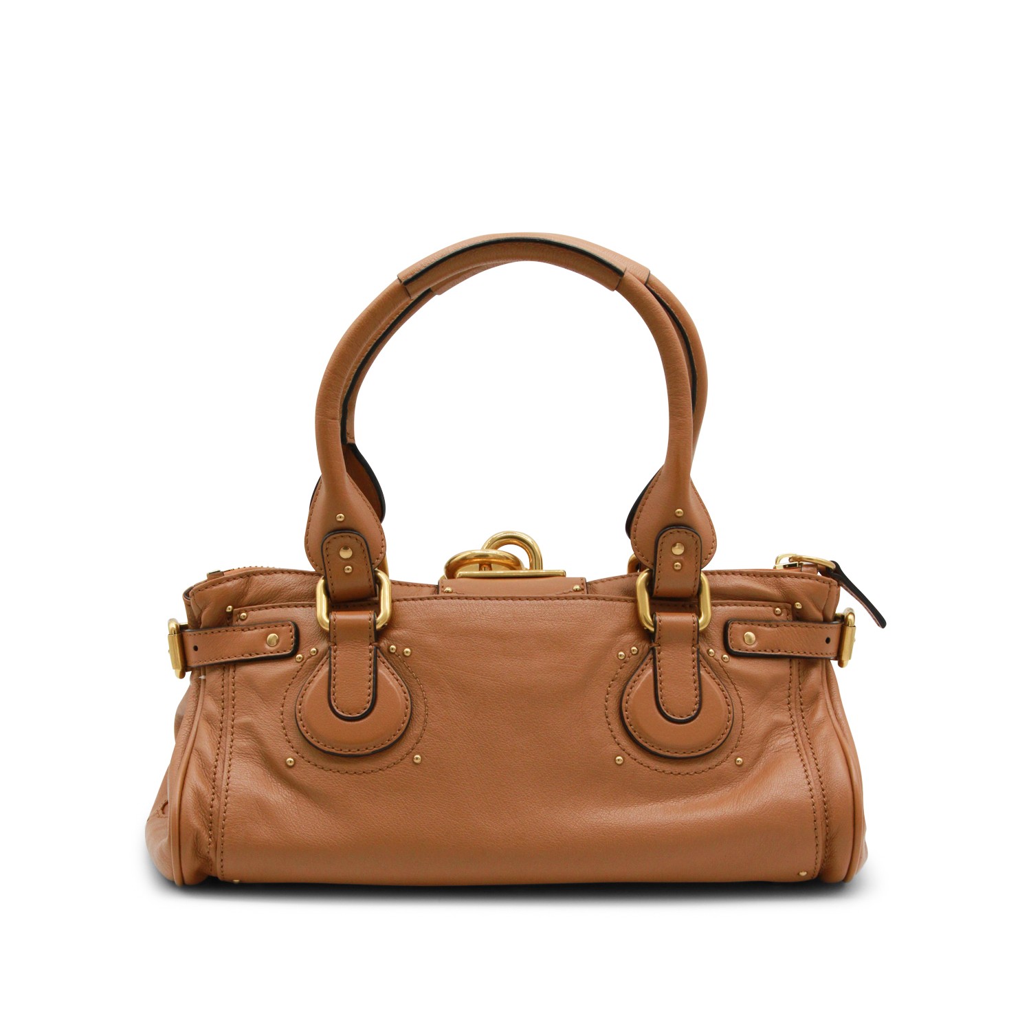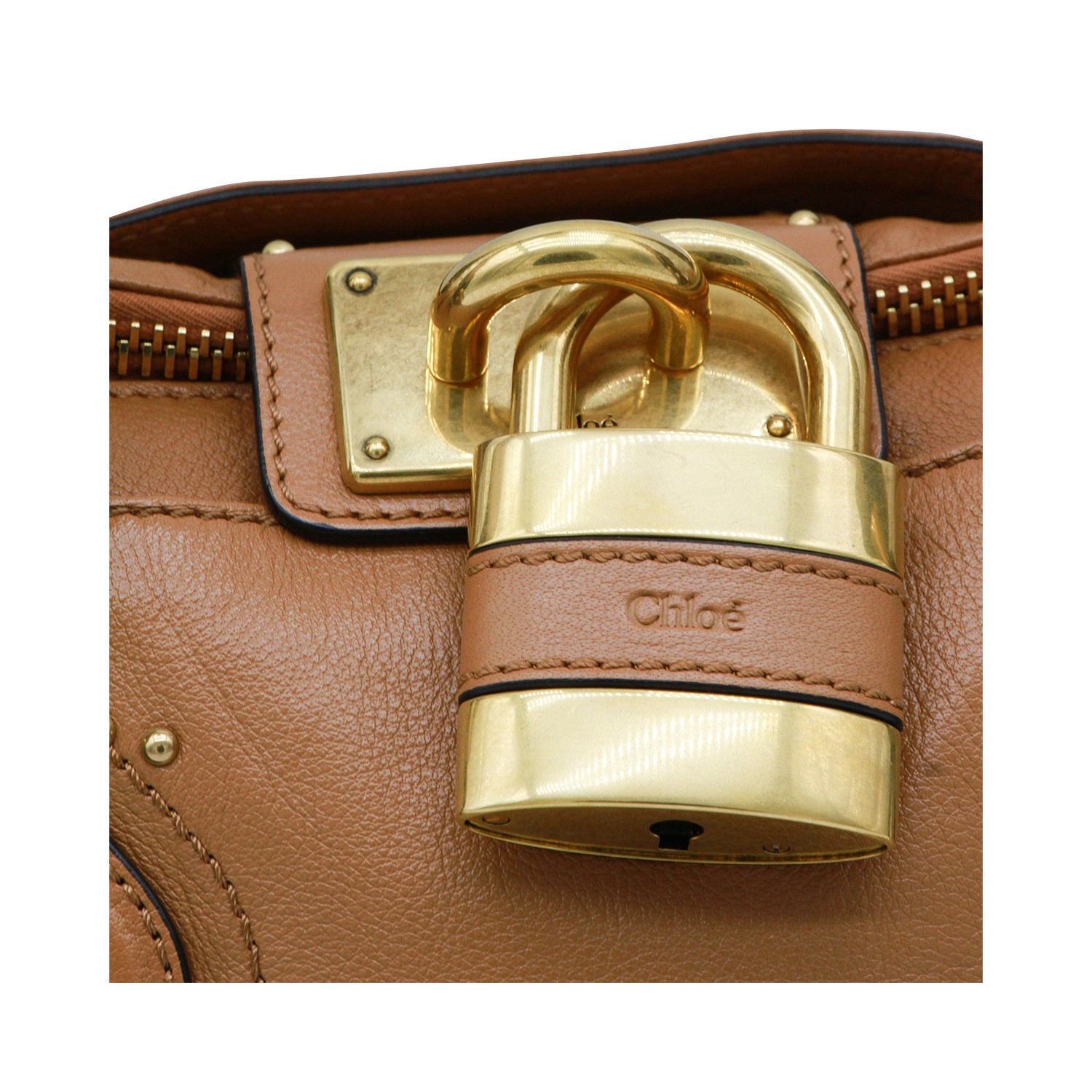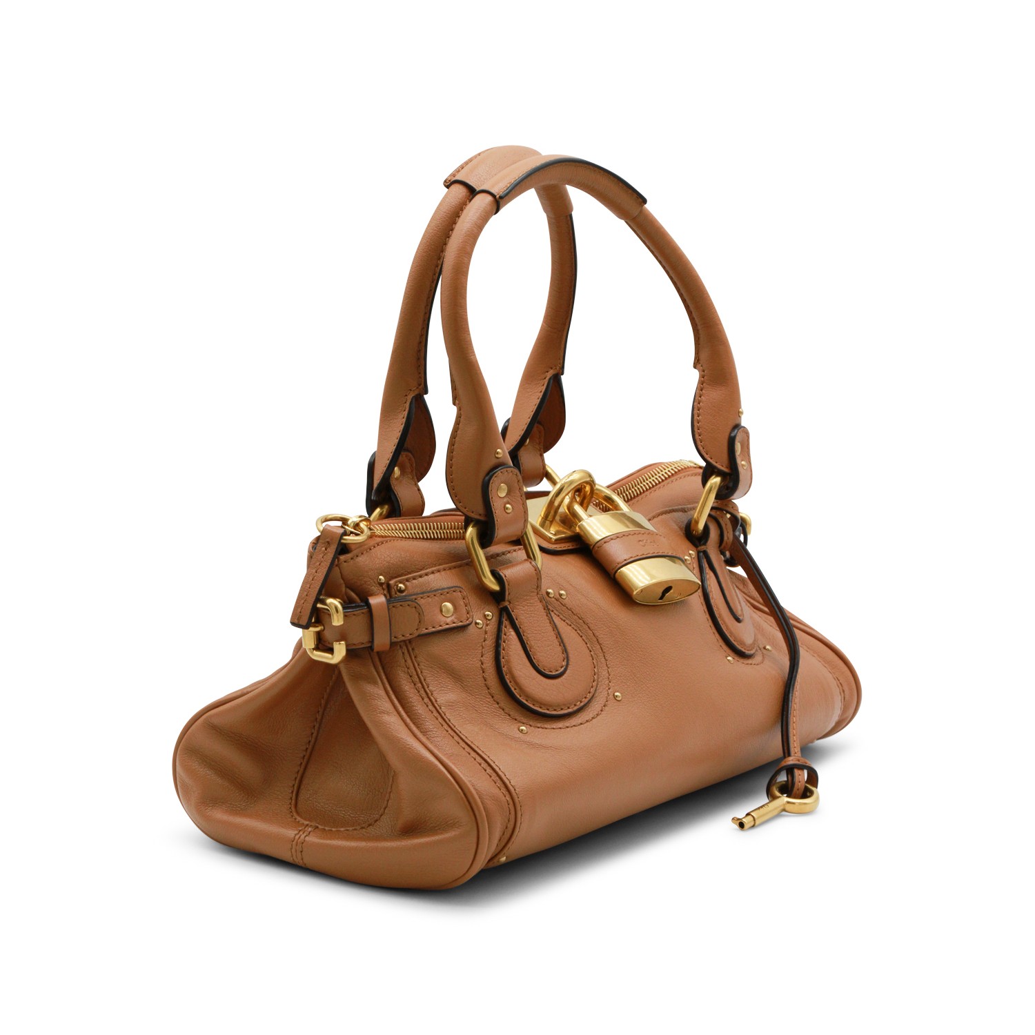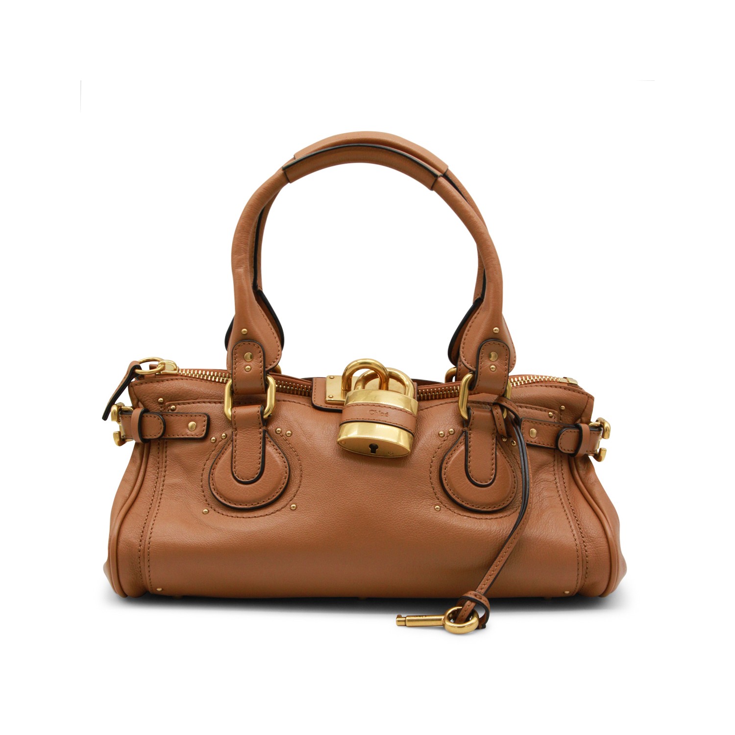 Brown leather Paddington top handle bag from Chlofeaturing top handle, gold tone hardware, zip fastening, padlonck pendant with logo, main compartment and internal flat pockets.