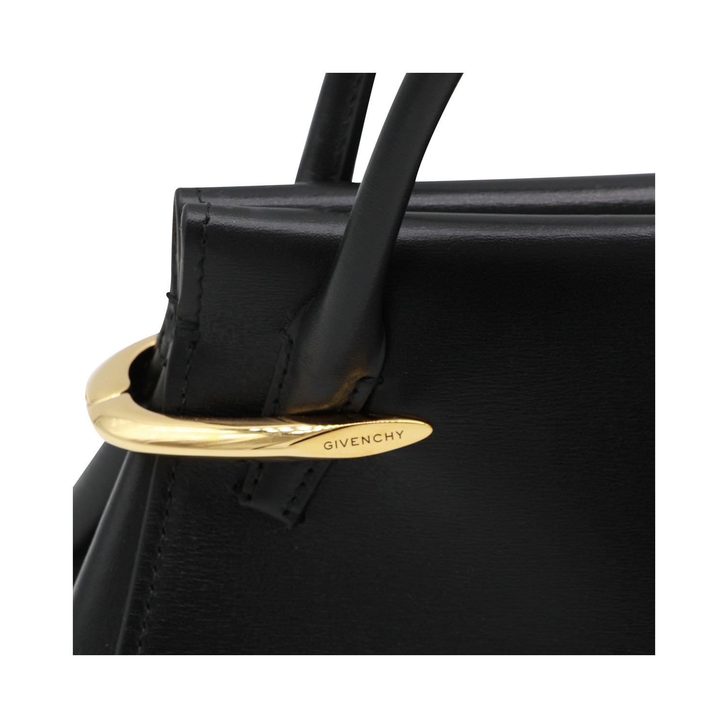 Black leather Pinch mini top handle bag from Givenchy featuring handles, calf leather, magnetic closure, gold tone hardware and main compartment.