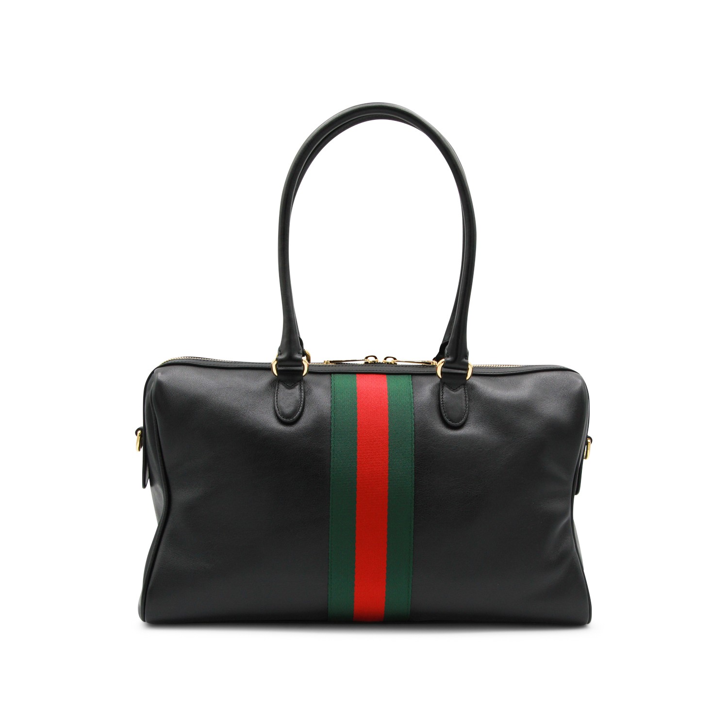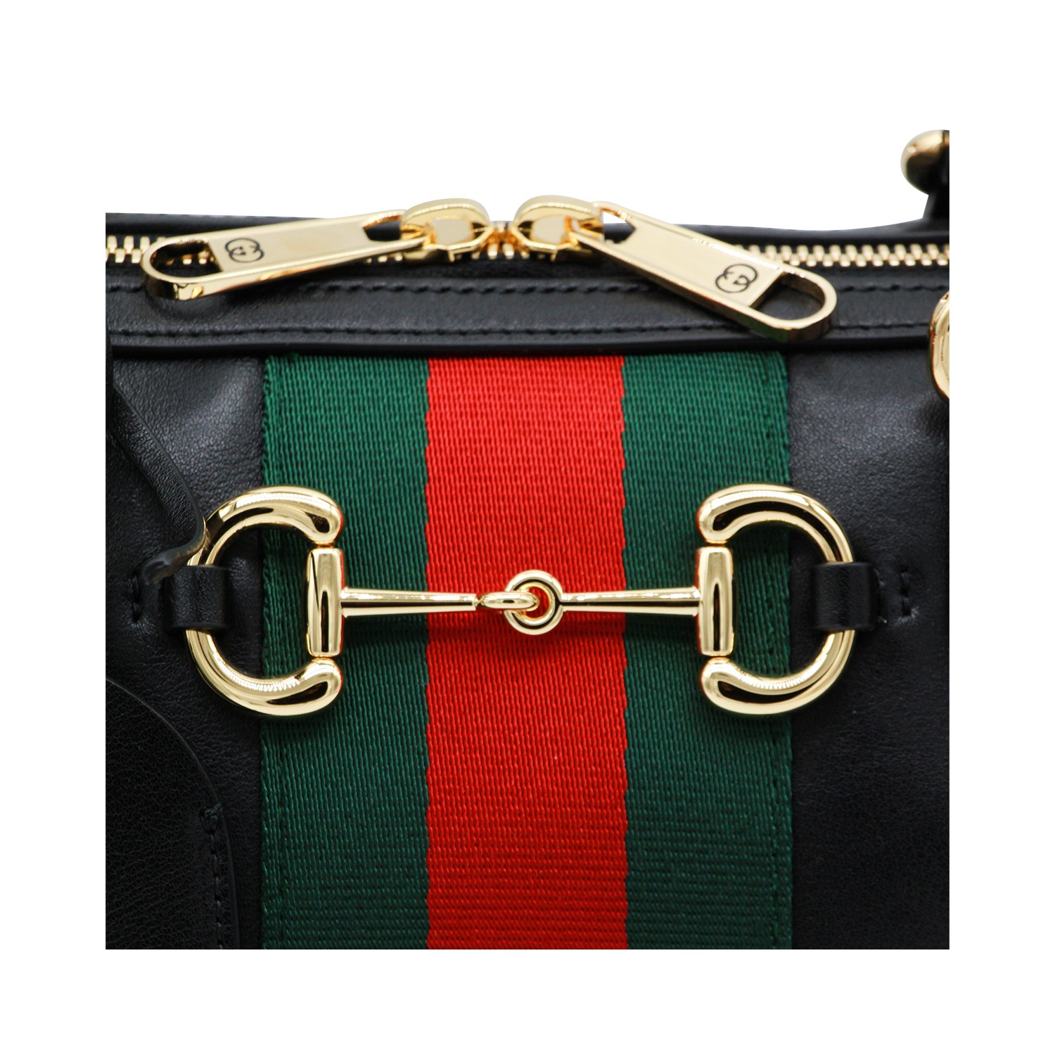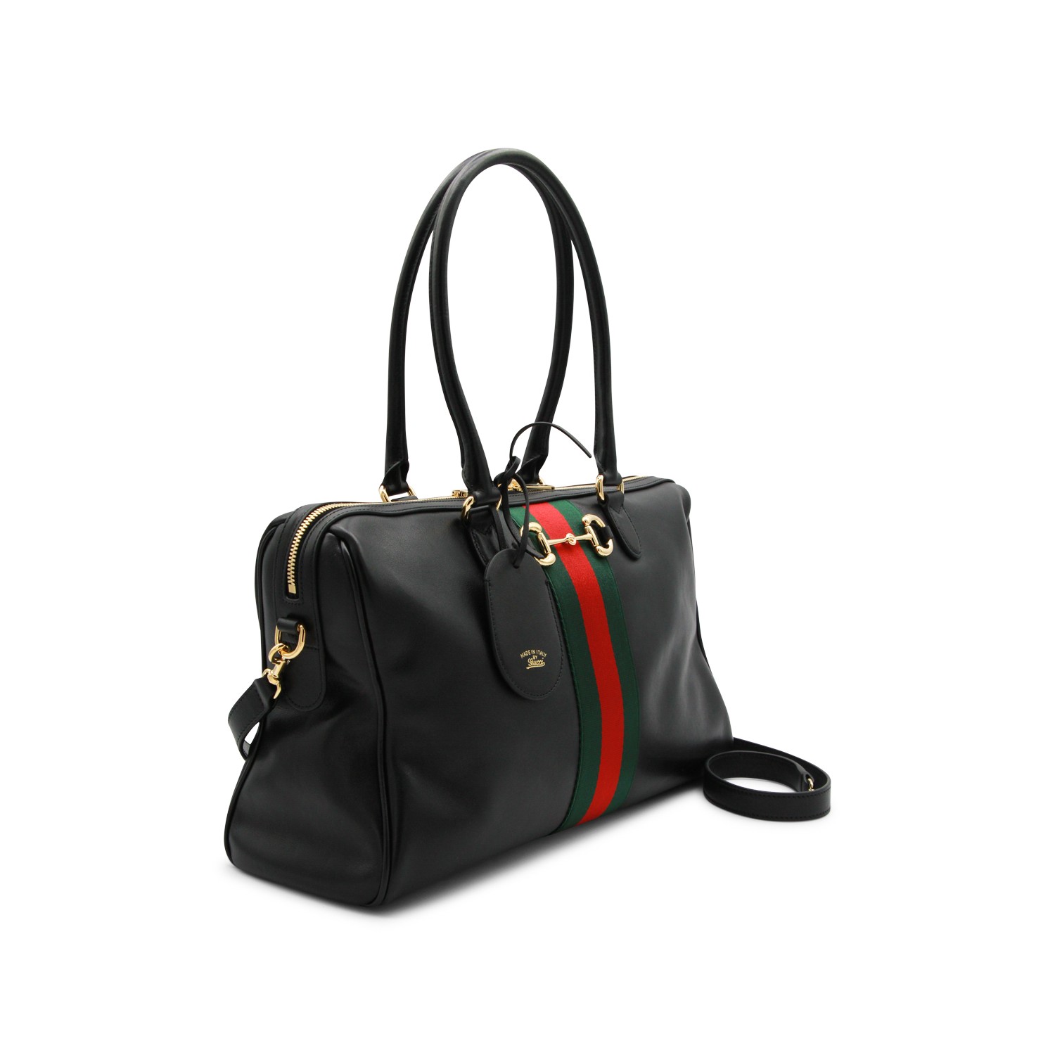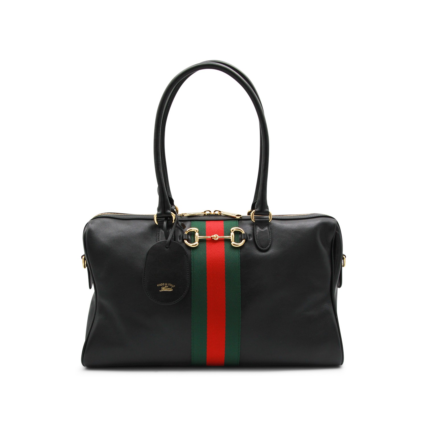 Black leather Horsbit medium top handle bag from Gucci featuring top handles, gold tone hardware, Web band detail, double zip fastening, leather tag, main compartment and pockets.
