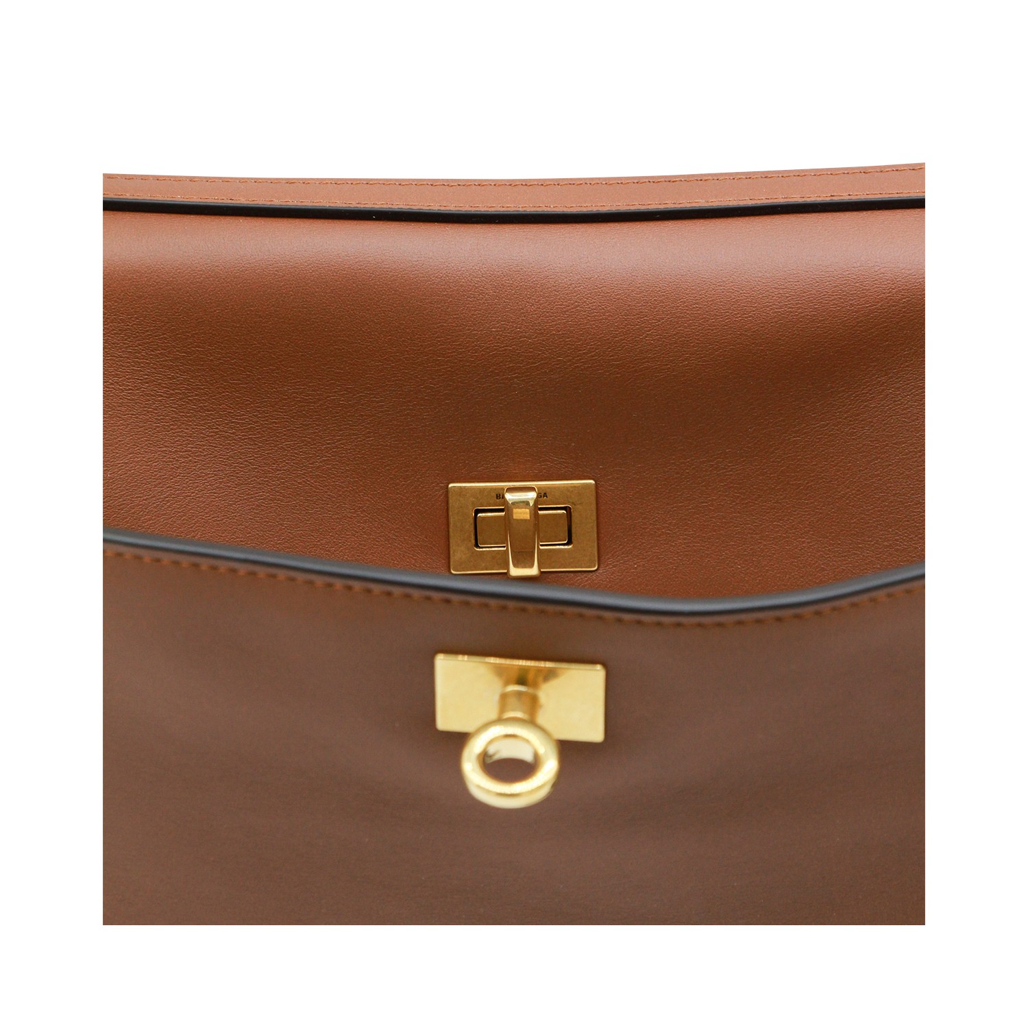 Brown Rodeo M leather top handle bag from Balenciaga featuring top handle, upper fastening with zip, gold tone hardware, inside pocket and strap.
