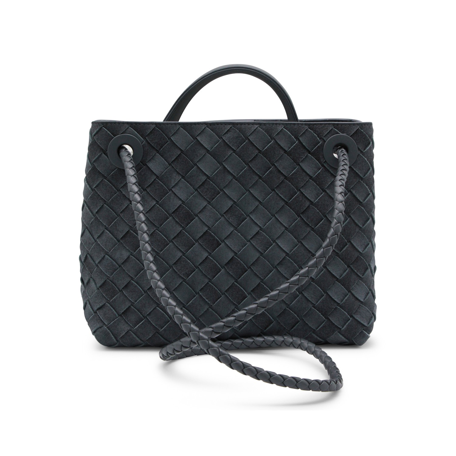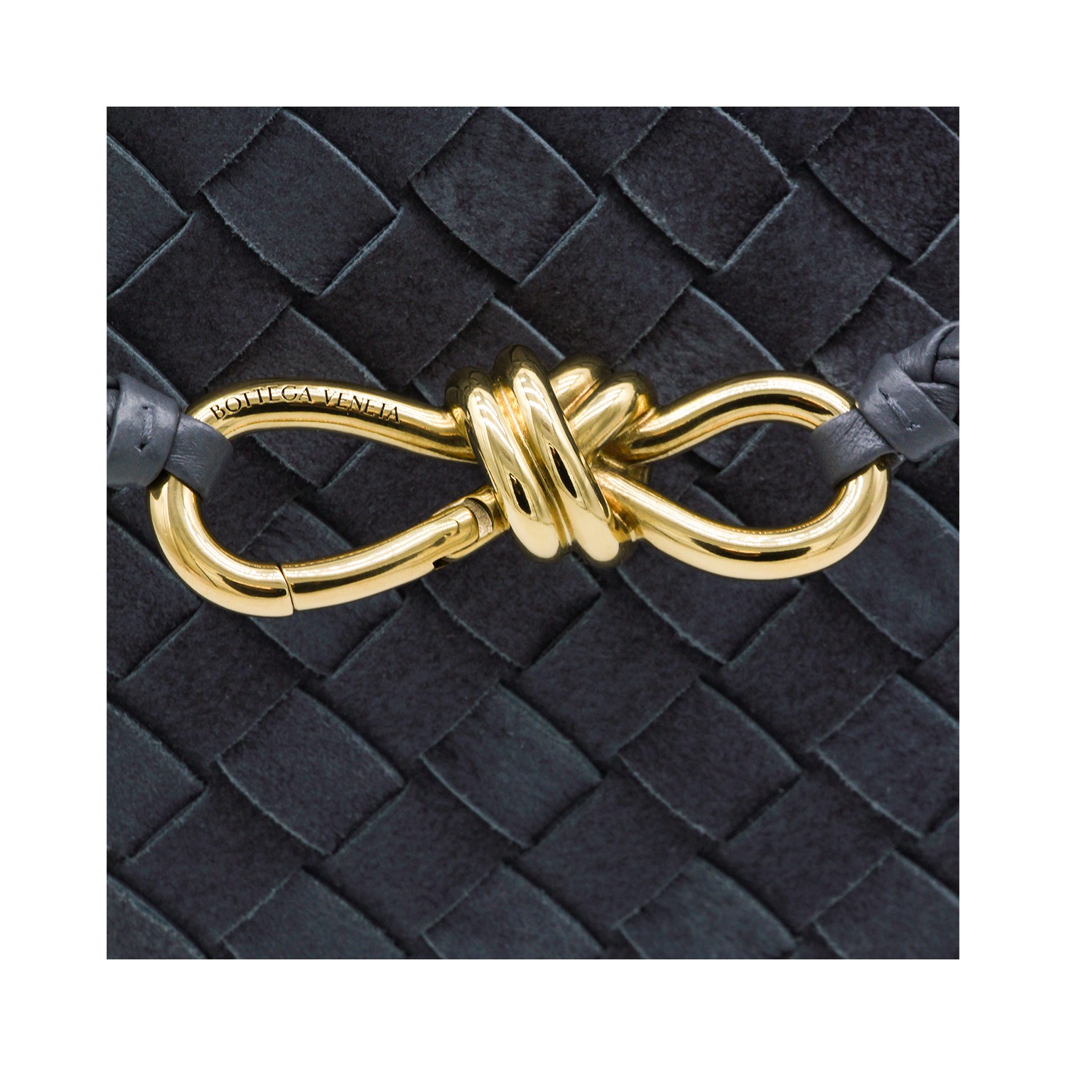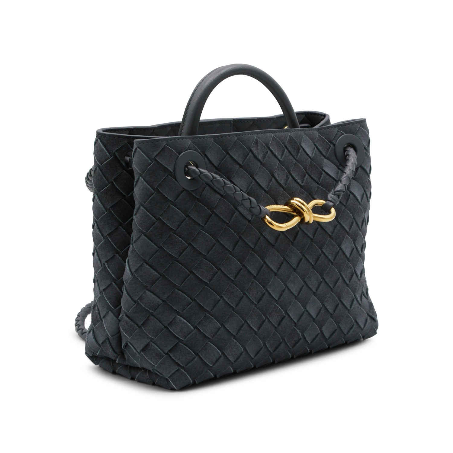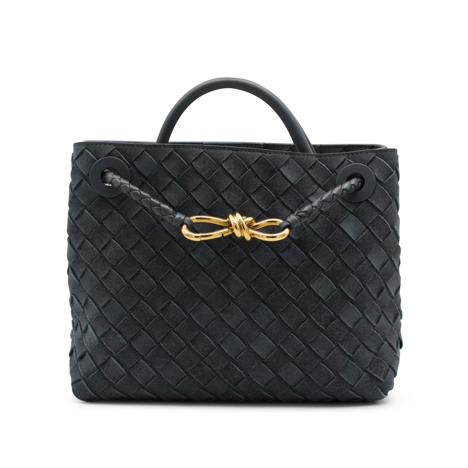 Blue leather Andiamo bag from Bottega Veneta featuring leather top handle, all-over Intreccio motig, gold metal knot detail, sliding shoulder strap, upper closure, main compartment and pocket.