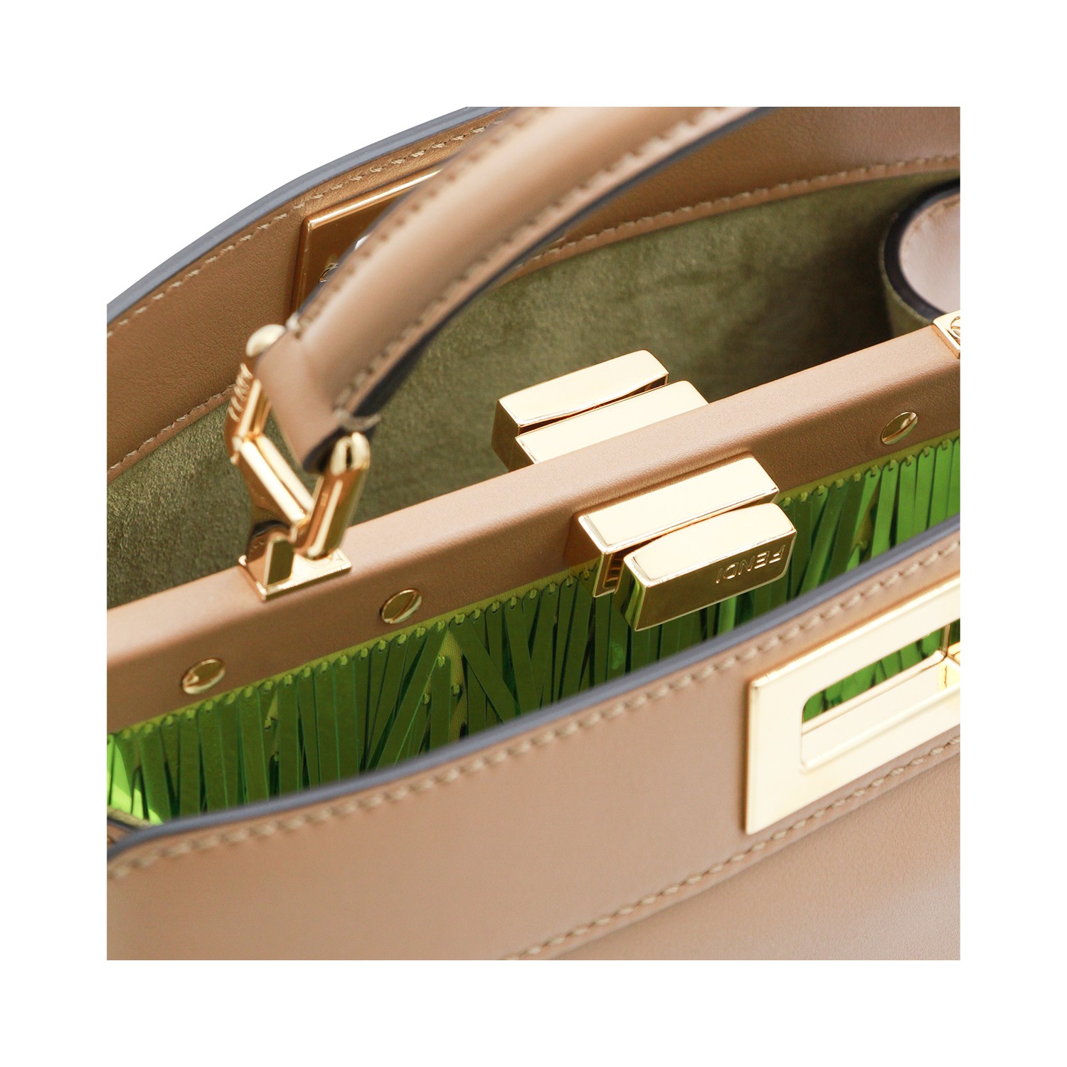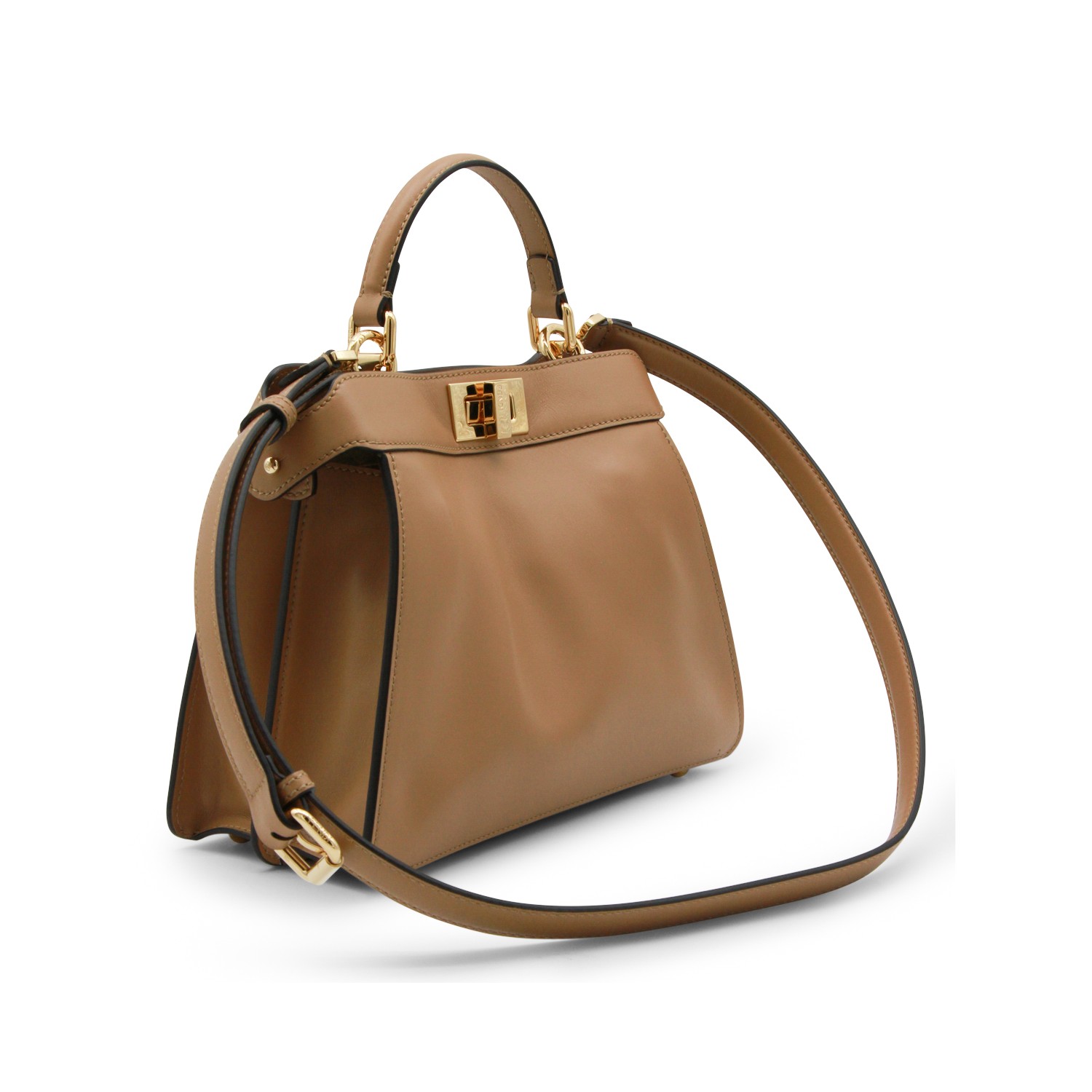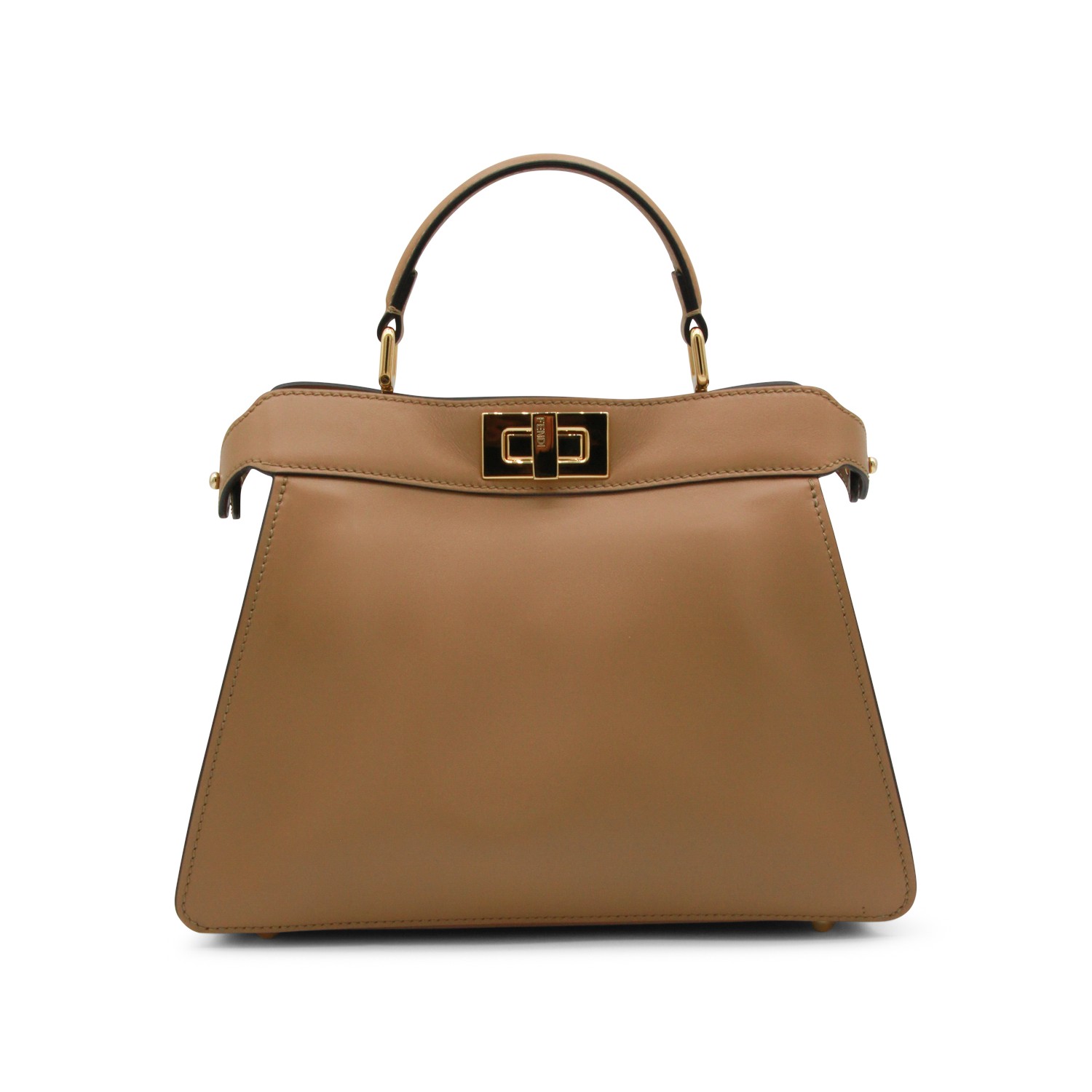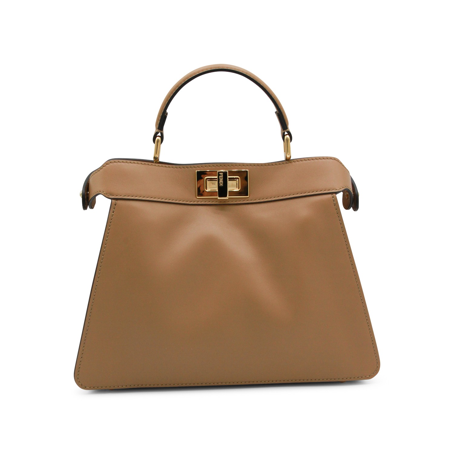 Beige leather Pekaboo ISeeU small top handle bag from Fendi featuring top handle, gold tone hardware, adjustable and removable shoulder strap, twist lock closure, compartments and pockets.