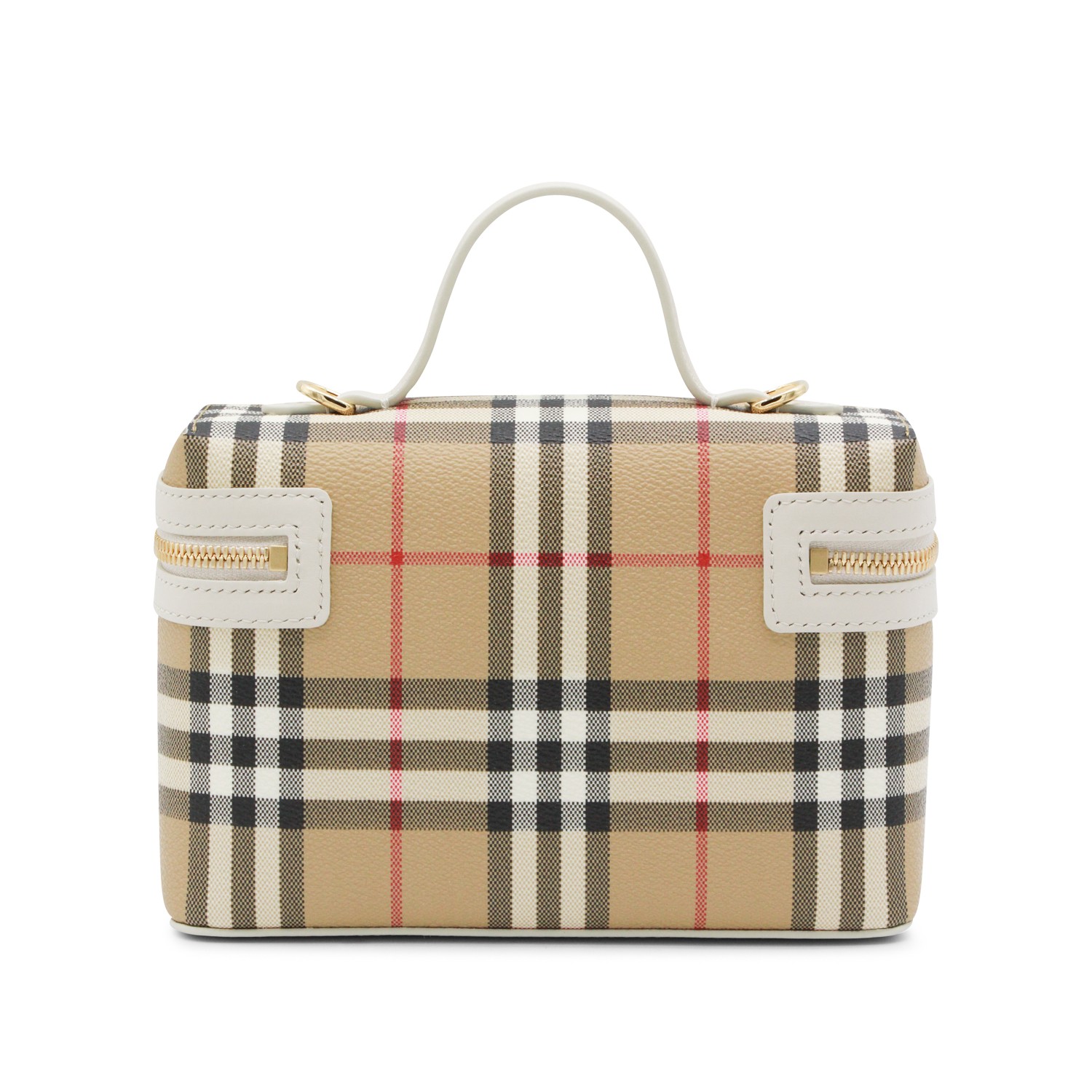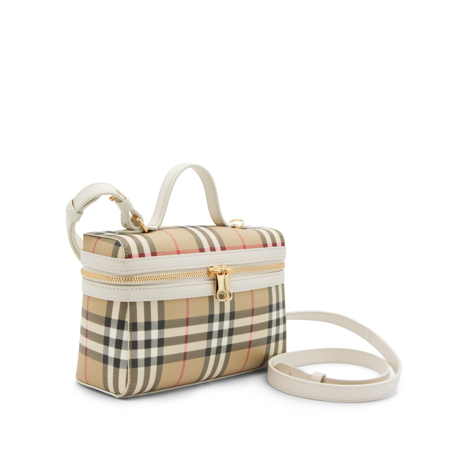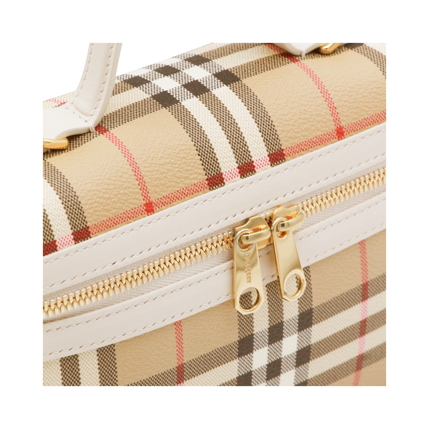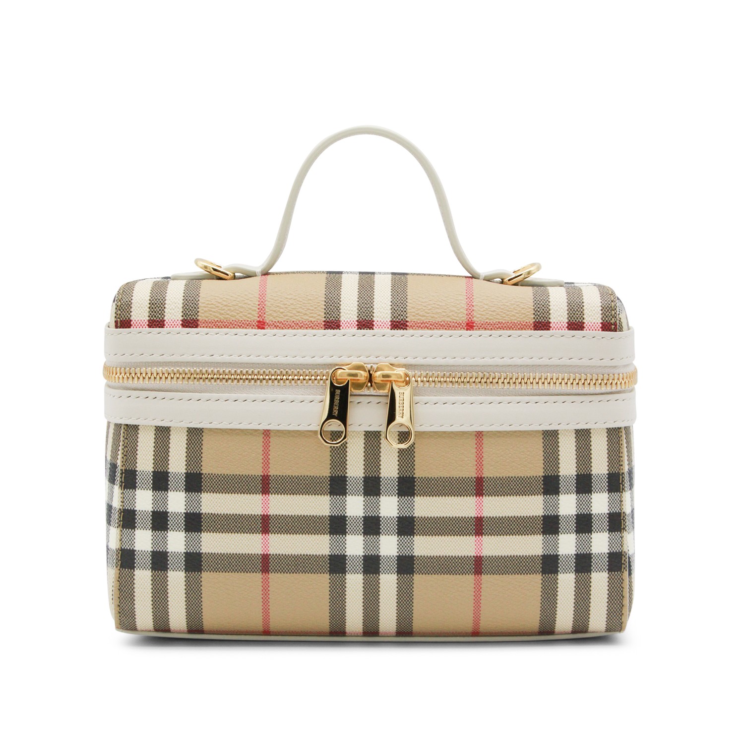 Beige top handle bag from Burberry featuring fixed leather top handle, double zip closure, removable and adjustable shoulder strap, all-over Burberry check and main compartment.