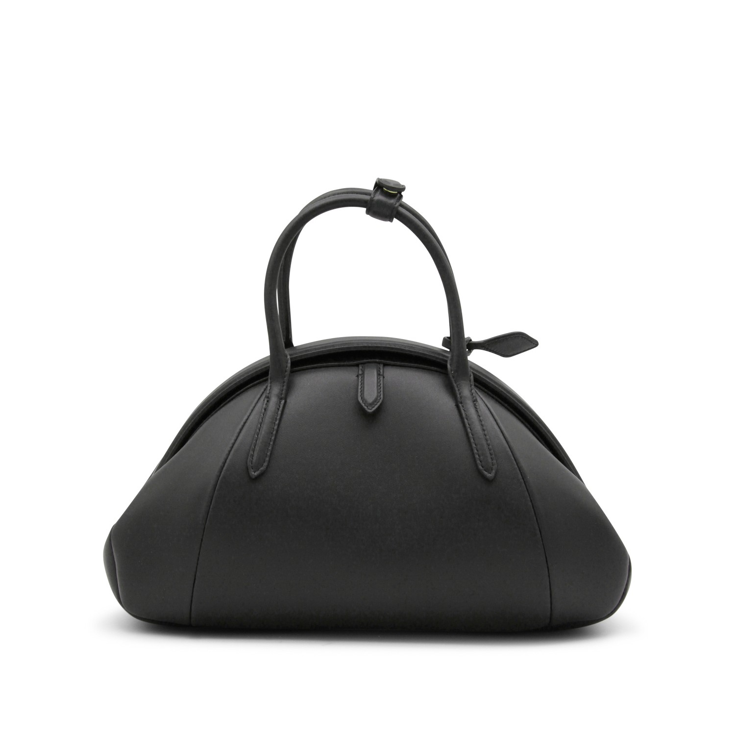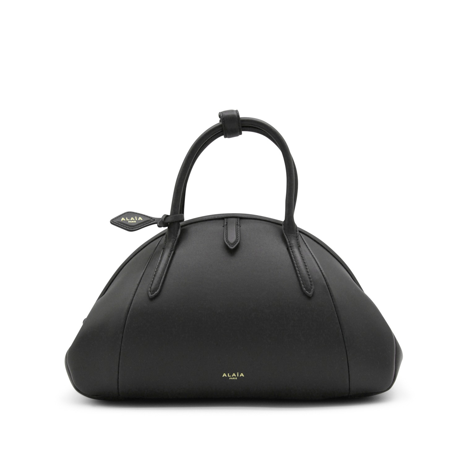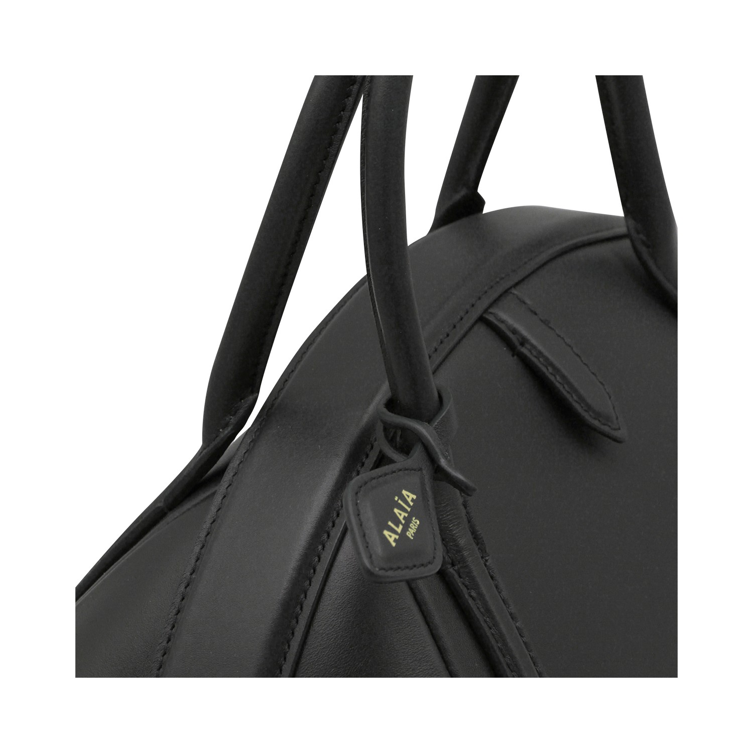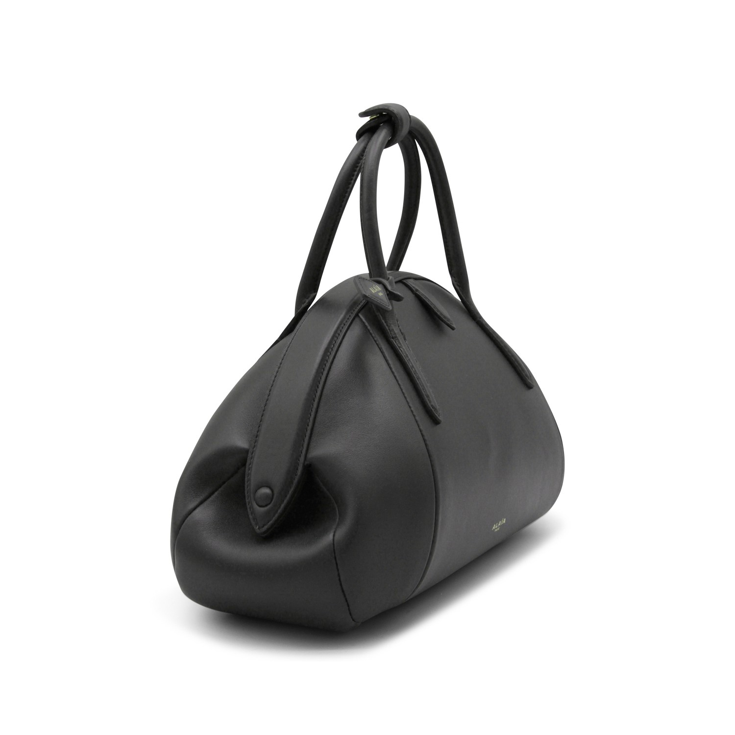 Black leather Purse top handle bag from Alaia featuring round lines, tubolar handles, branded tag, upper closure and main compartment.