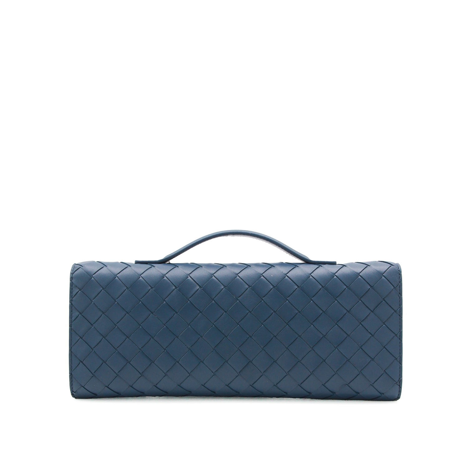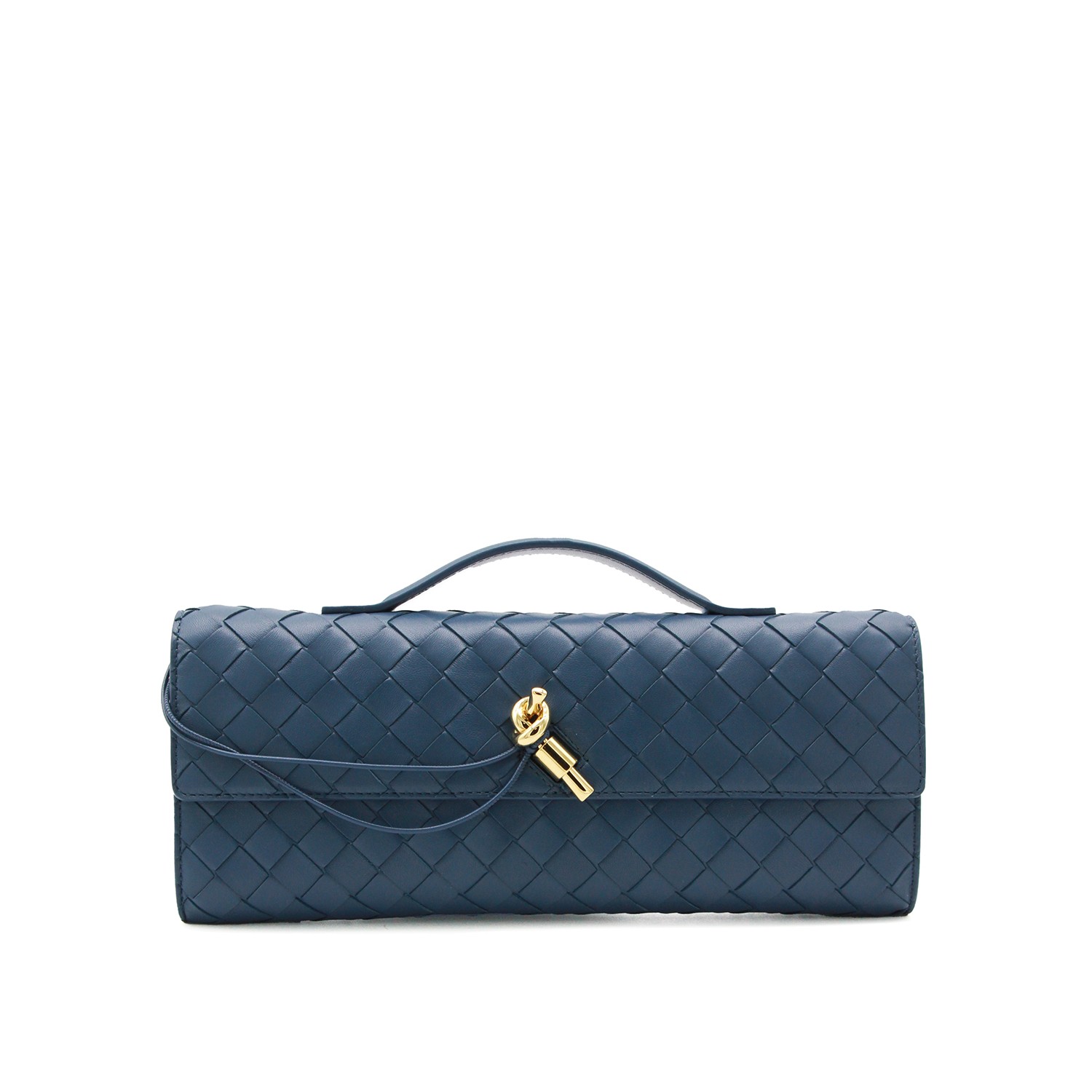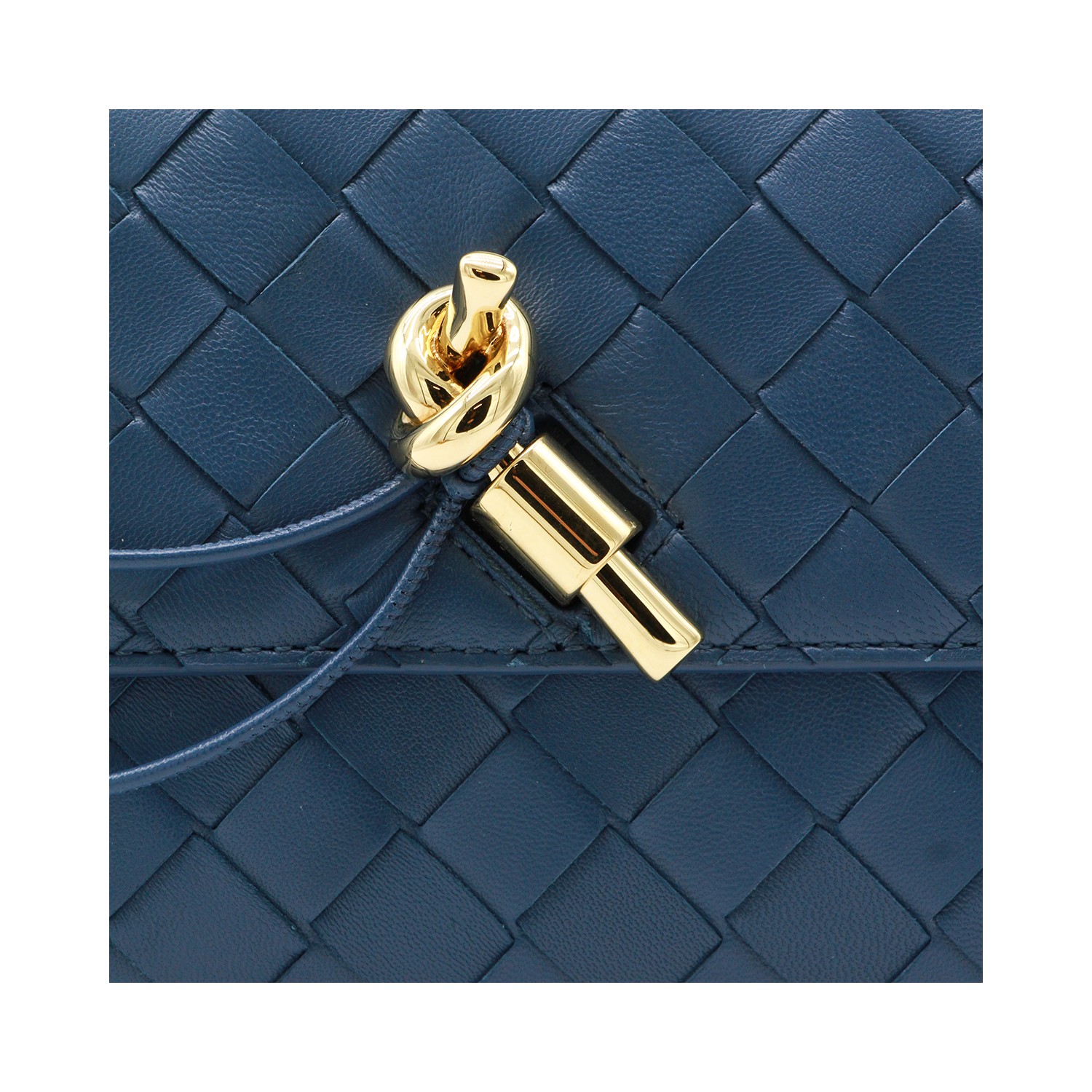Blue leather Andiamo bag from Bottega Veneta featuring rectangular shape, all-over Intreccio motif, foldover top with metal knot closure, top handle, main compartment and card slots.