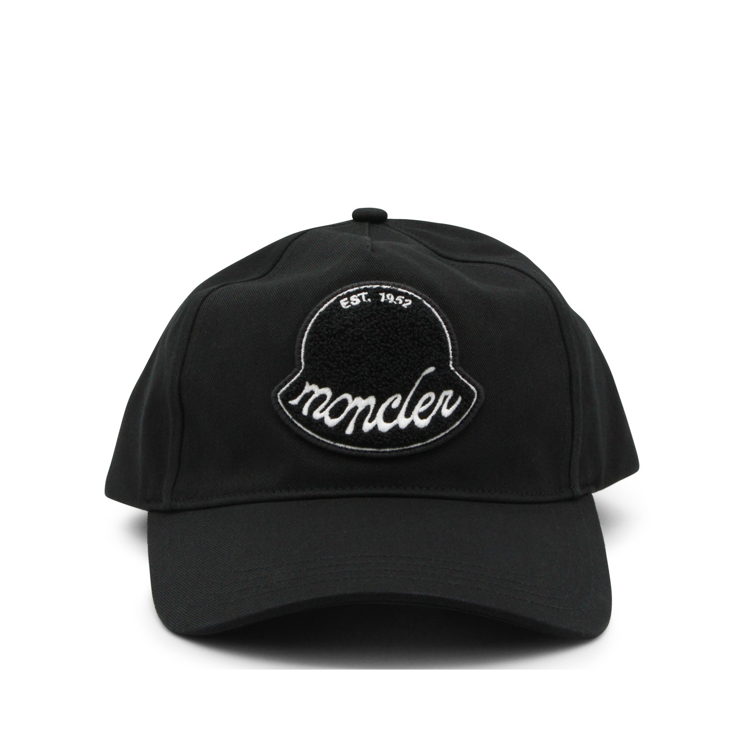 Black cotton baseball cap from Moncler featuring curved peak, logo patch and back adjustable closure.
