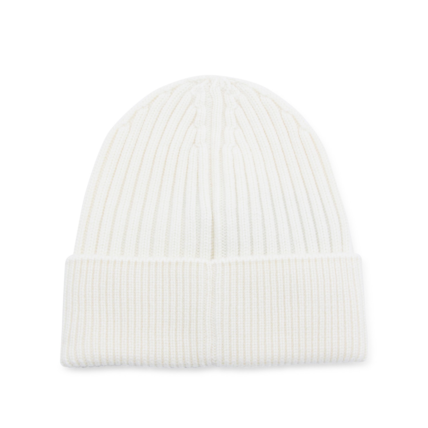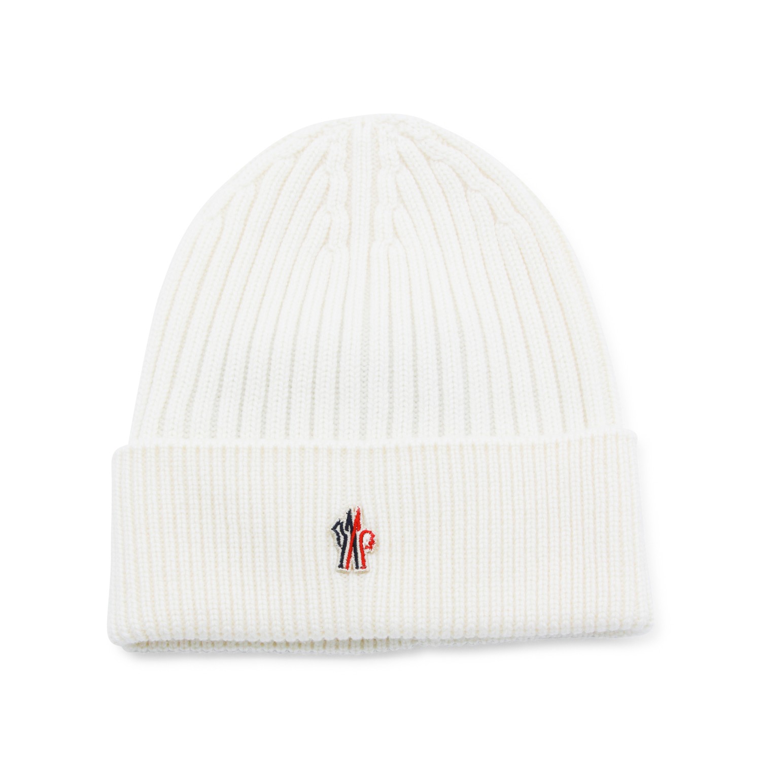 White cotton beanie from Moncler Grenoble featuring ribbed trim, logo patch and turn-up hem.