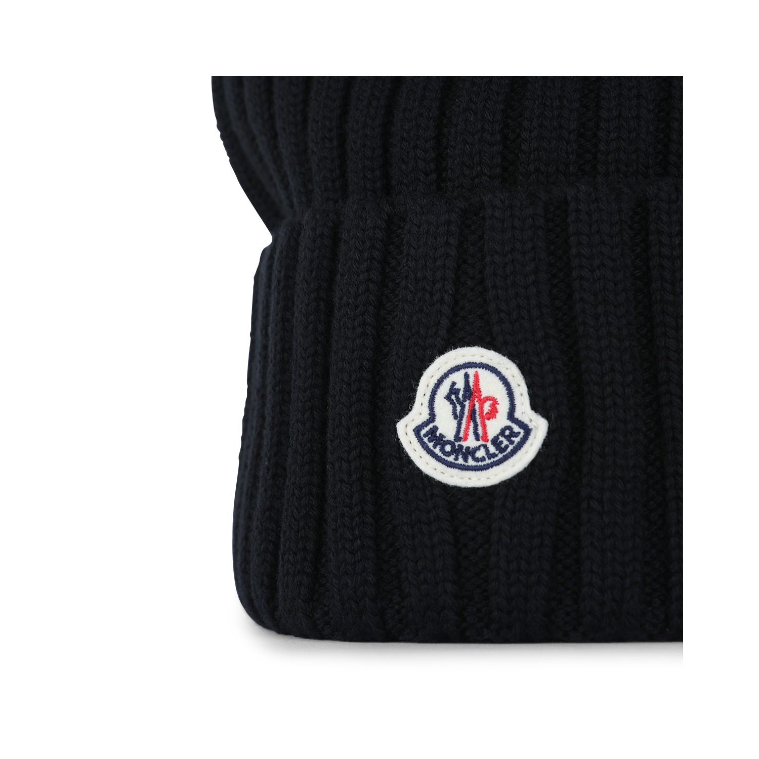 Black cashmere hat from Moncler featuring ribbed trim, logo patch and regular vestibility.
