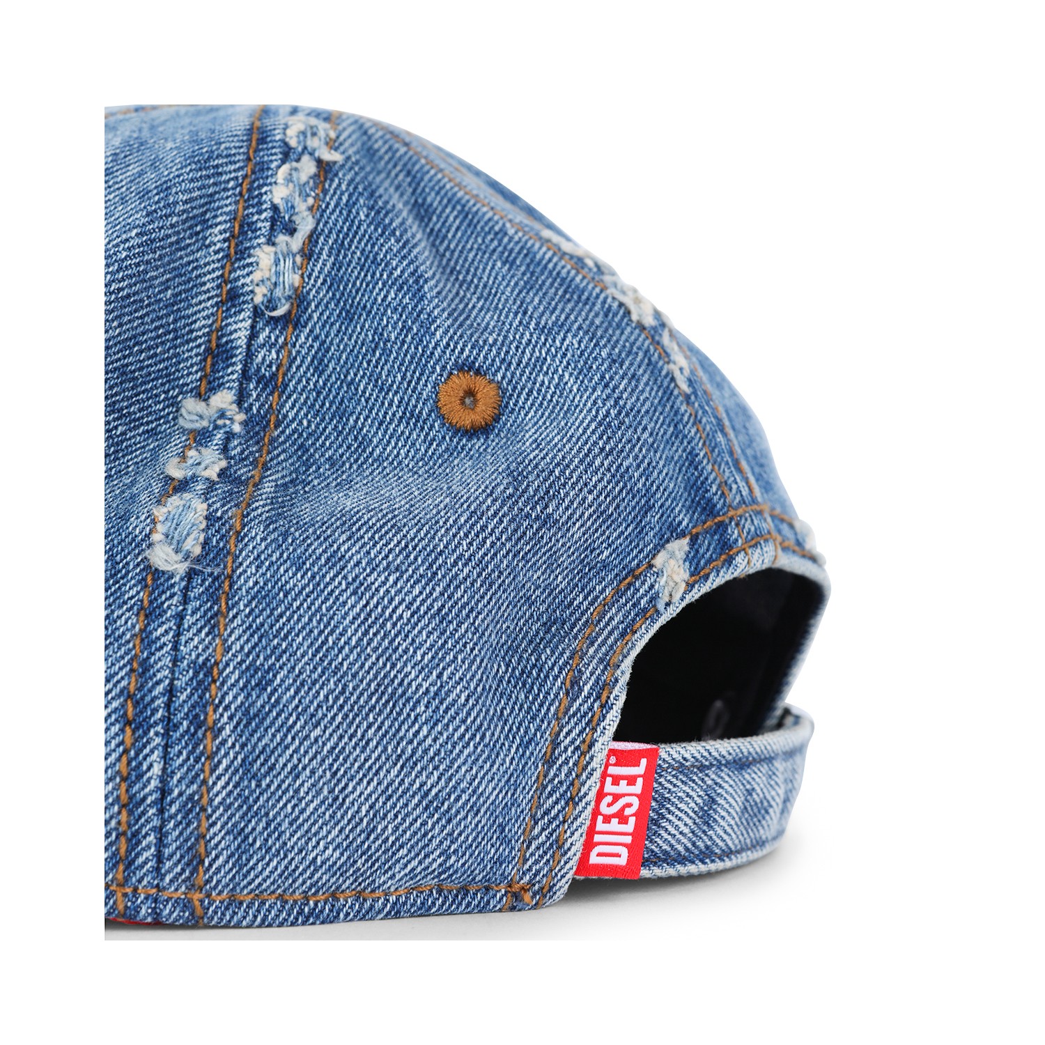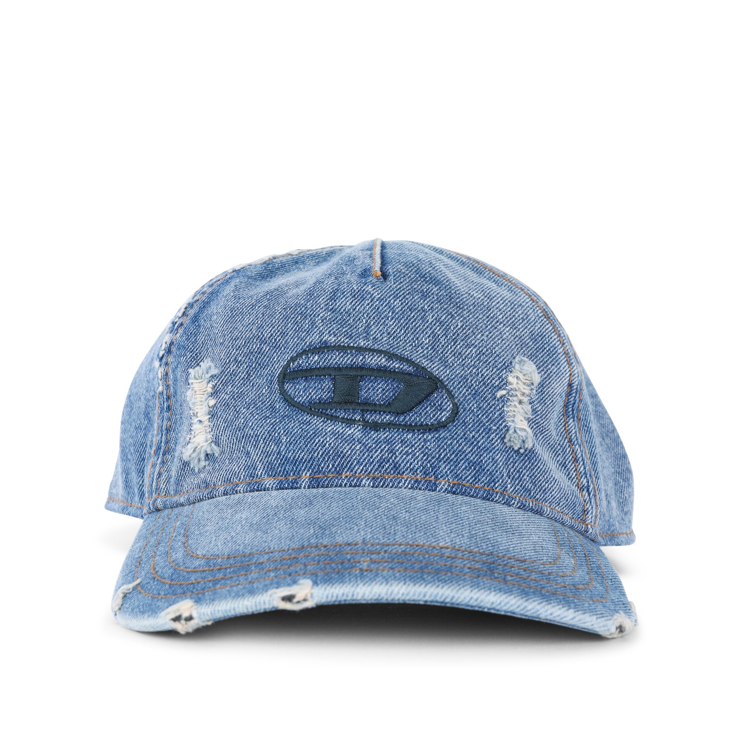 Blue denim baseball cap from Diesel featuring curved peak, embroidered logo and adjustable size.