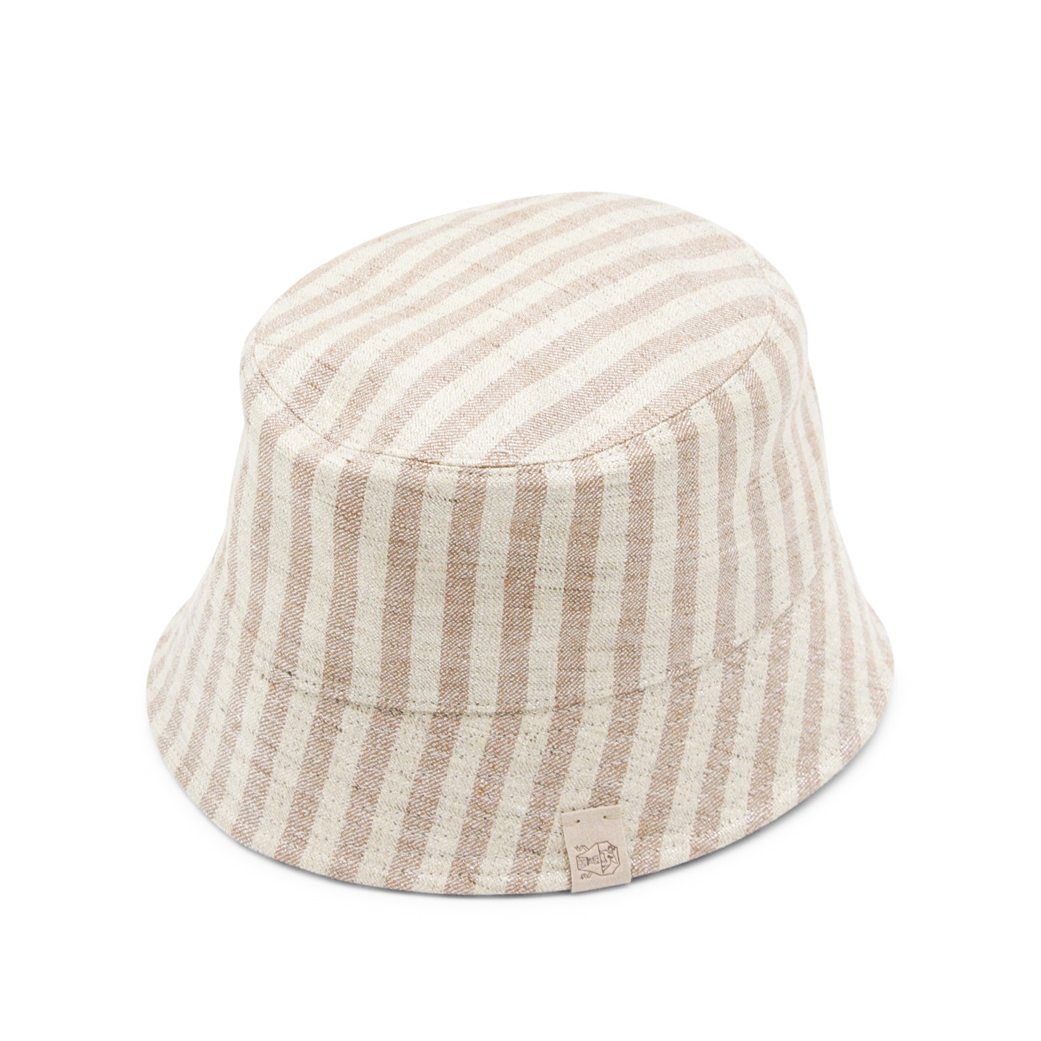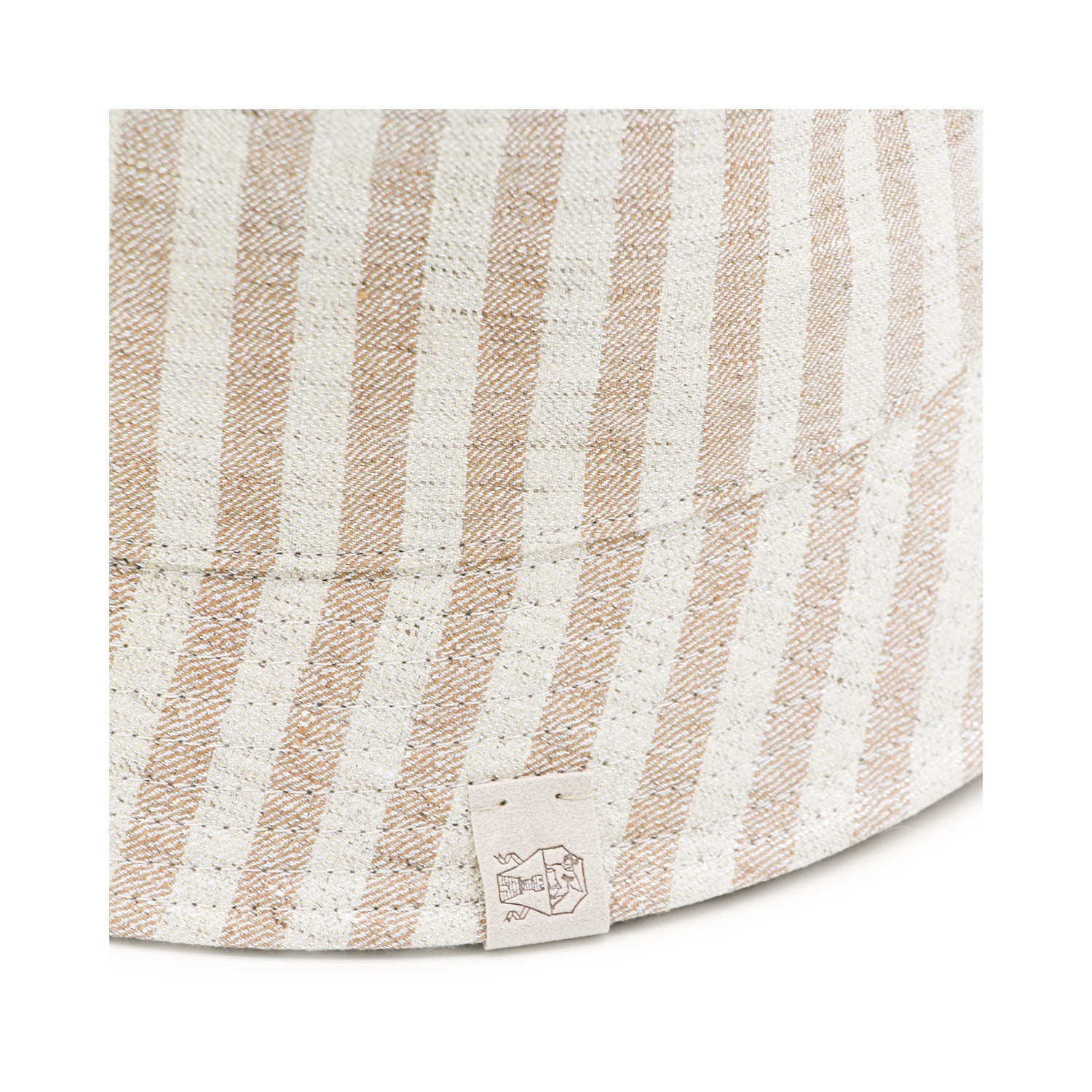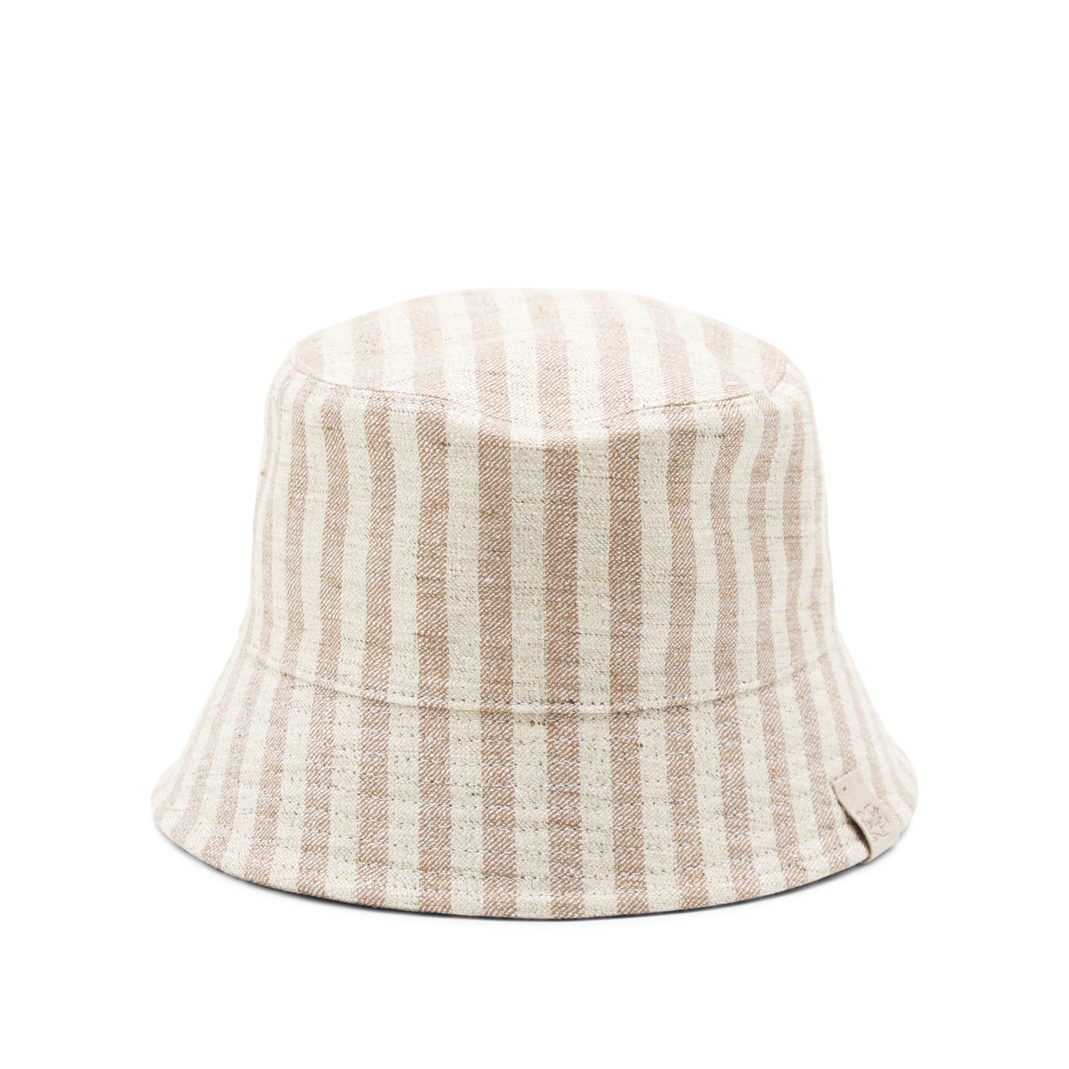 White and beige cotton stripe hat from Brunello Cucinelli featuring stripe motif, logo label and classic line.