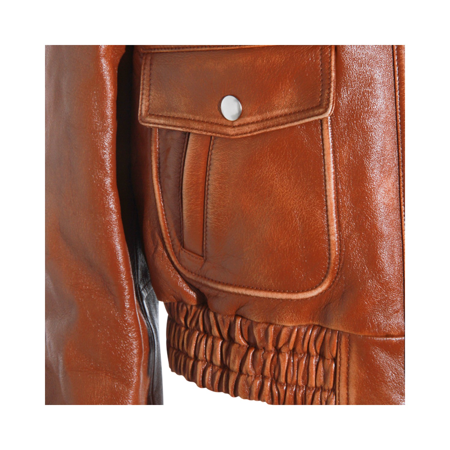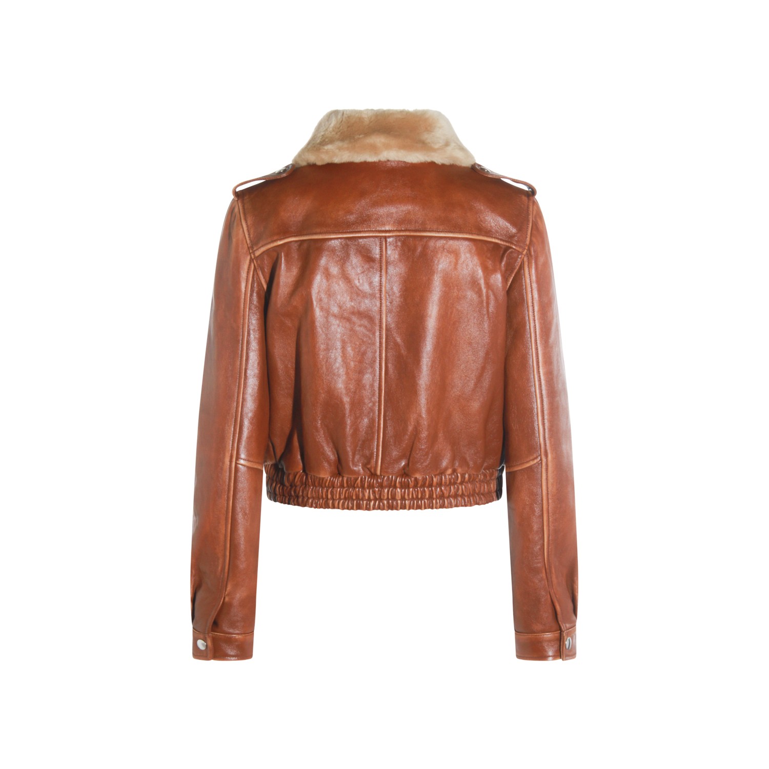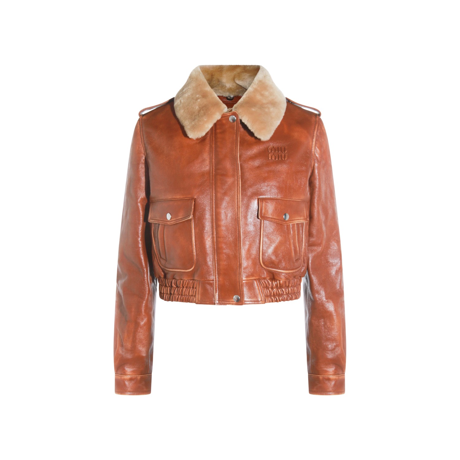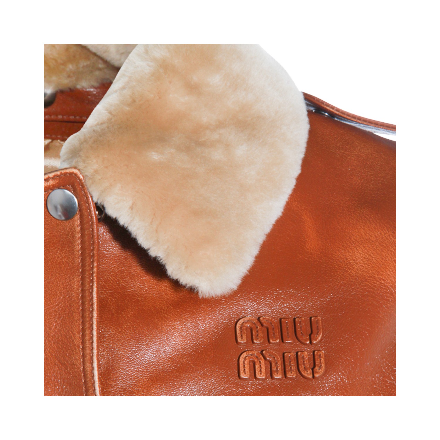 Brown leather jacket from Miu Miu featuring long sleeves, frontal fastening, shirt collar, pocket, ribbed hem and regular vestibility.