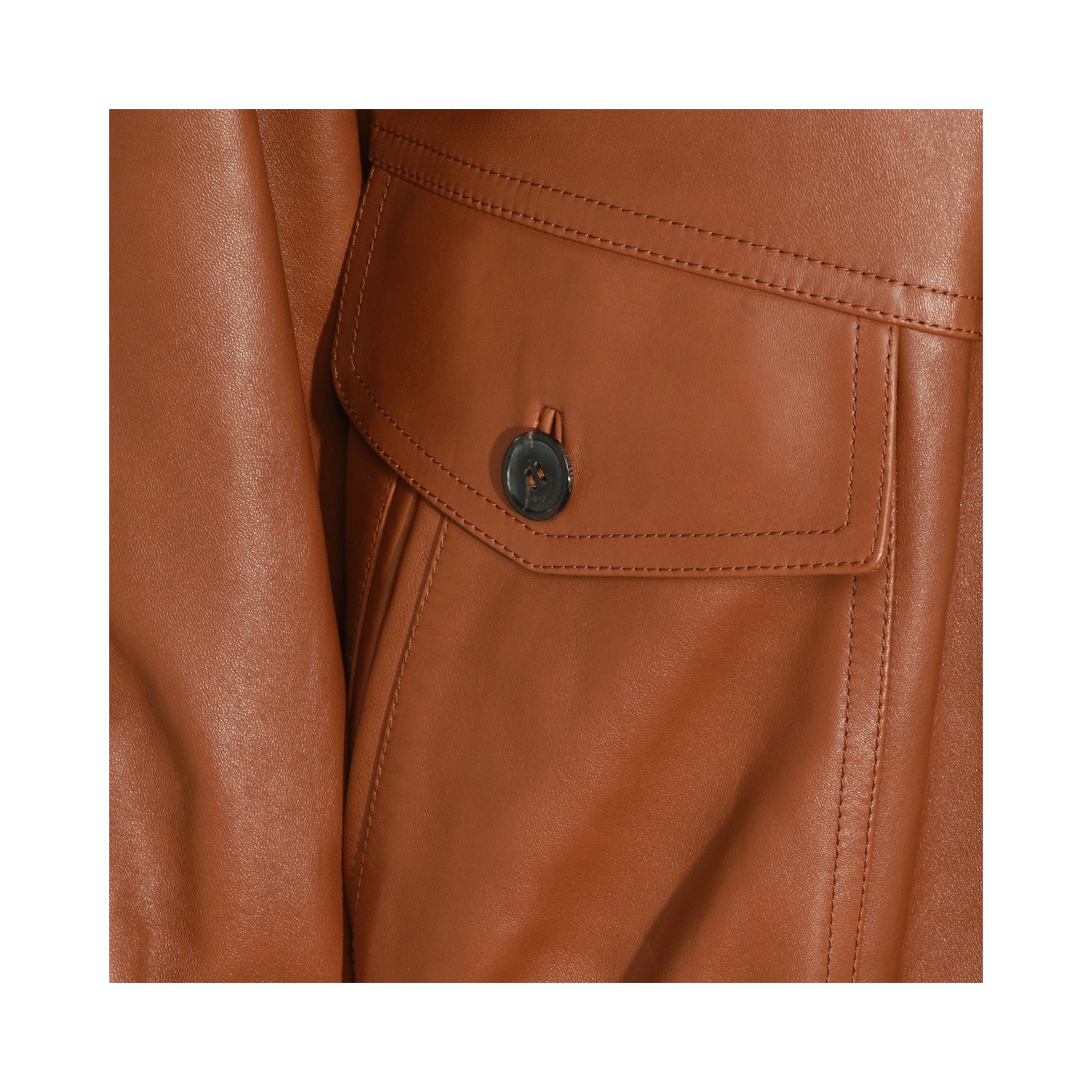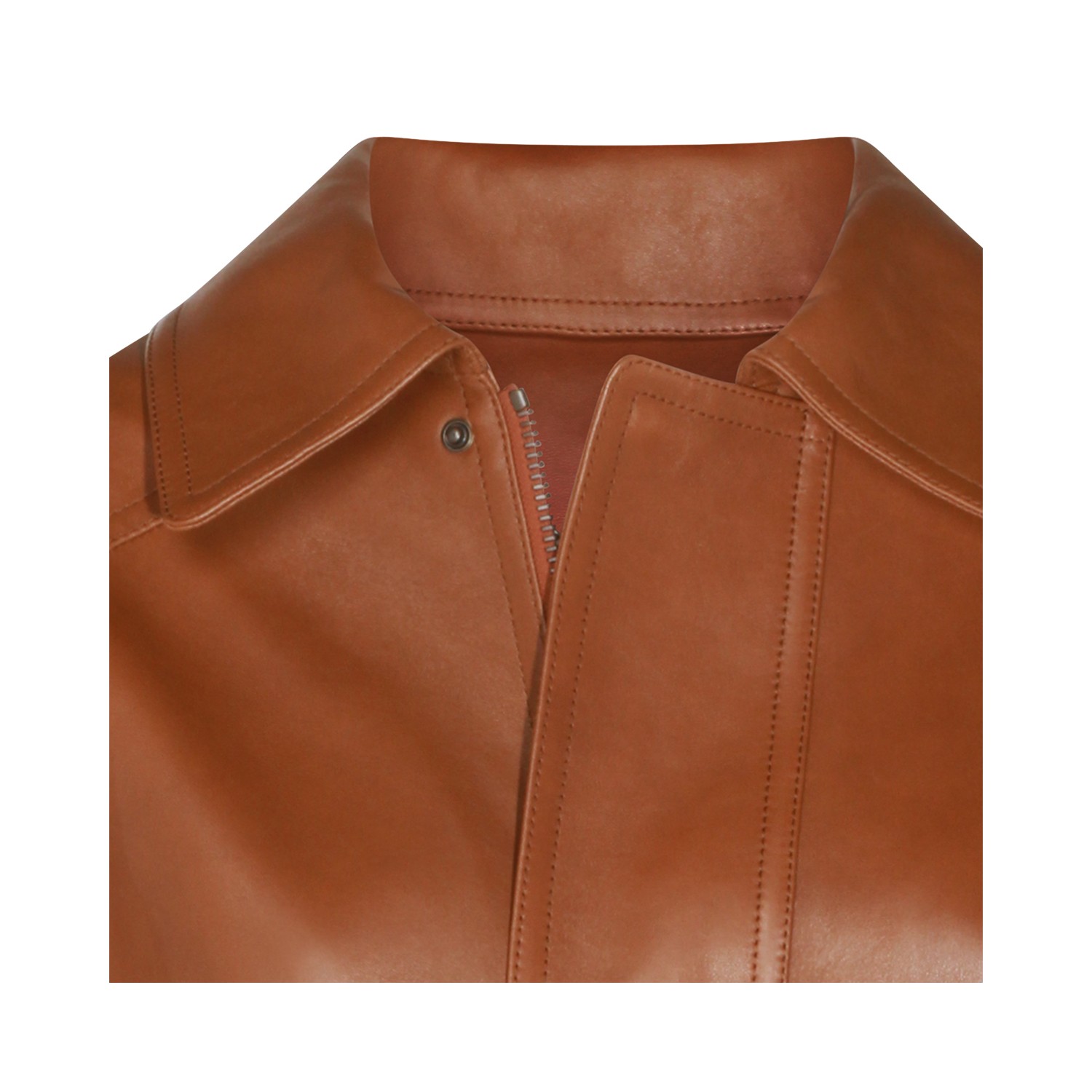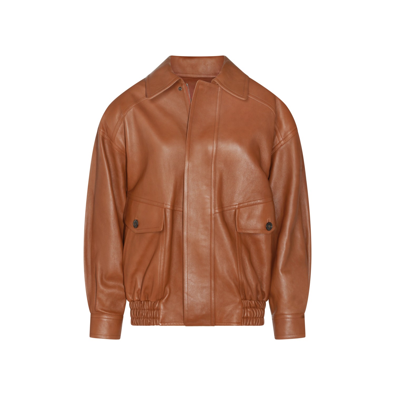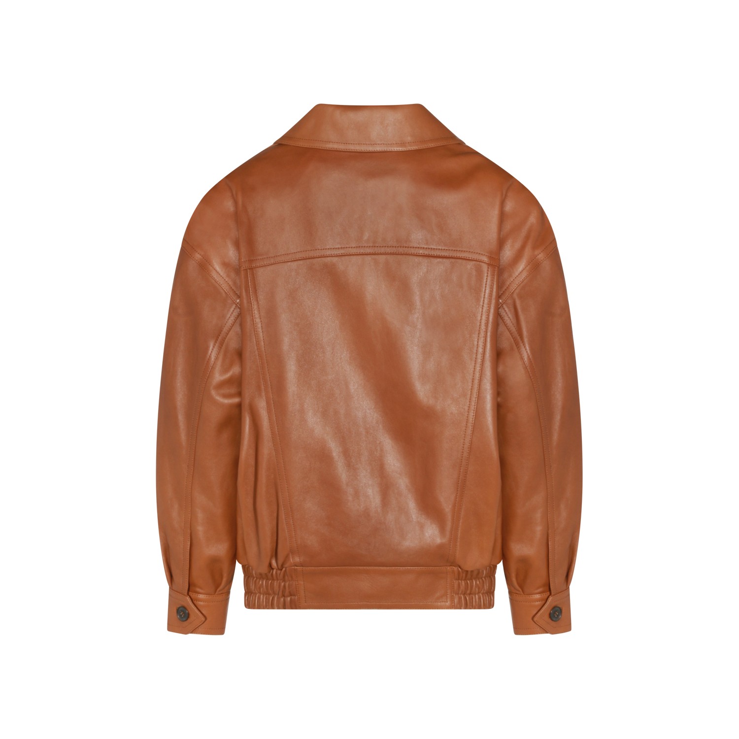 Brown leather jacket from Saint Laurent featuring classic collar, long sleeves, frontal closure, elasticated hem and buttoned pockets.