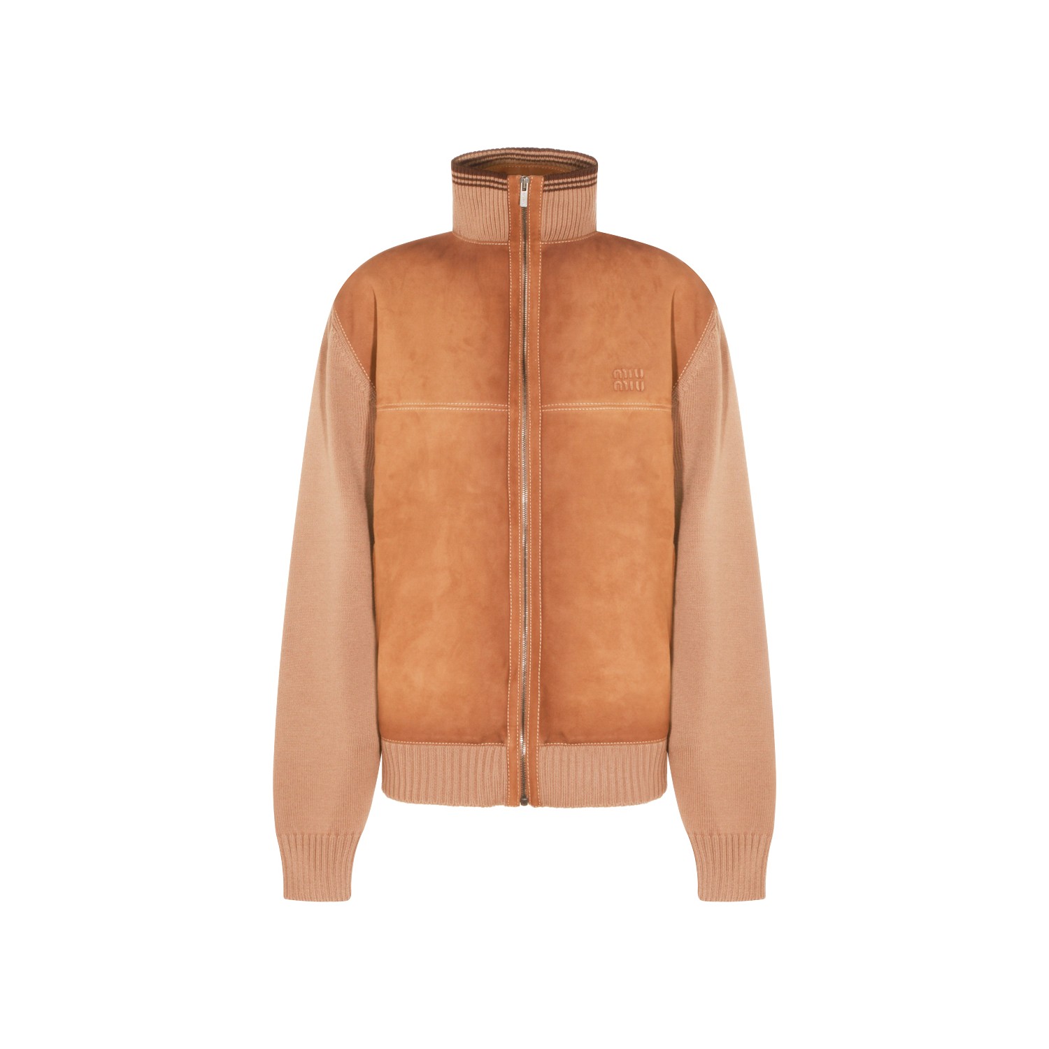 Camel wool casual jacket from Miu Miu featuring high collar, long sleeves, zip fastening, heart engraved logo, ribbed cuffs and hem and regular vestibility.
