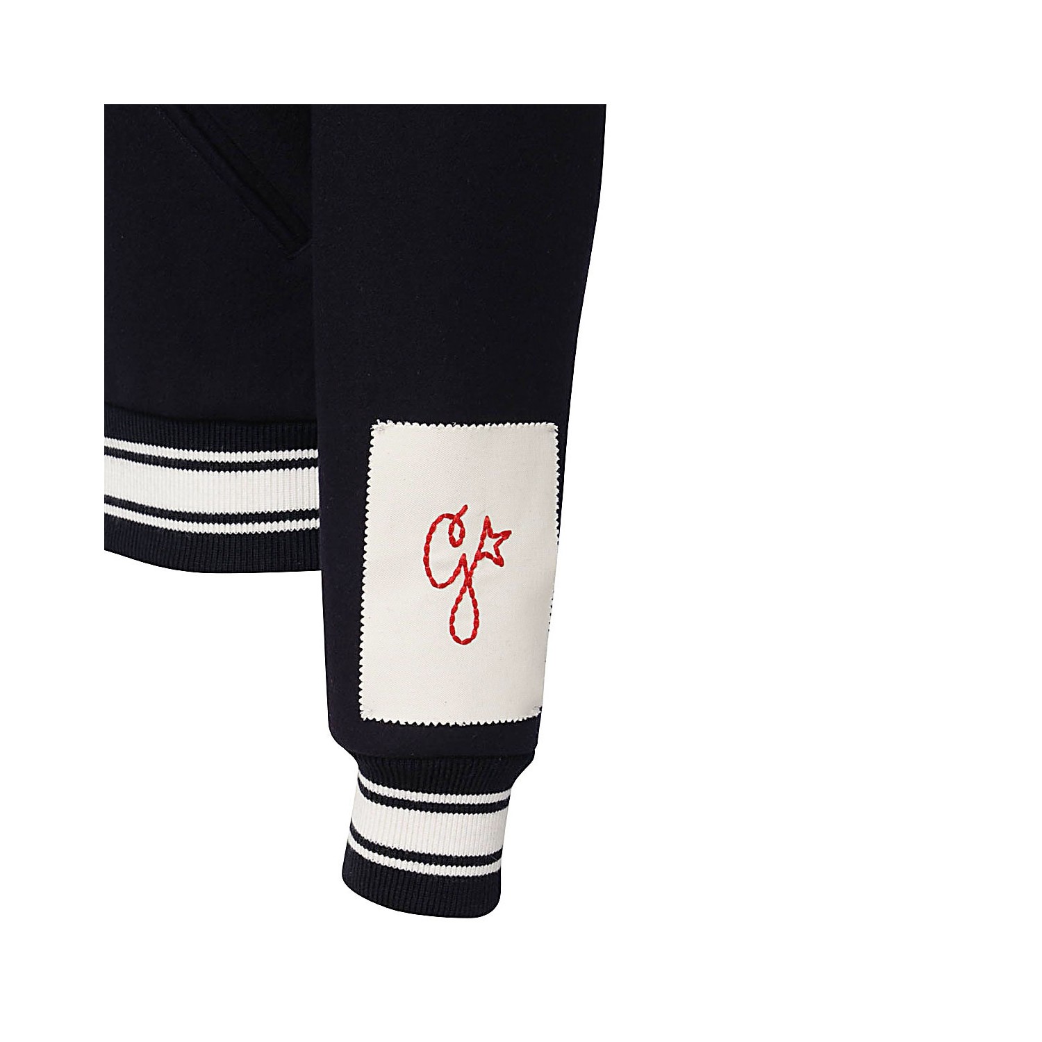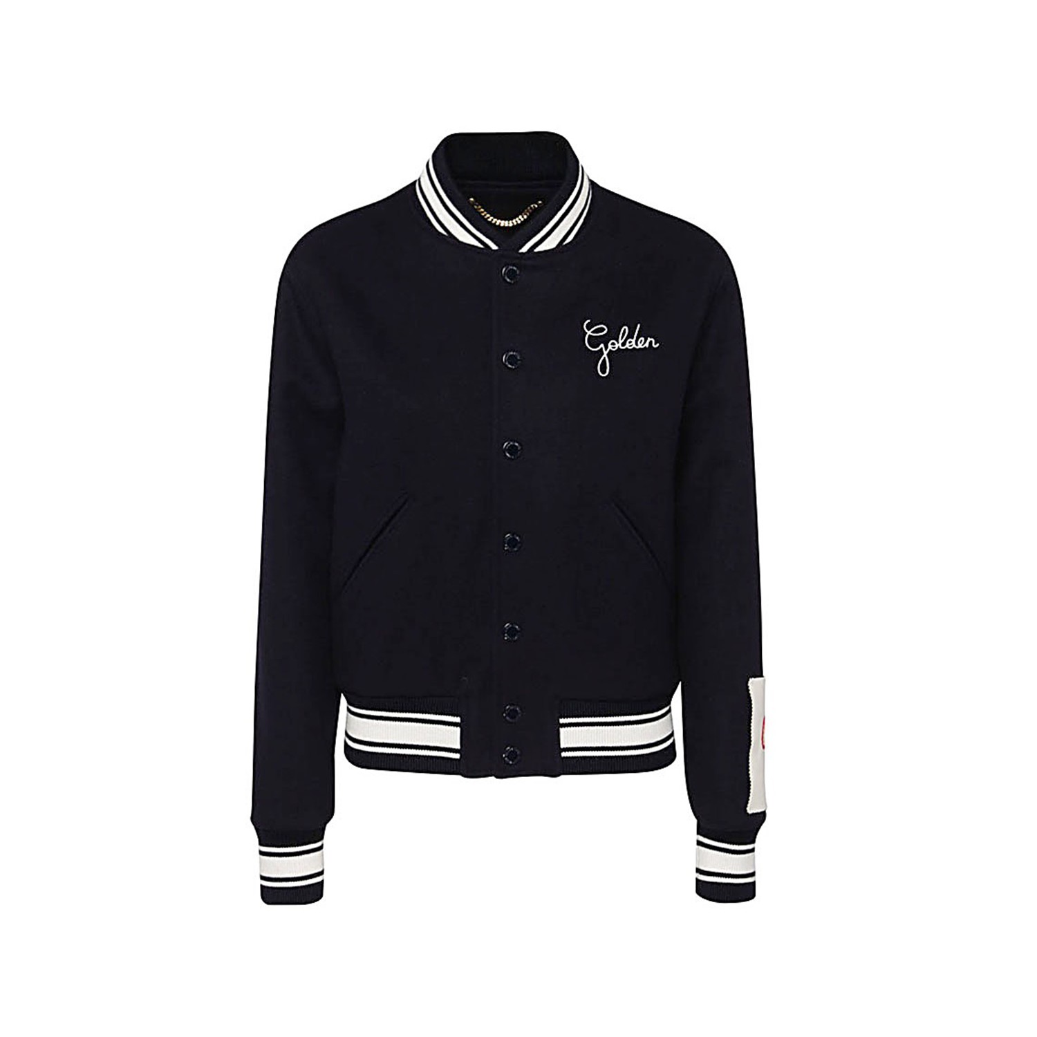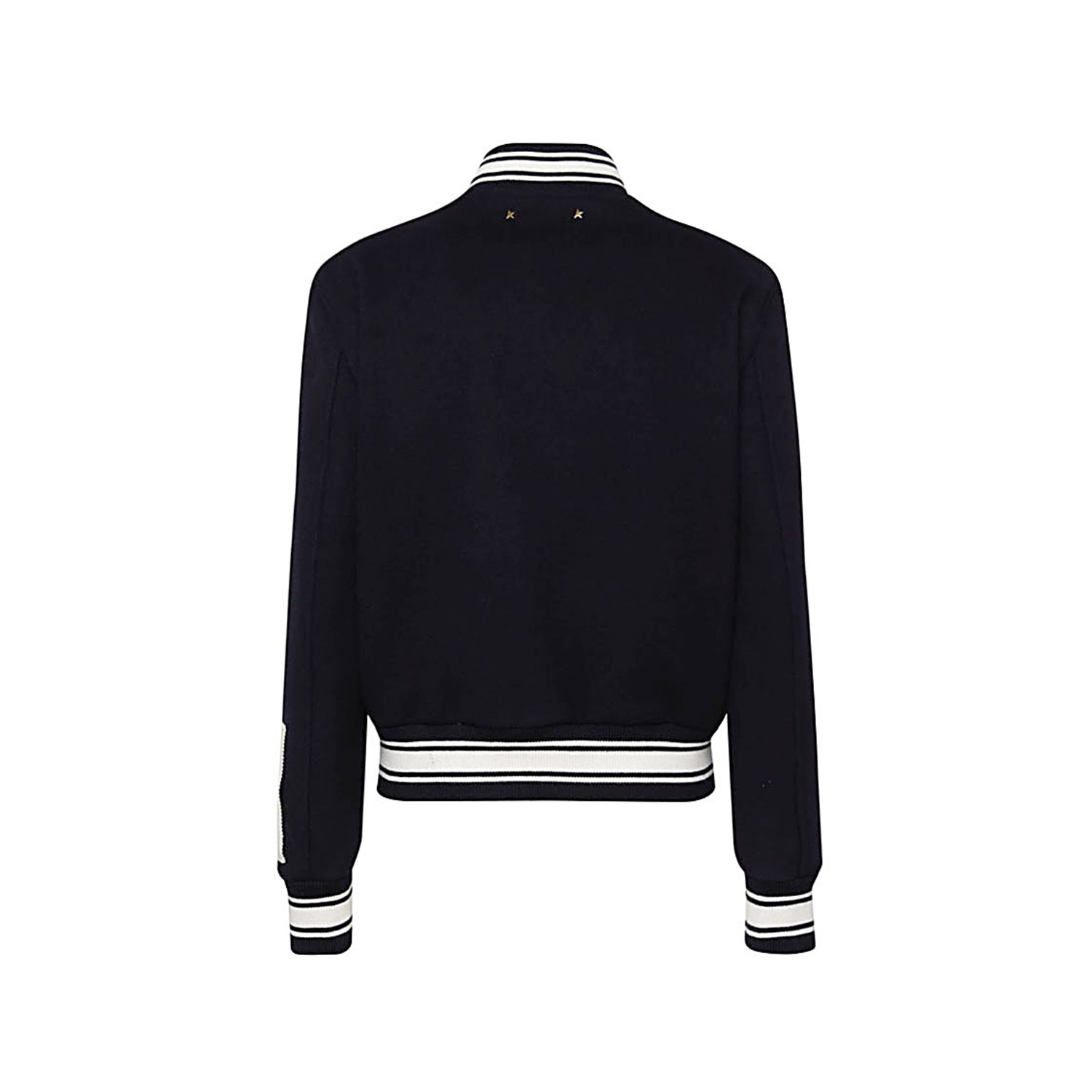 Black wool blend bomber jacket from Golden Goose featuring band collar, stripe detailing, long sleeves, logo patch at the sleeve, front button fastening, embroidered logo at the chest and two side slit pockets.