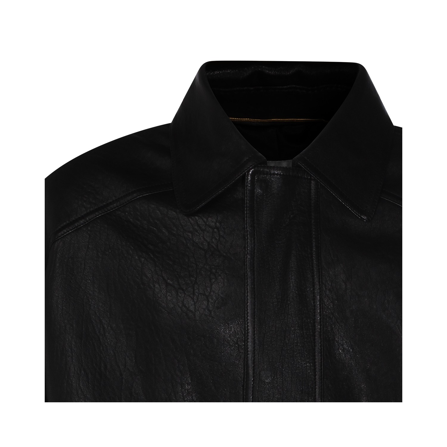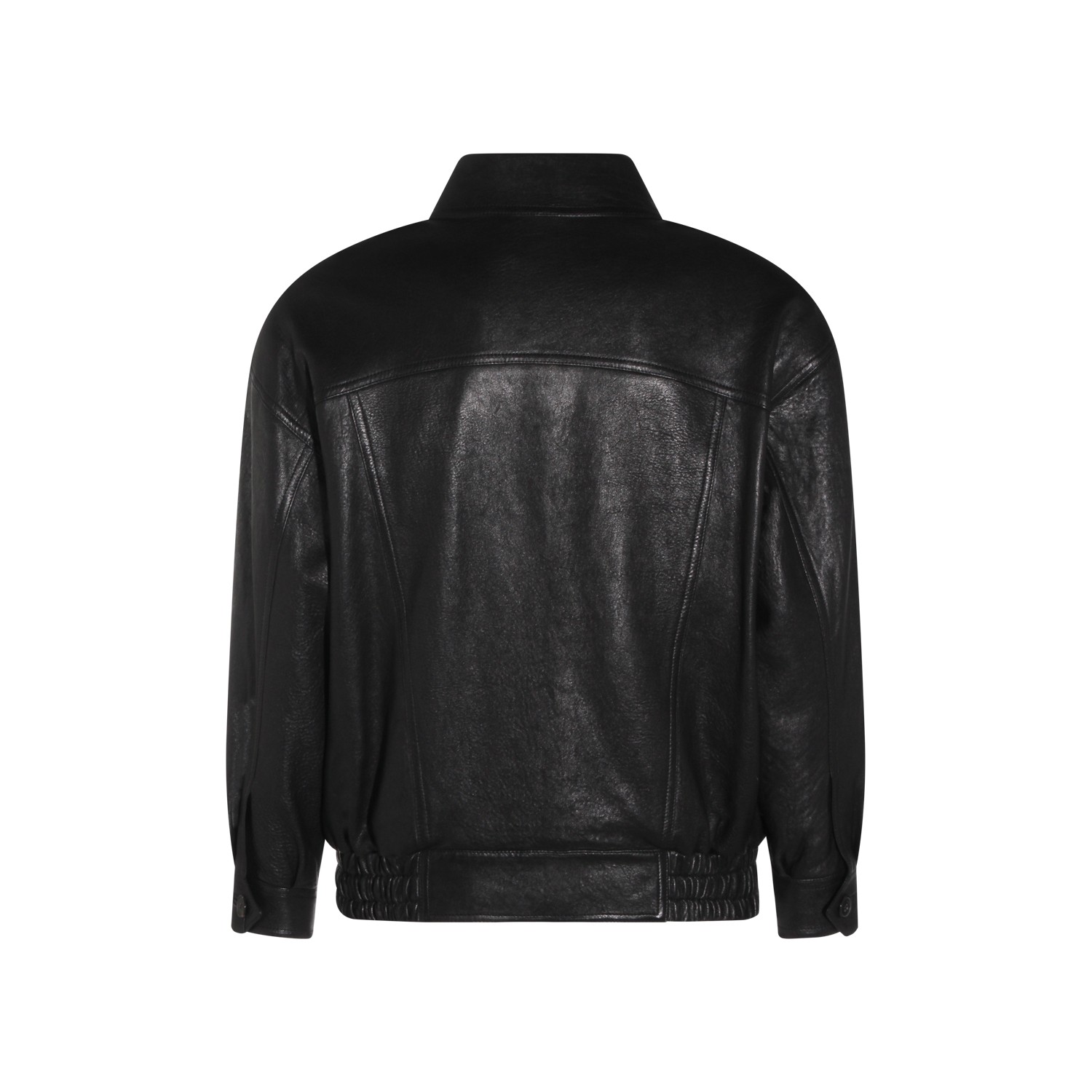 Black leather jacket from Saint Laurent featuring classic collar, long sleeves, frontal fastening, pockets and buttoned cuffs.