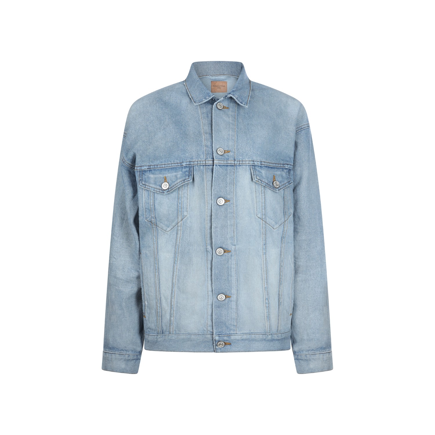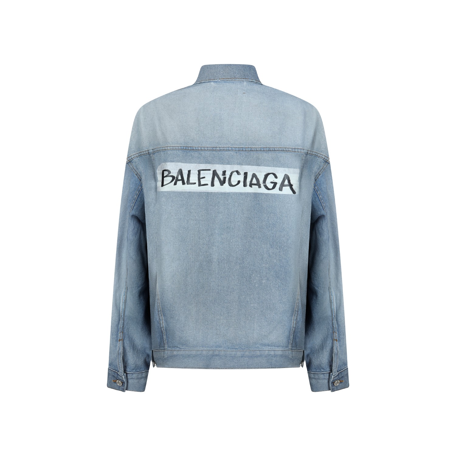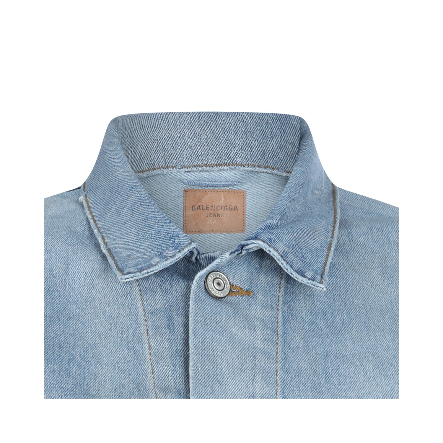 Light blue cotton denim jacket from Balenciaga featuring shirt collar, buttons fastening, long sleeves, pockets, back logo and regular vestibility.