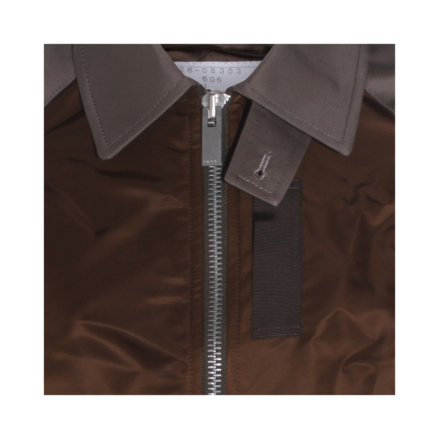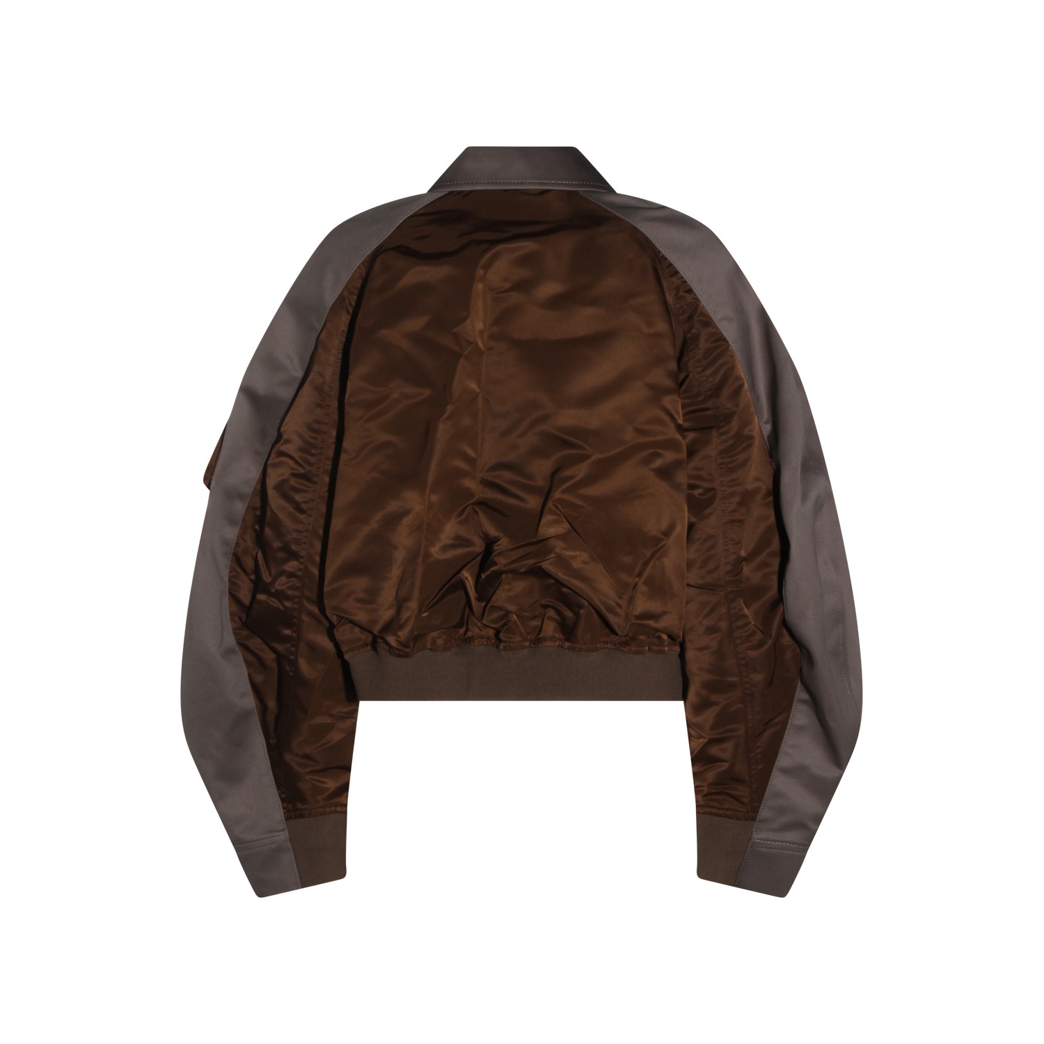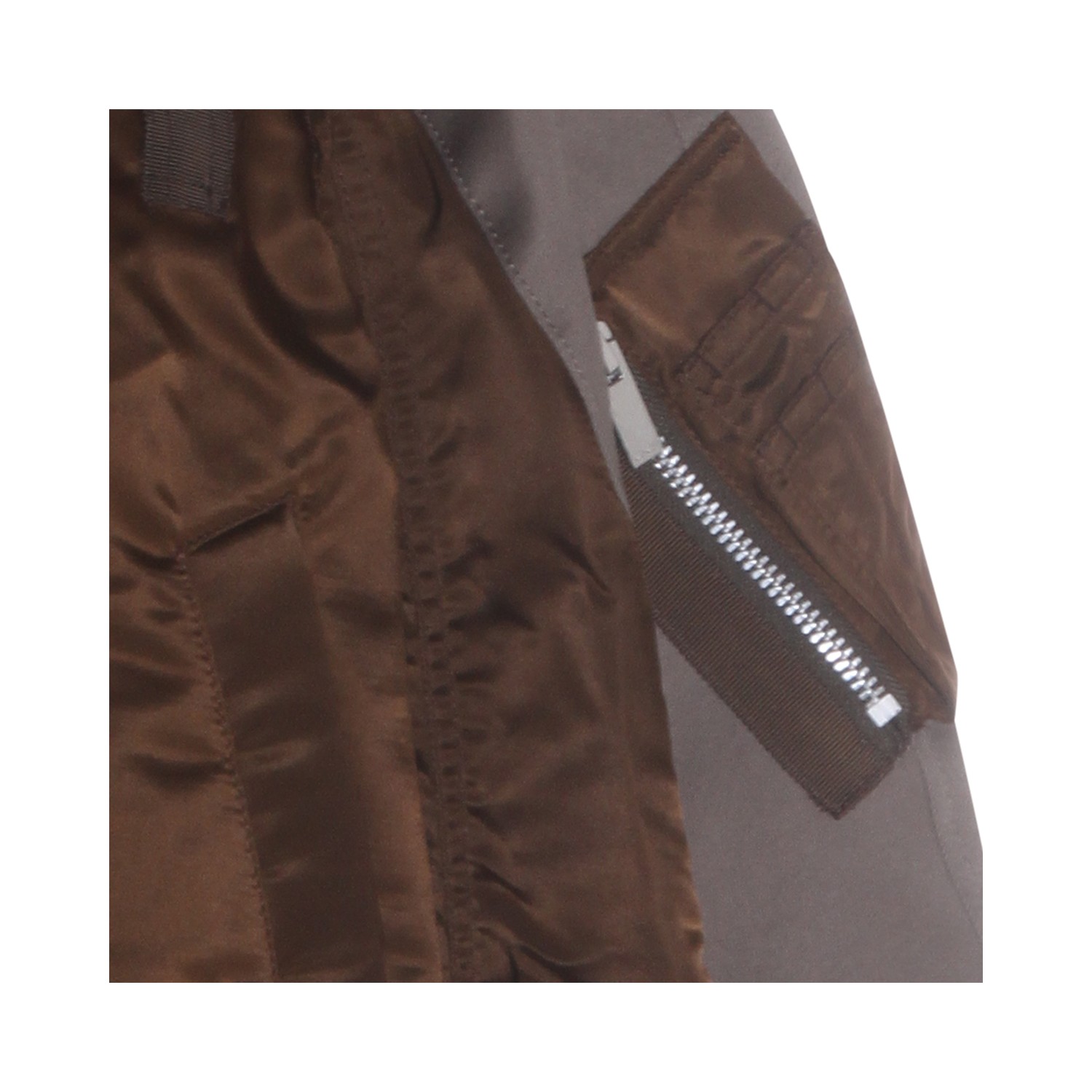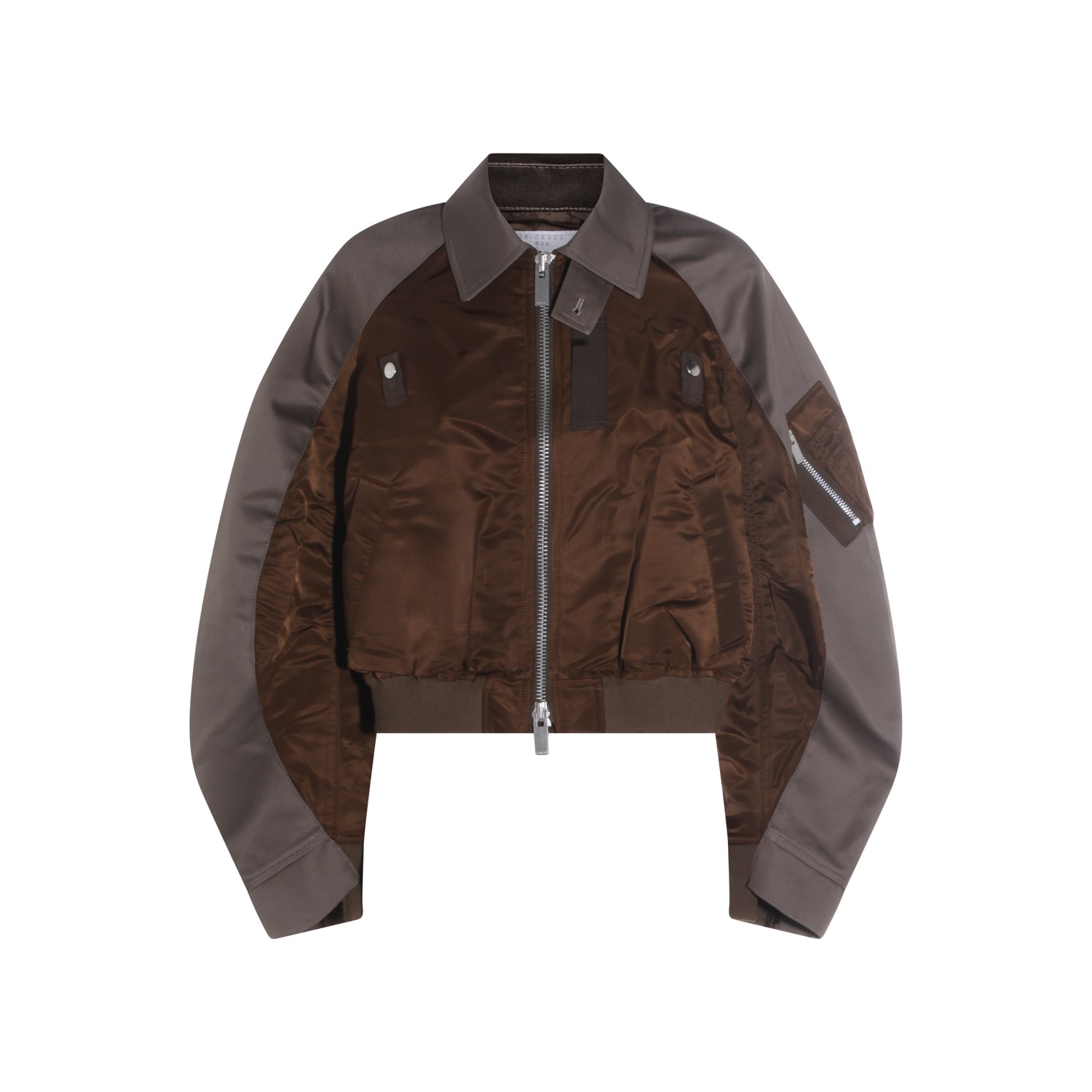 Brown and grey casual jacket from Sacai featuring shirt collar, button and zip closure, long sleeves, front pockets, sleeve zipped pocket, ribbed hem, contrasting colour detail, cropped length and oversize fit.