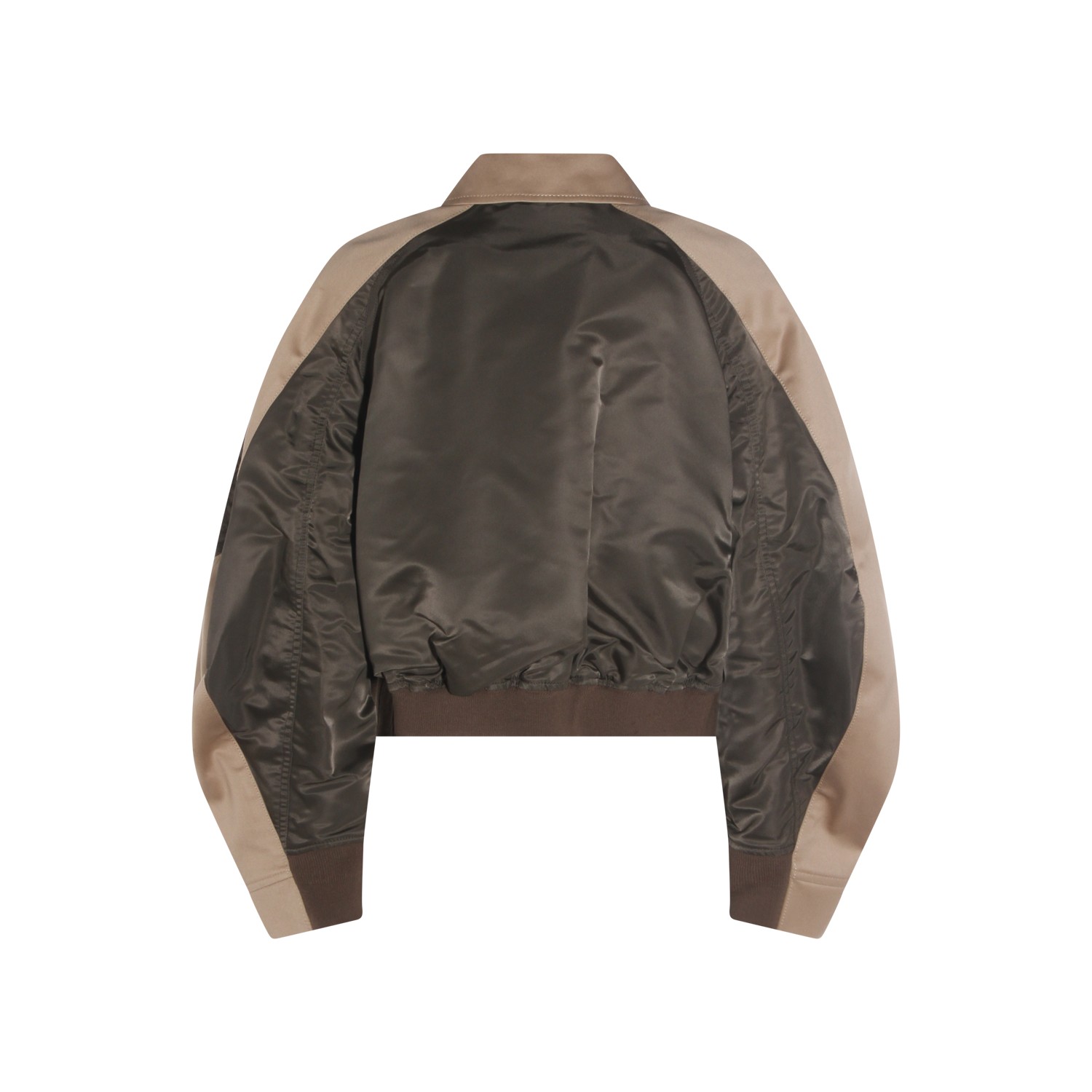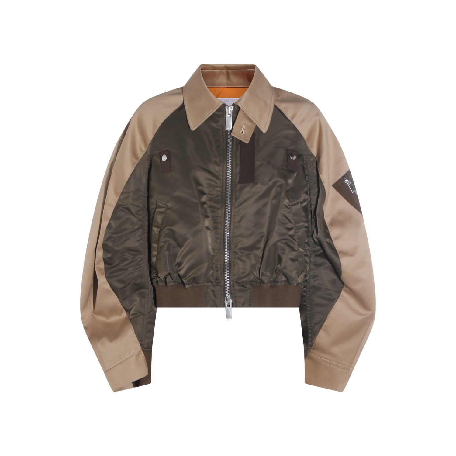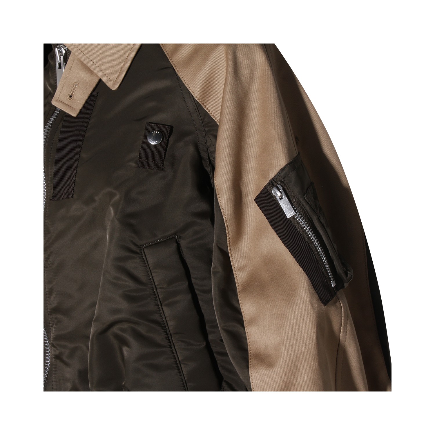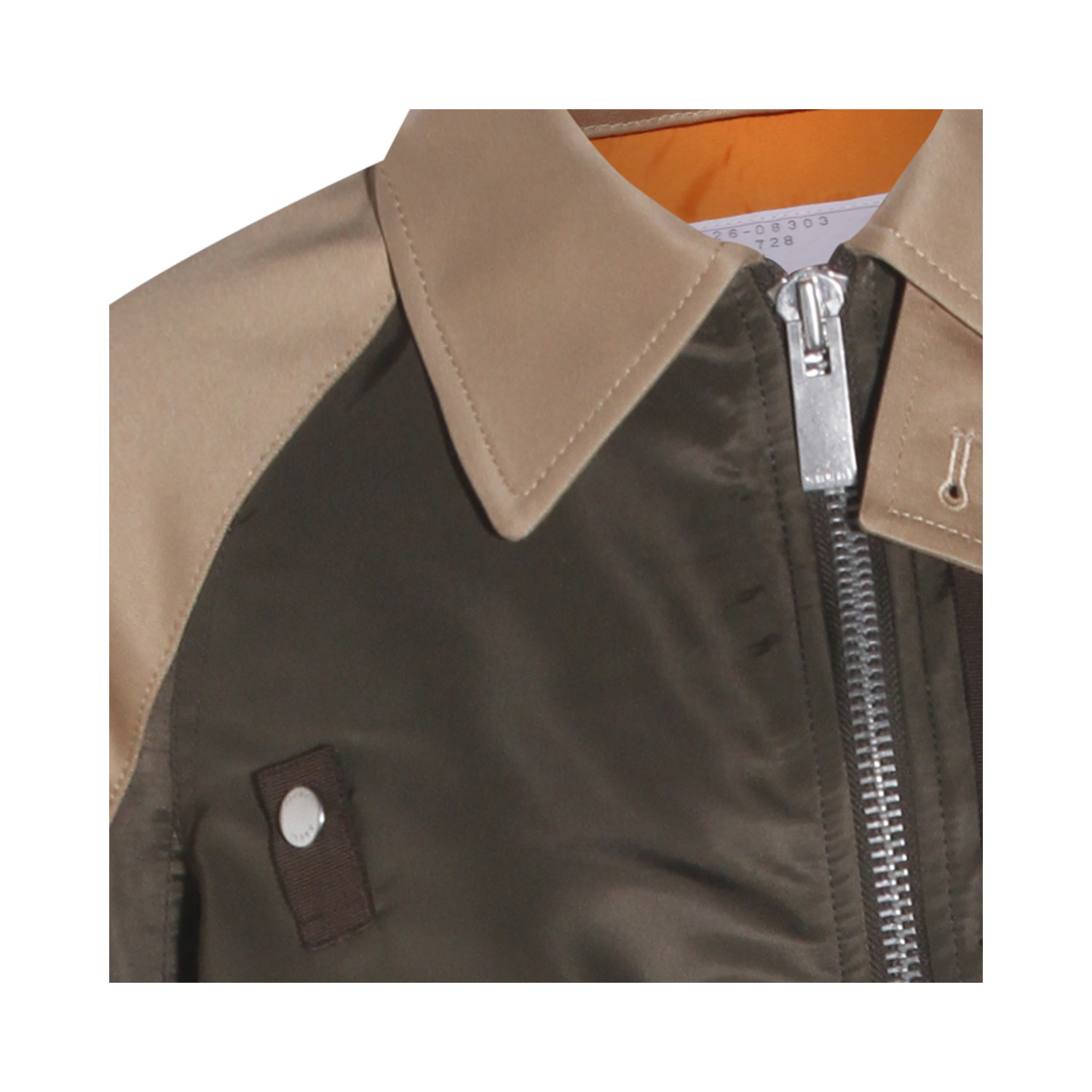 Khaki and beige casual jacket from Sacai featuring shirt collar, button and zip closure, long sleeves, front pockets, sleeve zipped pocket, ribbed hem, contrasting colour detail, cropped length and oversize fit.