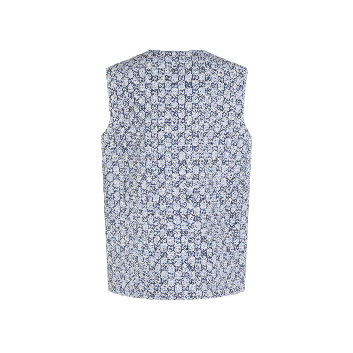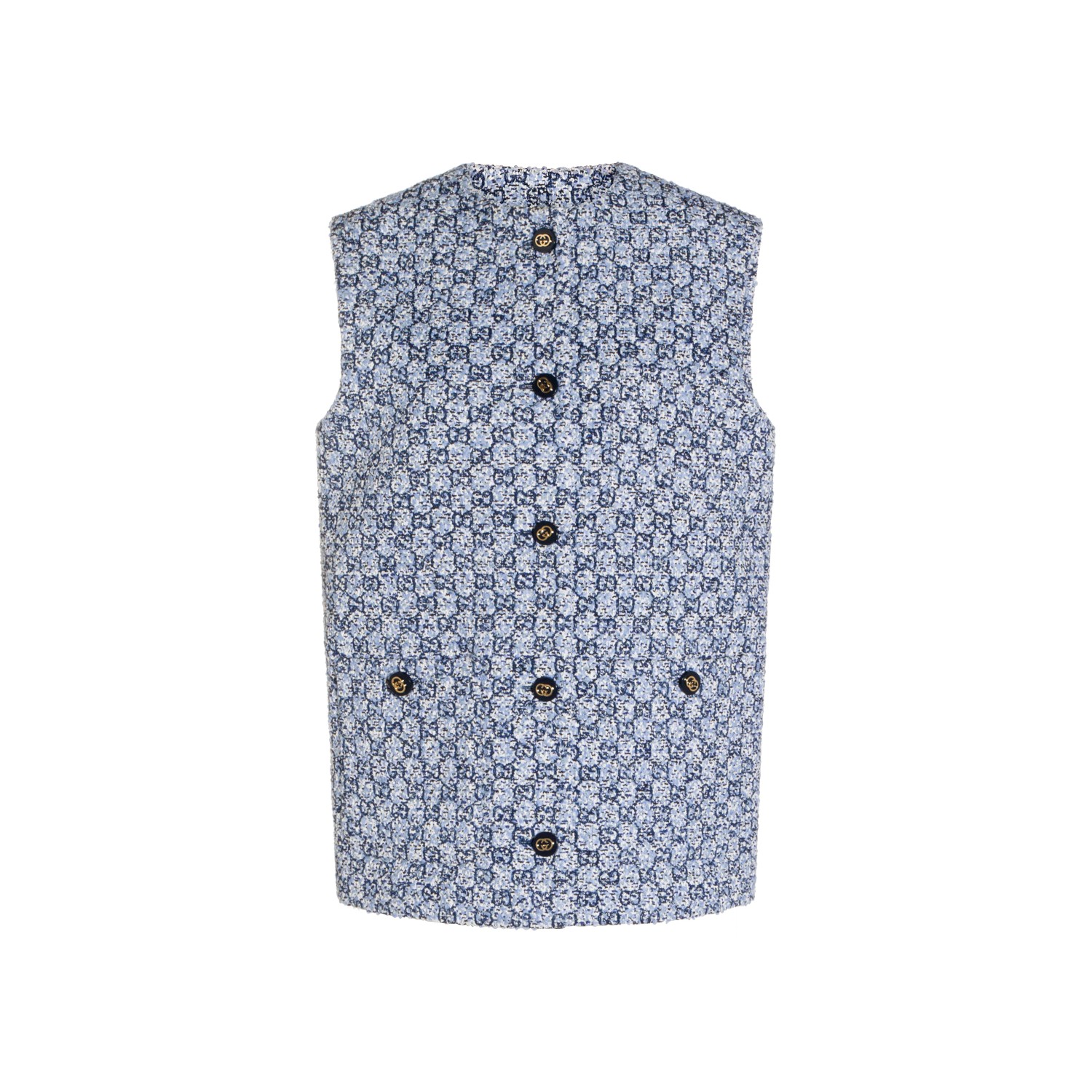 White and blue casual jacket from Gucci featuring sleeveless, round collar, frontal buttons fastening and pockets.
