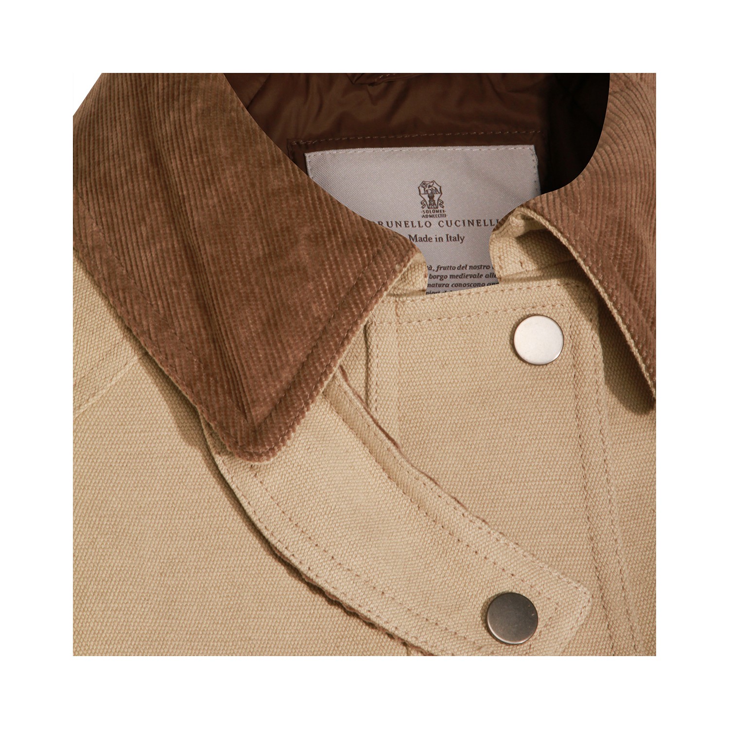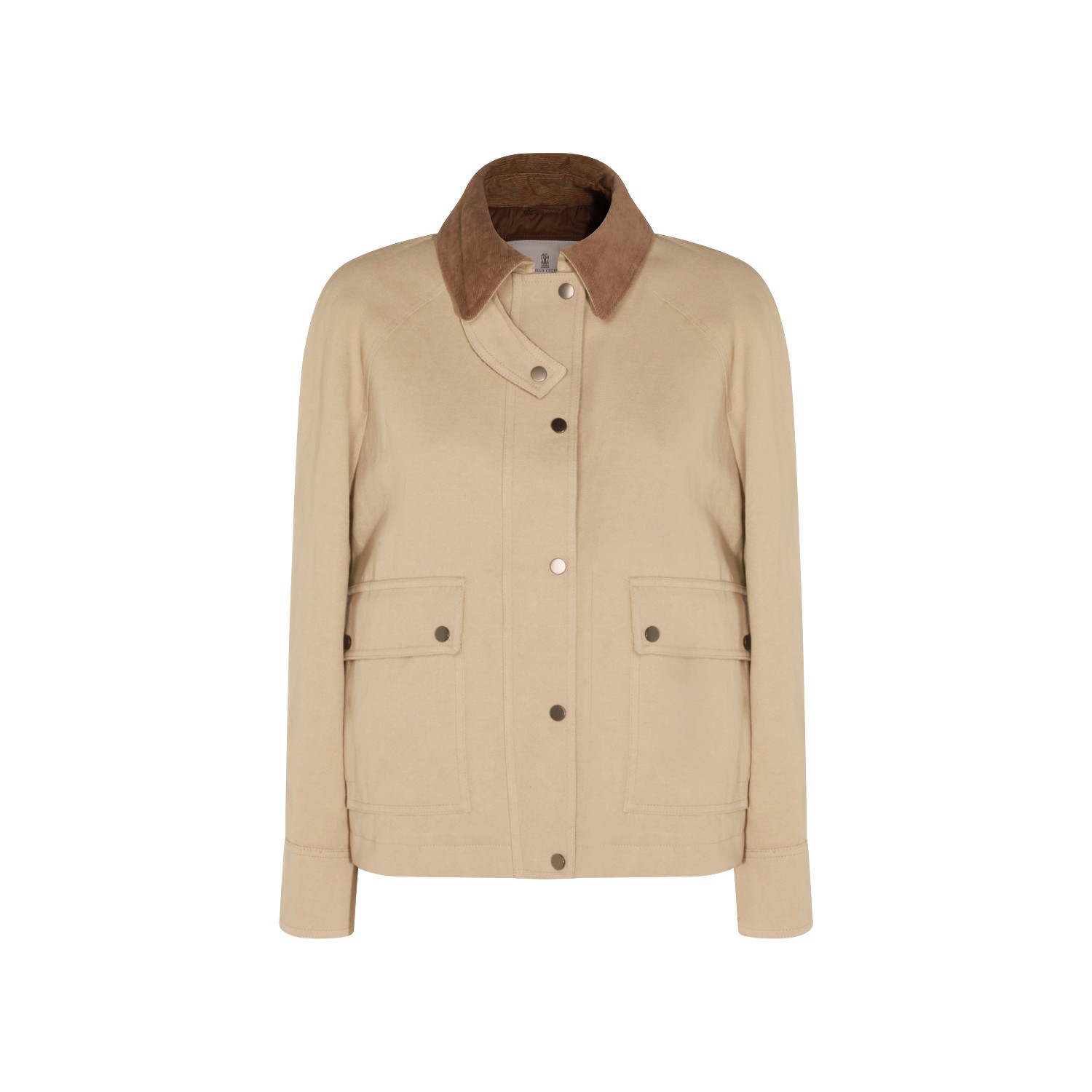 Beige cotton casual jacket from Brunello Cucinelli featuring ribbed collar, long sleeves, frontal closure, buttoned pockets and regular vestibility.
