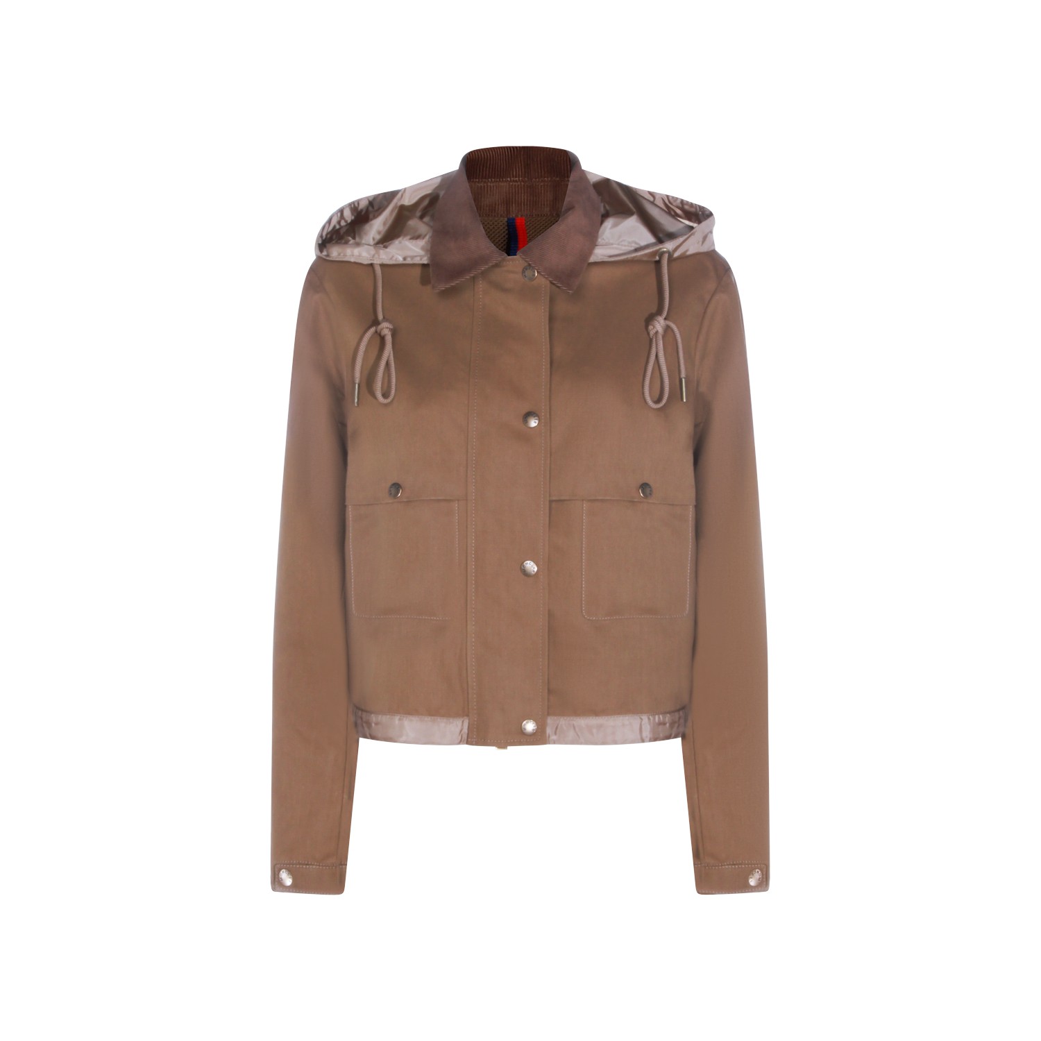 Brown cotton Aconitum casual jacket from Moncler featuring classic collar, hood, long sleeves, zip and buttons fastening, pockets and regular vestibility.