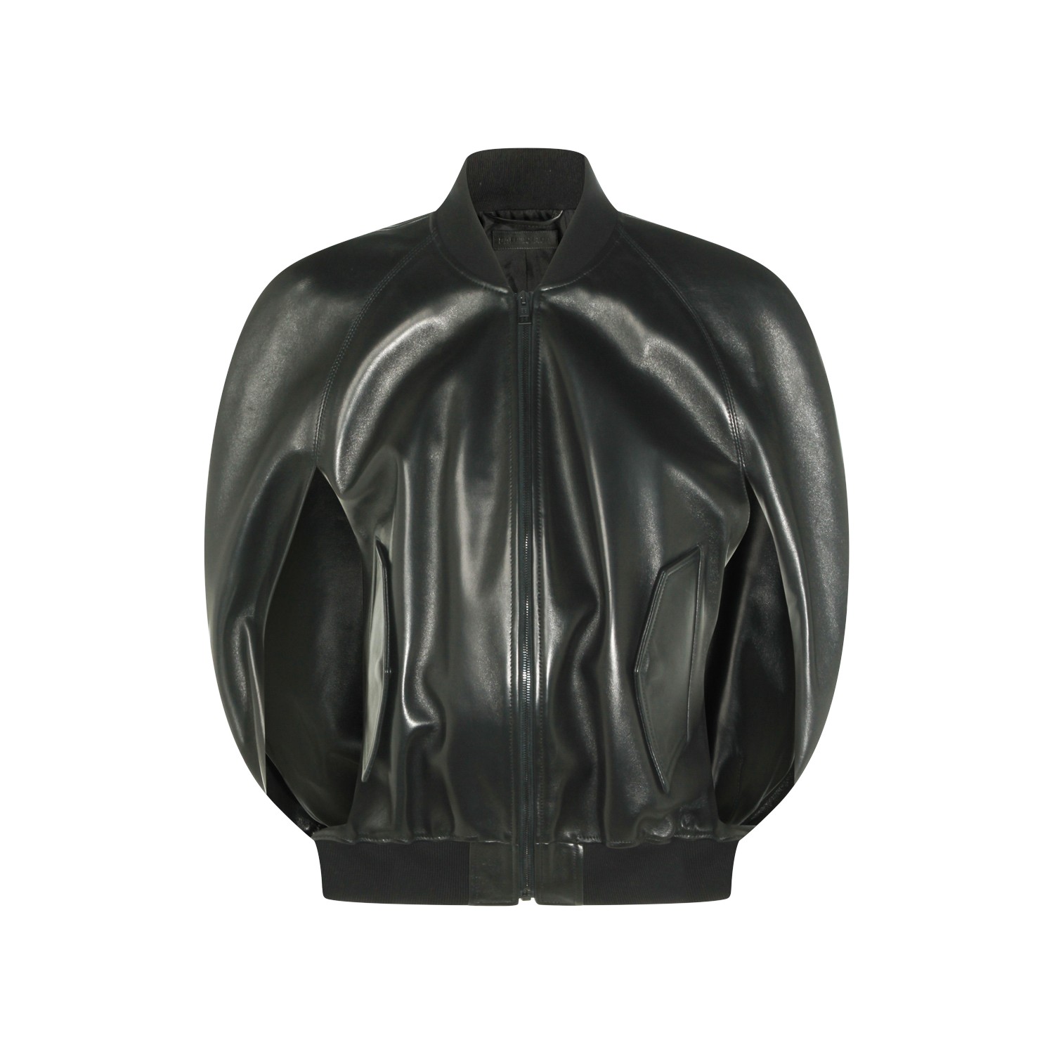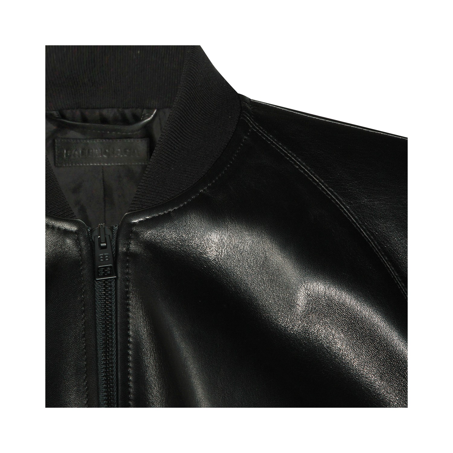 Black leather jacket from Balenciaga featuring long sleeves, zip fastening, pockets, elasticated hem and regular fit.