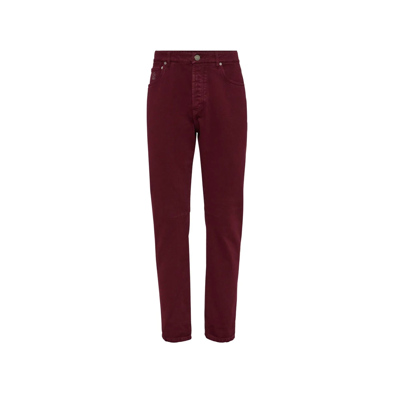 Dark red cotton jeans from Brunello Cucinelli featuring mid waist, belt loops, button and zip fastening, five-pockets, straight leg and regular vestibility.