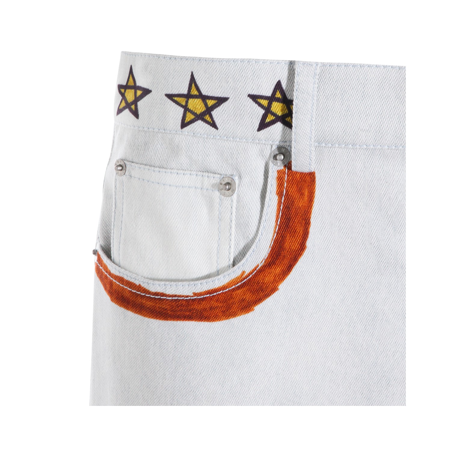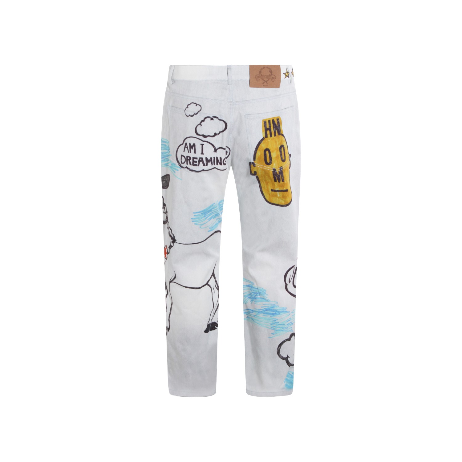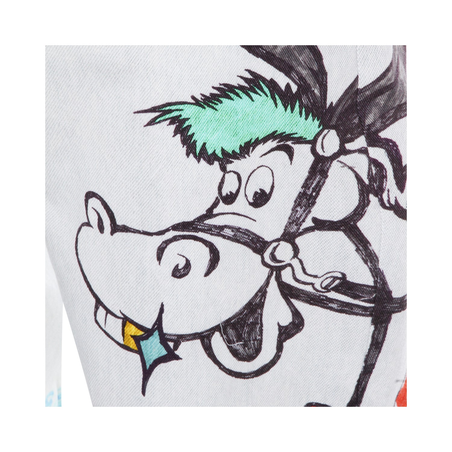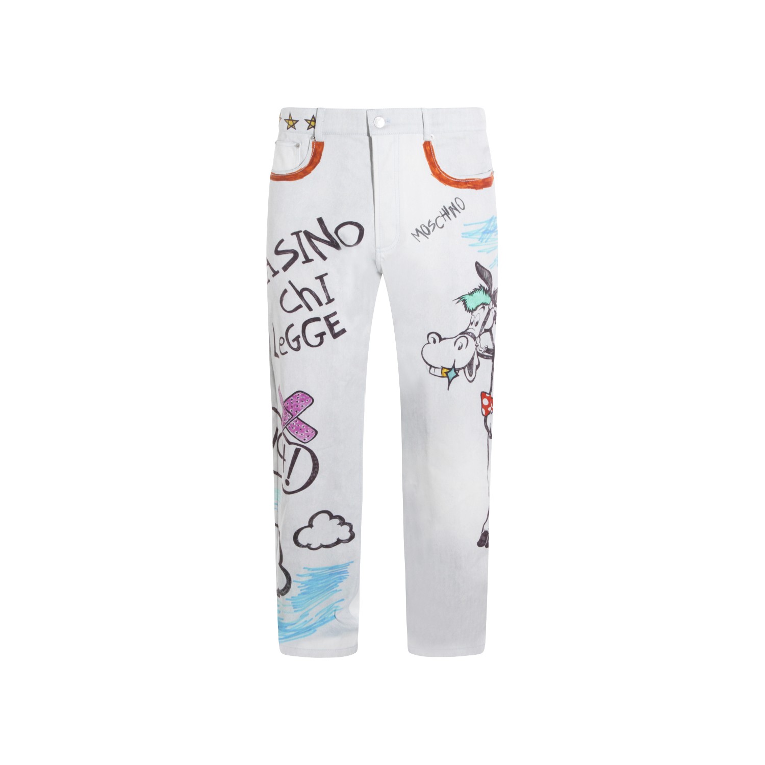 White cotton jeans from Moschino featuring frontal fastening, belt loops, pockets and prints detail.