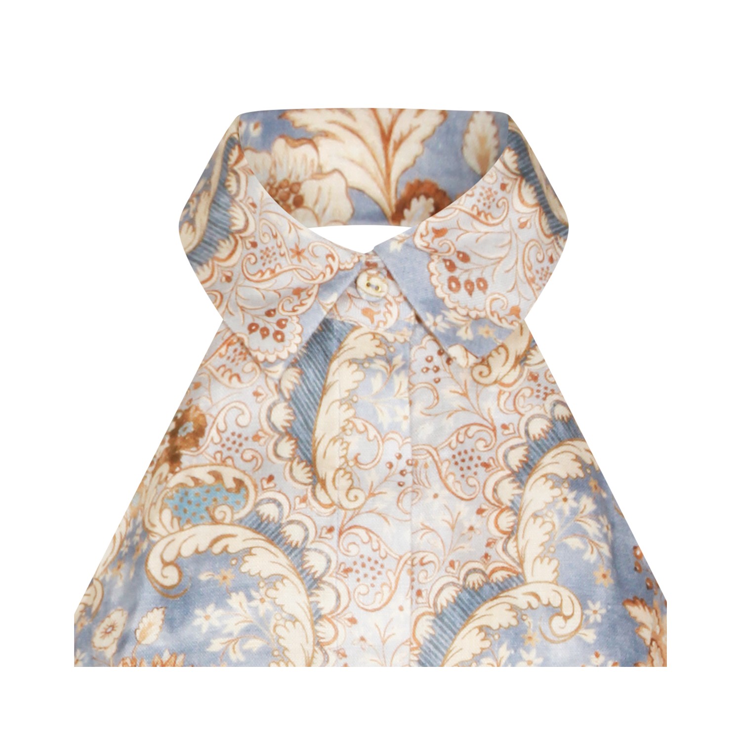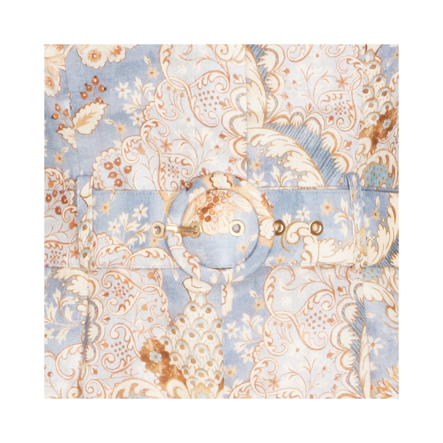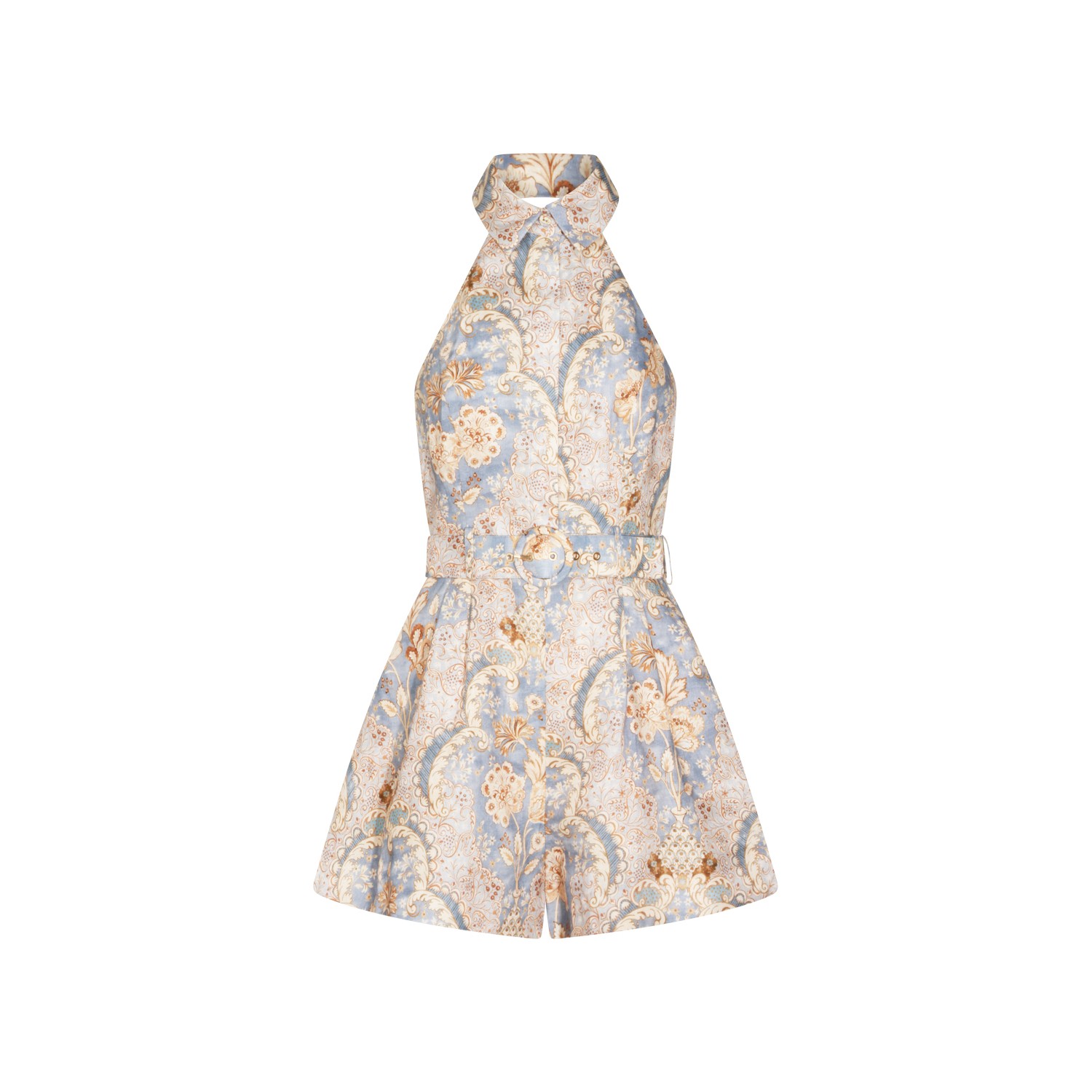 Damask denim linen jumpsuit from Zimmermann featuring shirt collar, sleeveless, frontal button fastening, waist belt and regular vestibility.