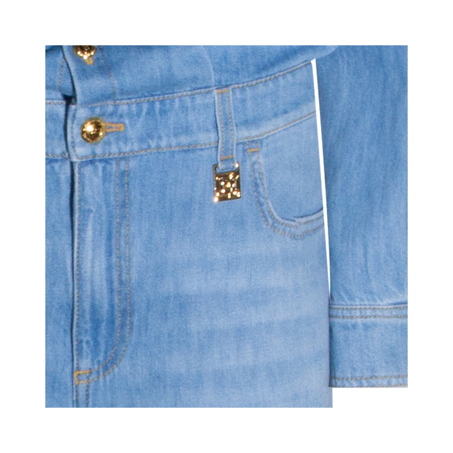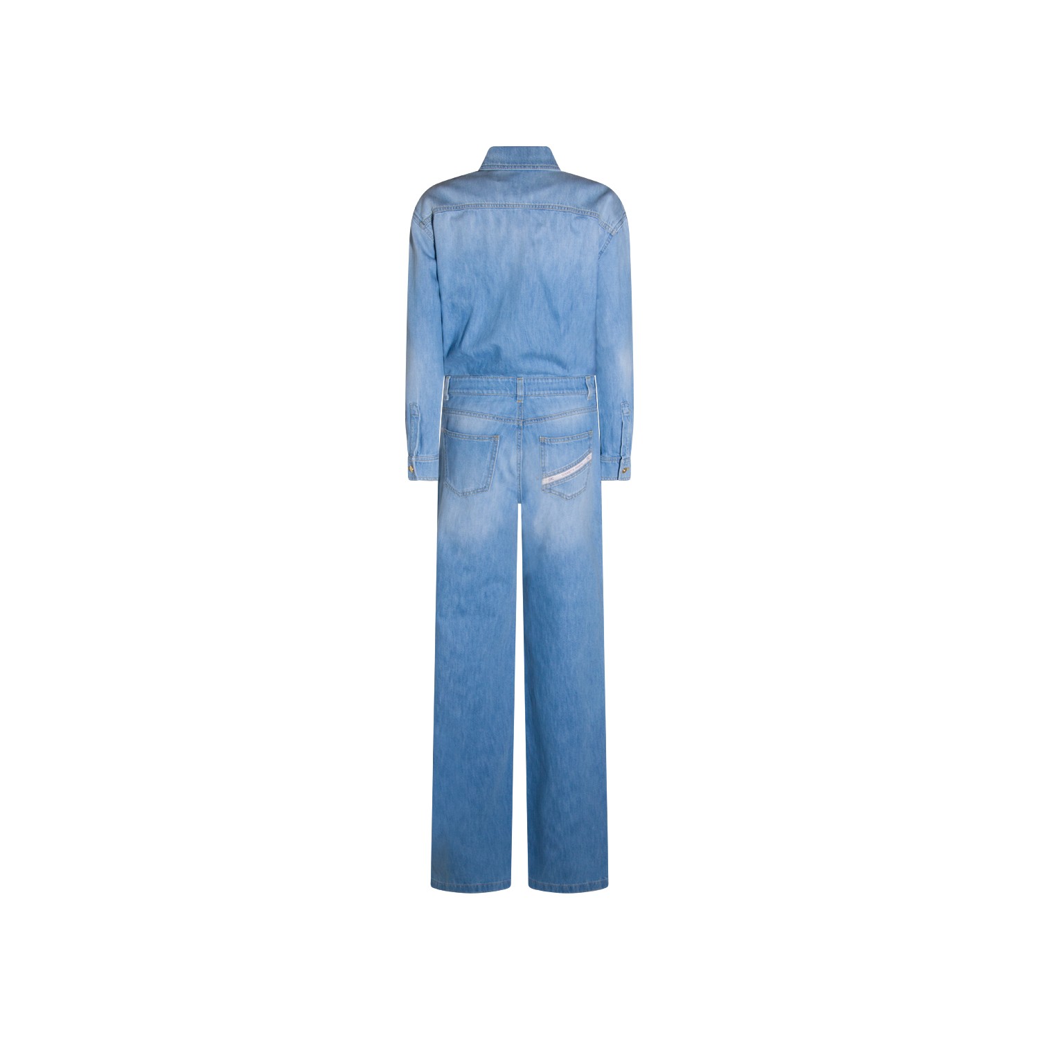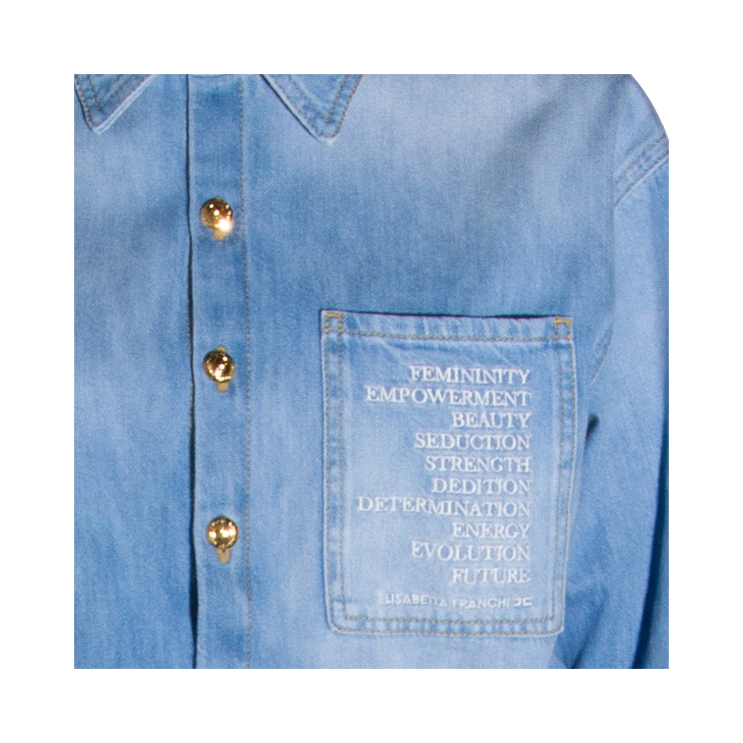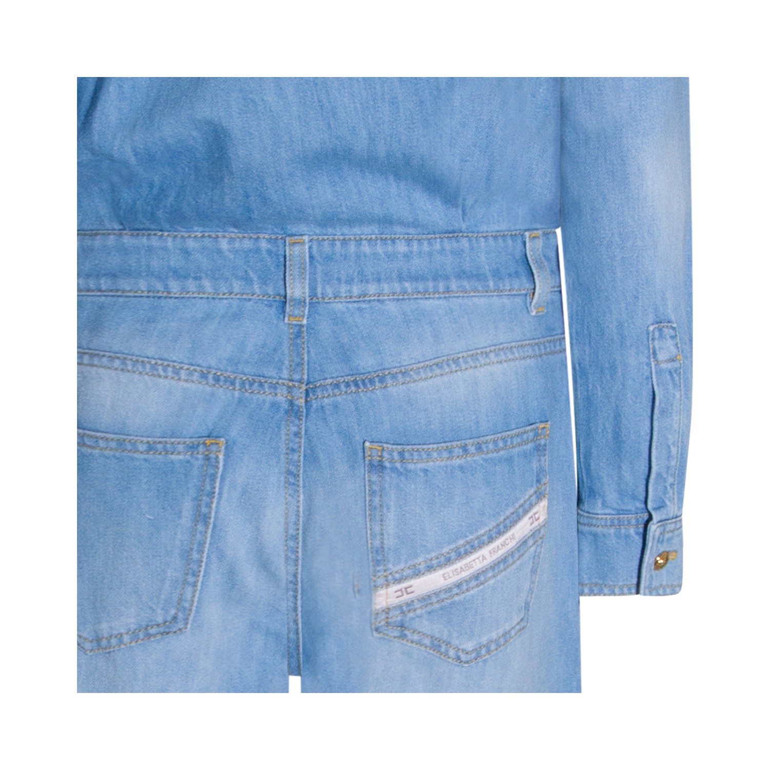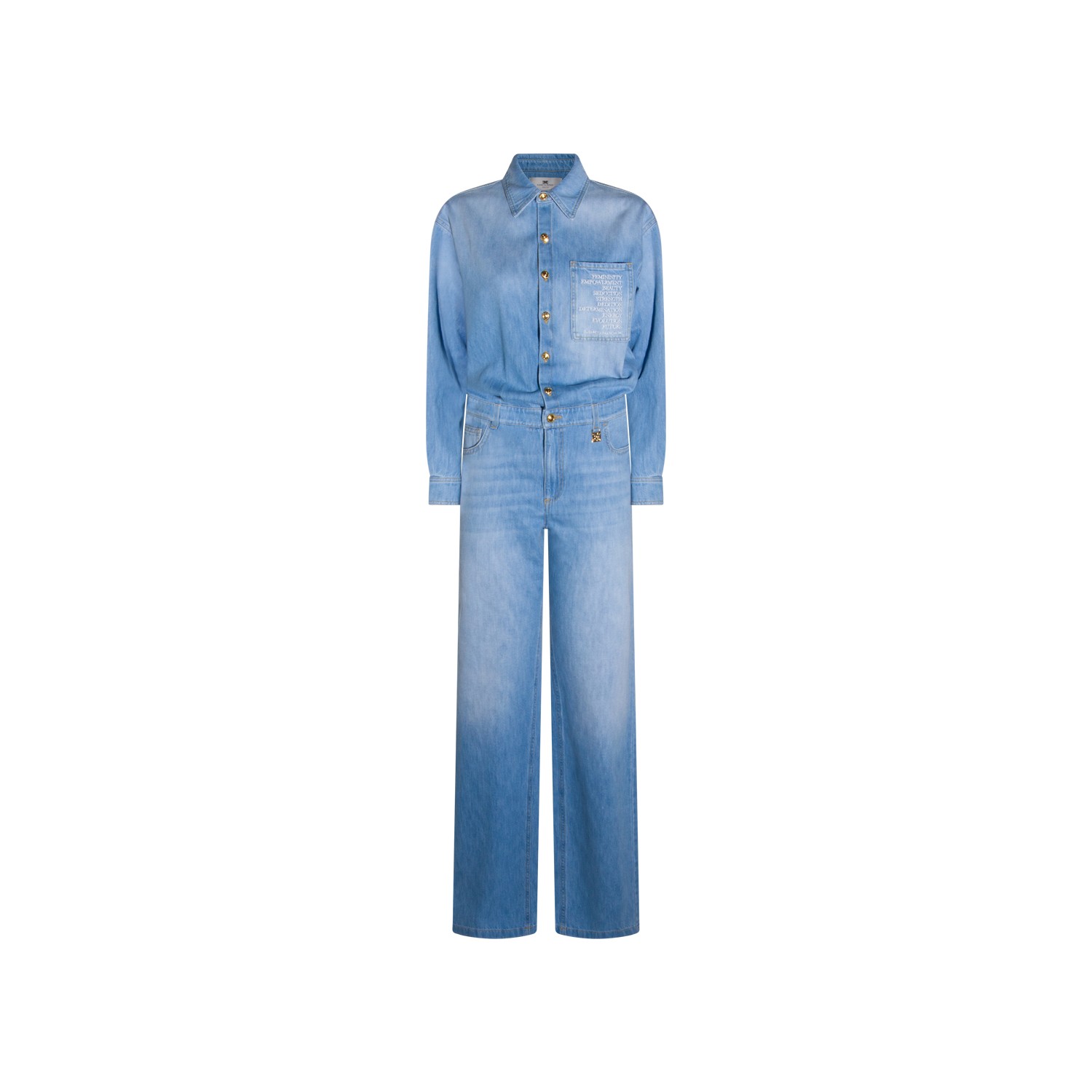 Light blue cotton jumpsuit from Elisabetta Franchi featuring shirt collar, long sleeves, frontal buttons and zip fastening, belt loops, frontal chest pocket with lettering, five-pocket, gold tone logo detail and oversize fit.