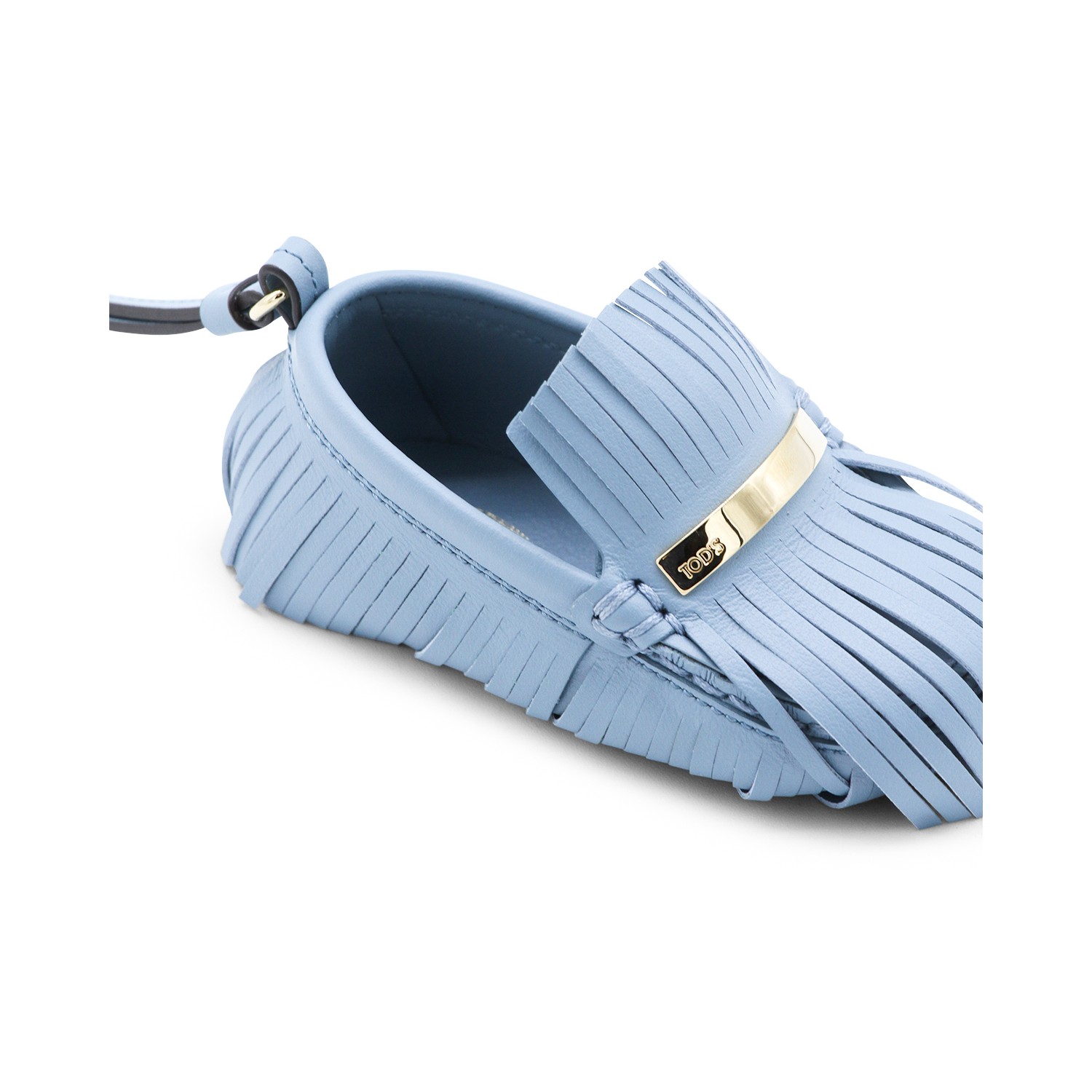 Light blue key ring from Tod's featuring shoe shape, key ringe and fringed details.