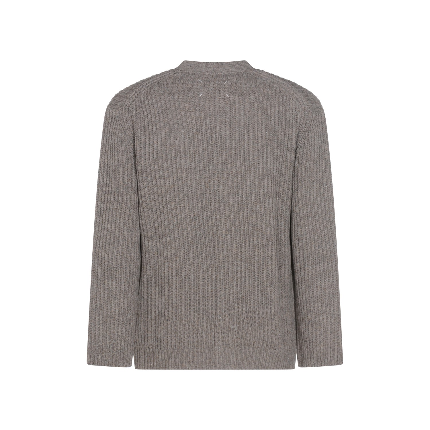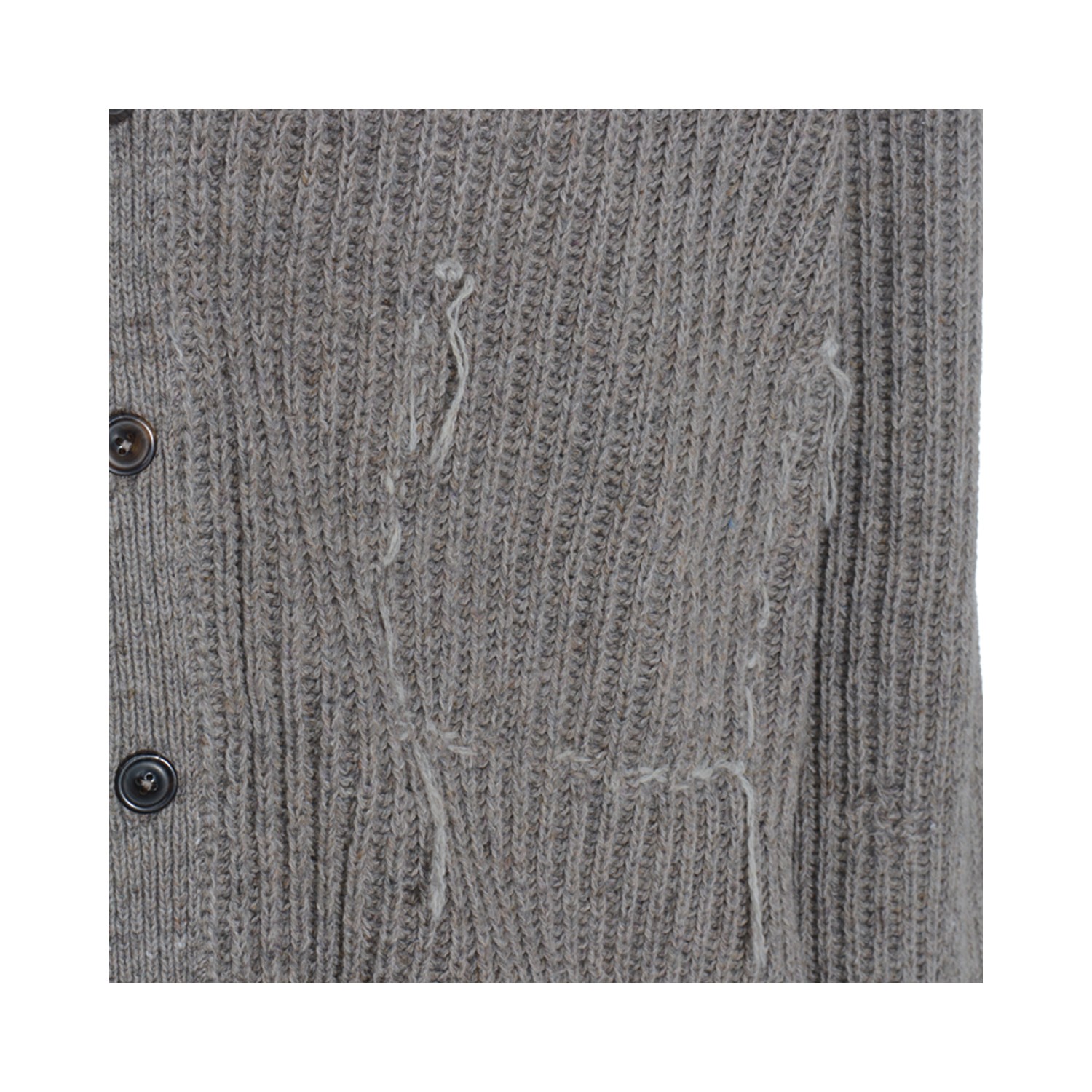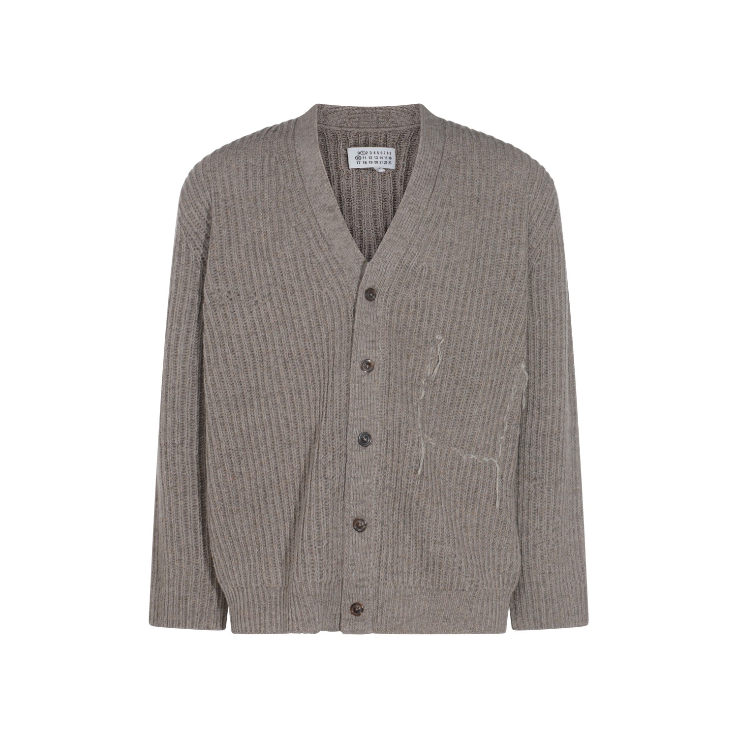 Grey wool knitwear from Maison Margiela featuring v neckline, long sleeves, buttons fastening, ribbed trim and regular vestibility.