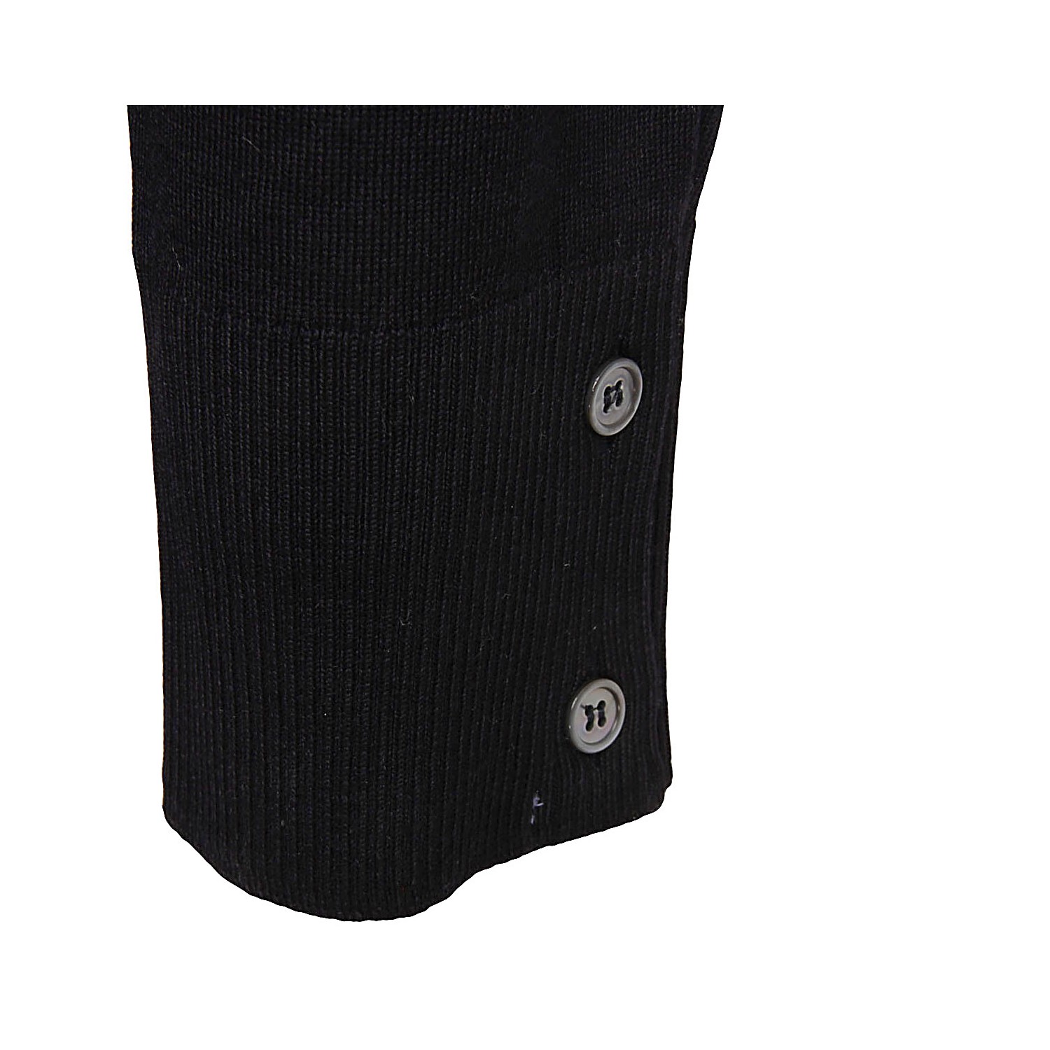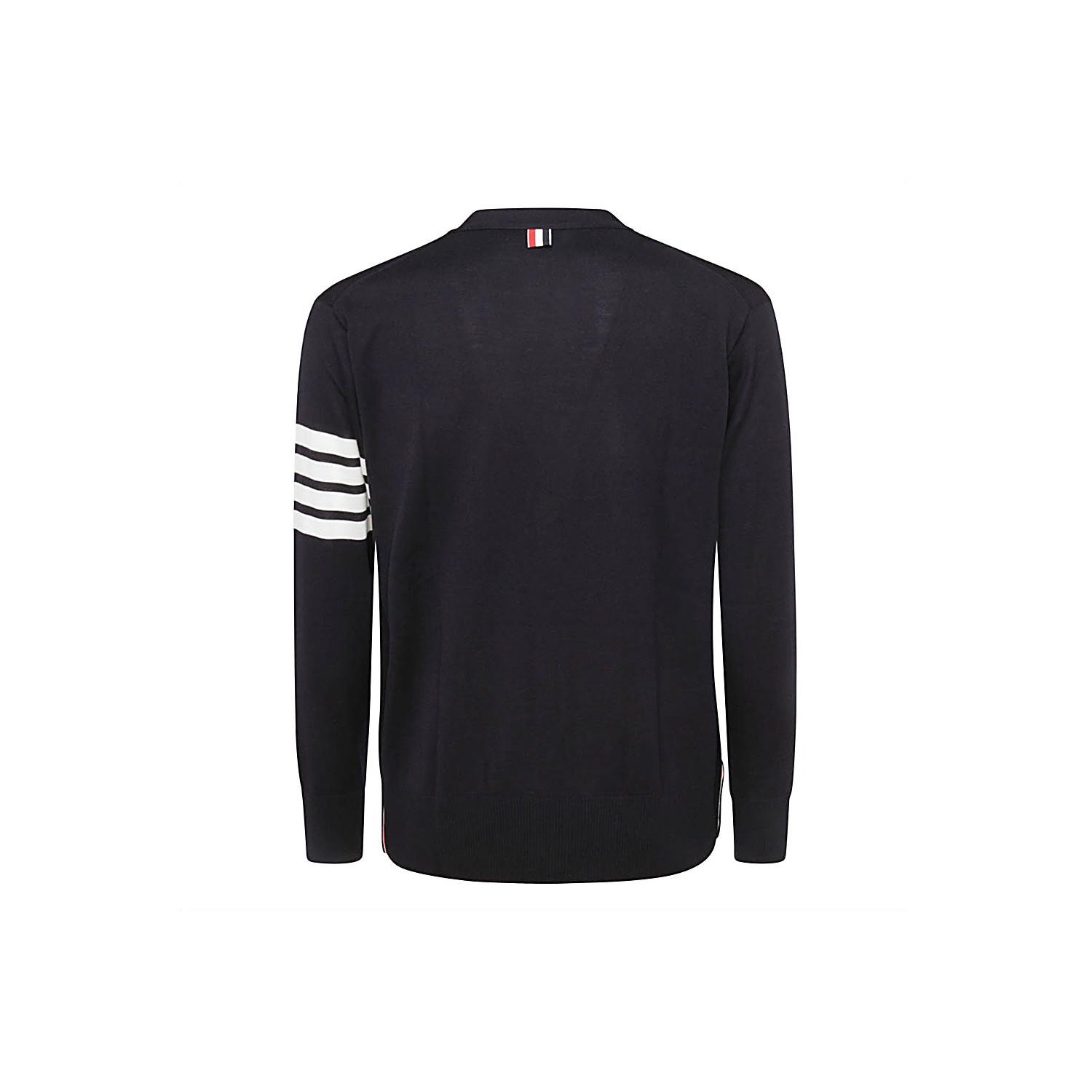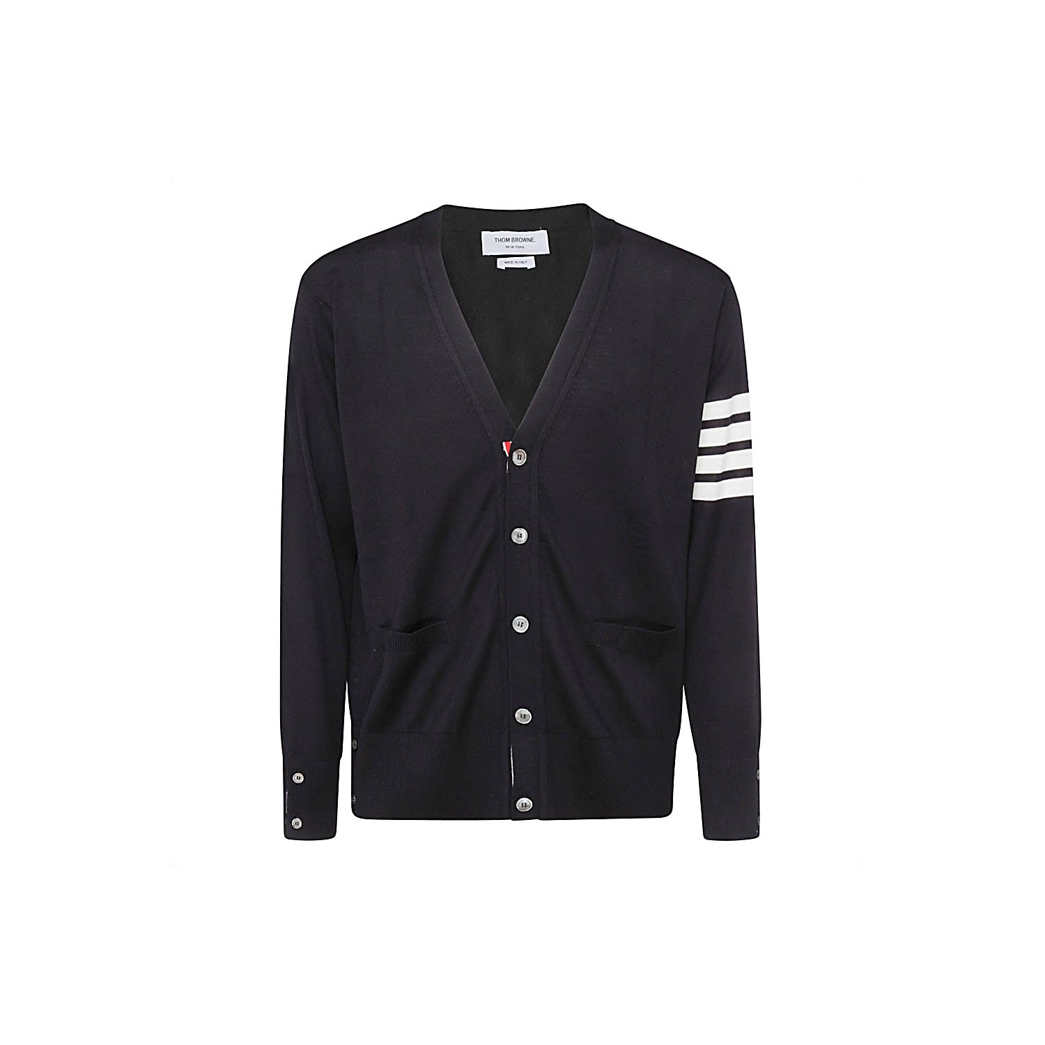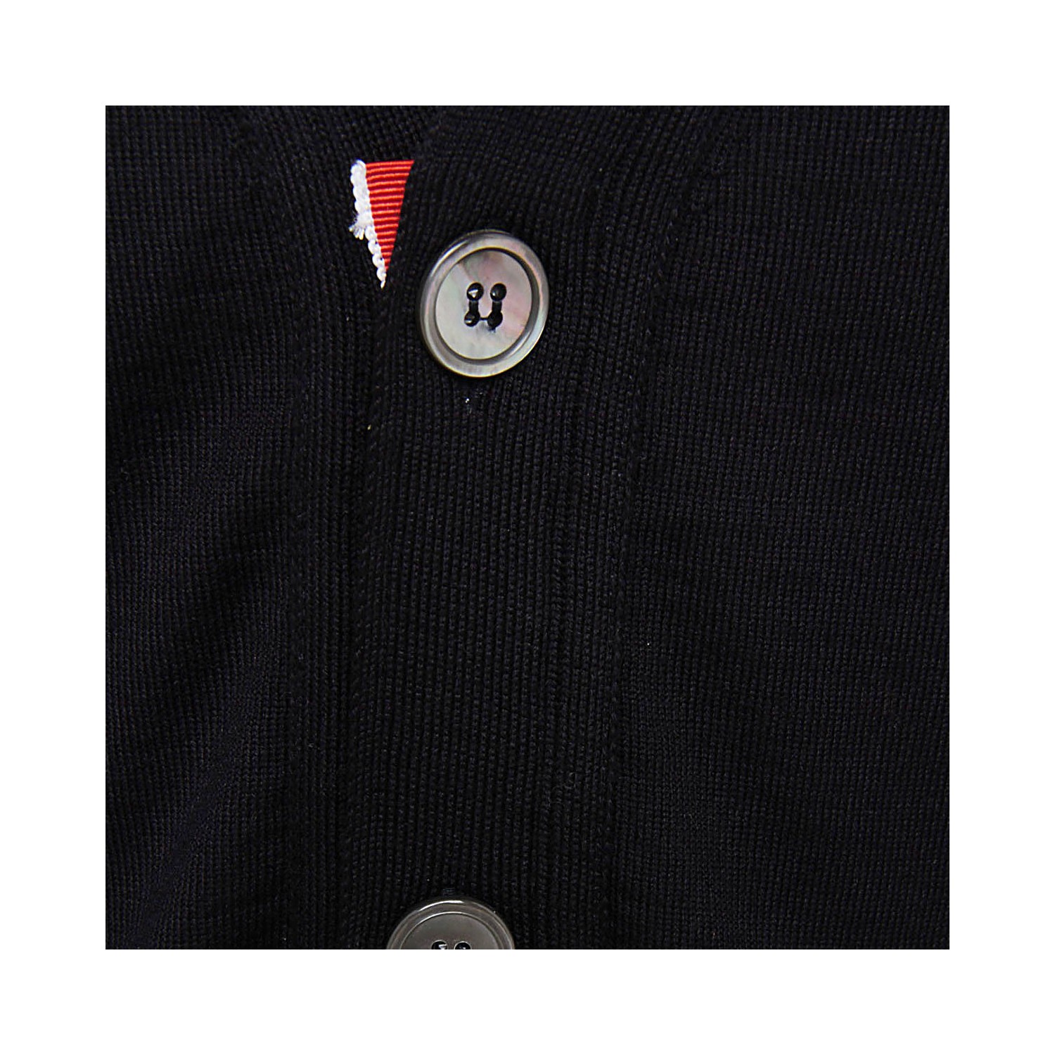 Black wool knitwear from Thom Browne featuring V-neckline, buttons fastening, long sleeves, stripes detail and regular vestibility.