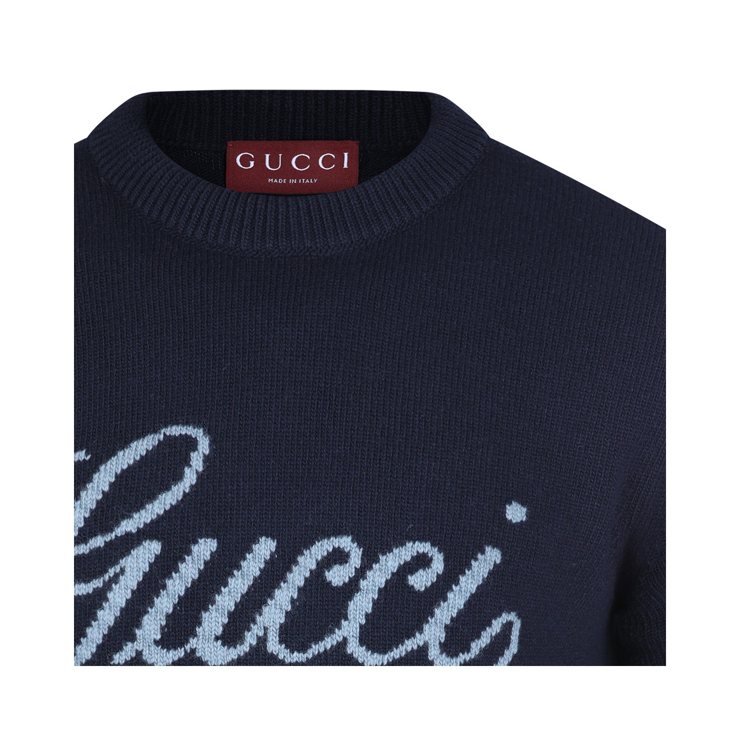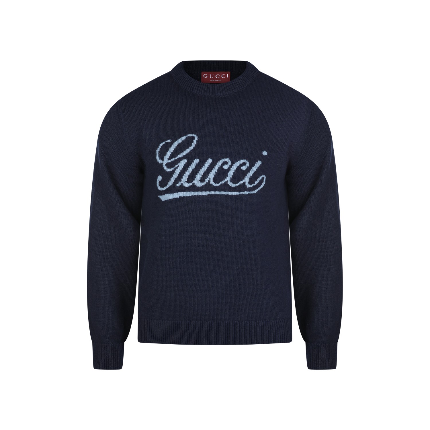 Navy wool knitwear from Gucci featuring crew neck, long sleeves, frontal logo and regular vestibility.