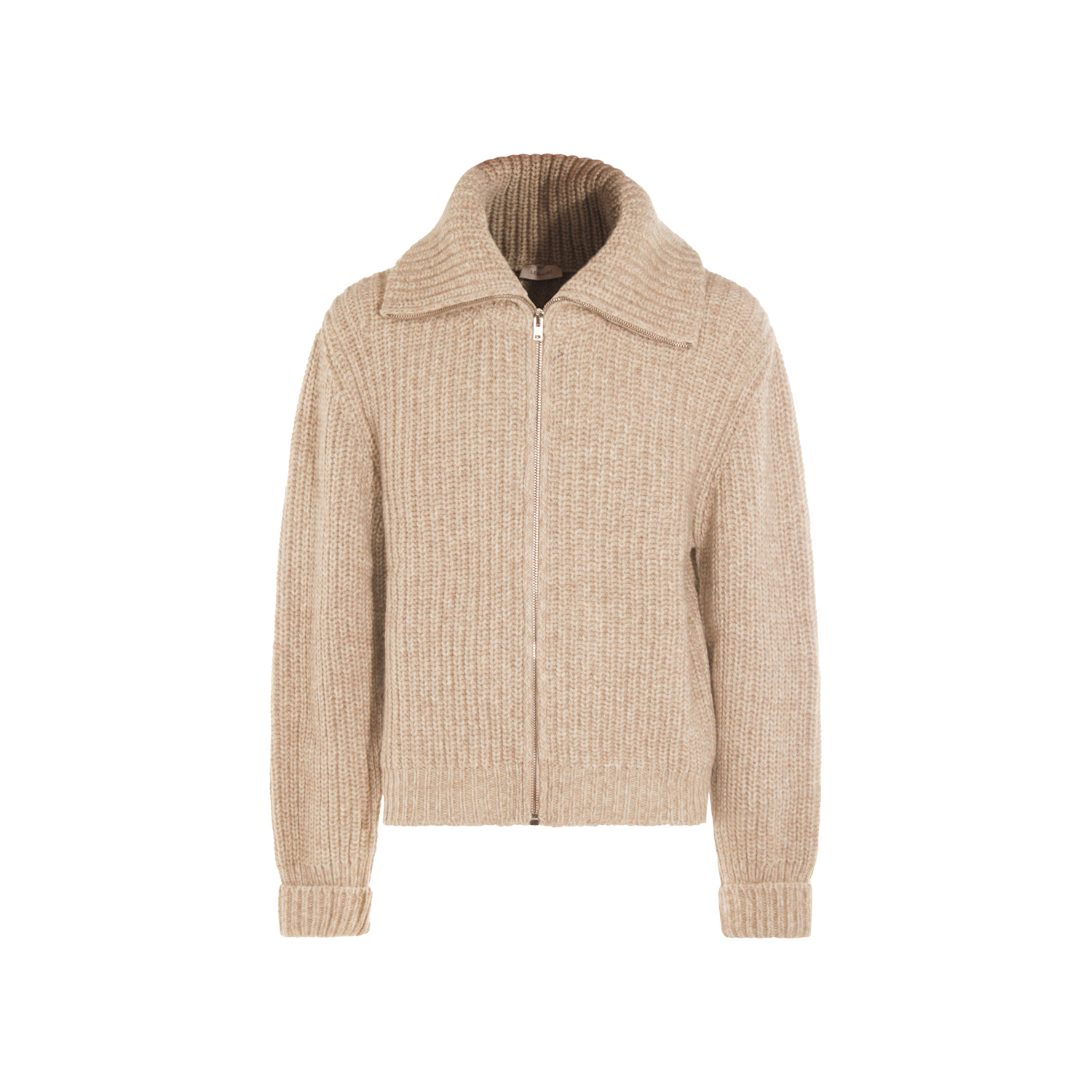Beige wool knitwear from Lemaire featuring high zipped collar, long sleeves, ribbed motif and regular vestibility.