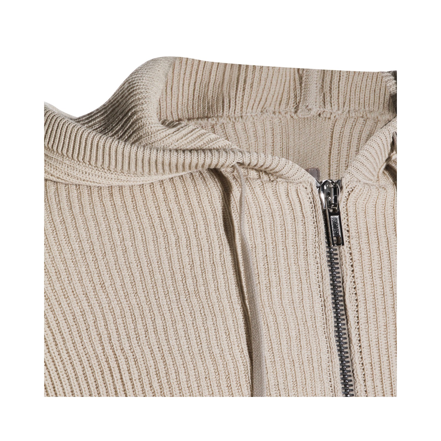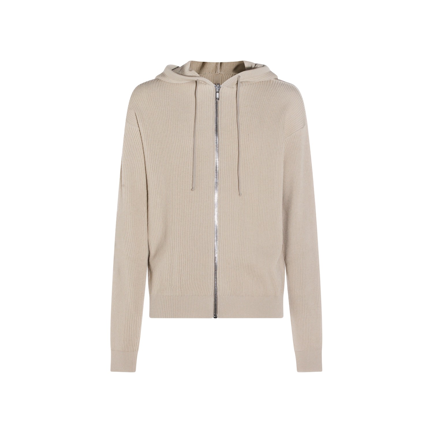 Sand virgin wool hooded sweater from Rick Owens featuring zip closure, silver tone metal hardware, long sleeves, hoodie and ribbed hems.