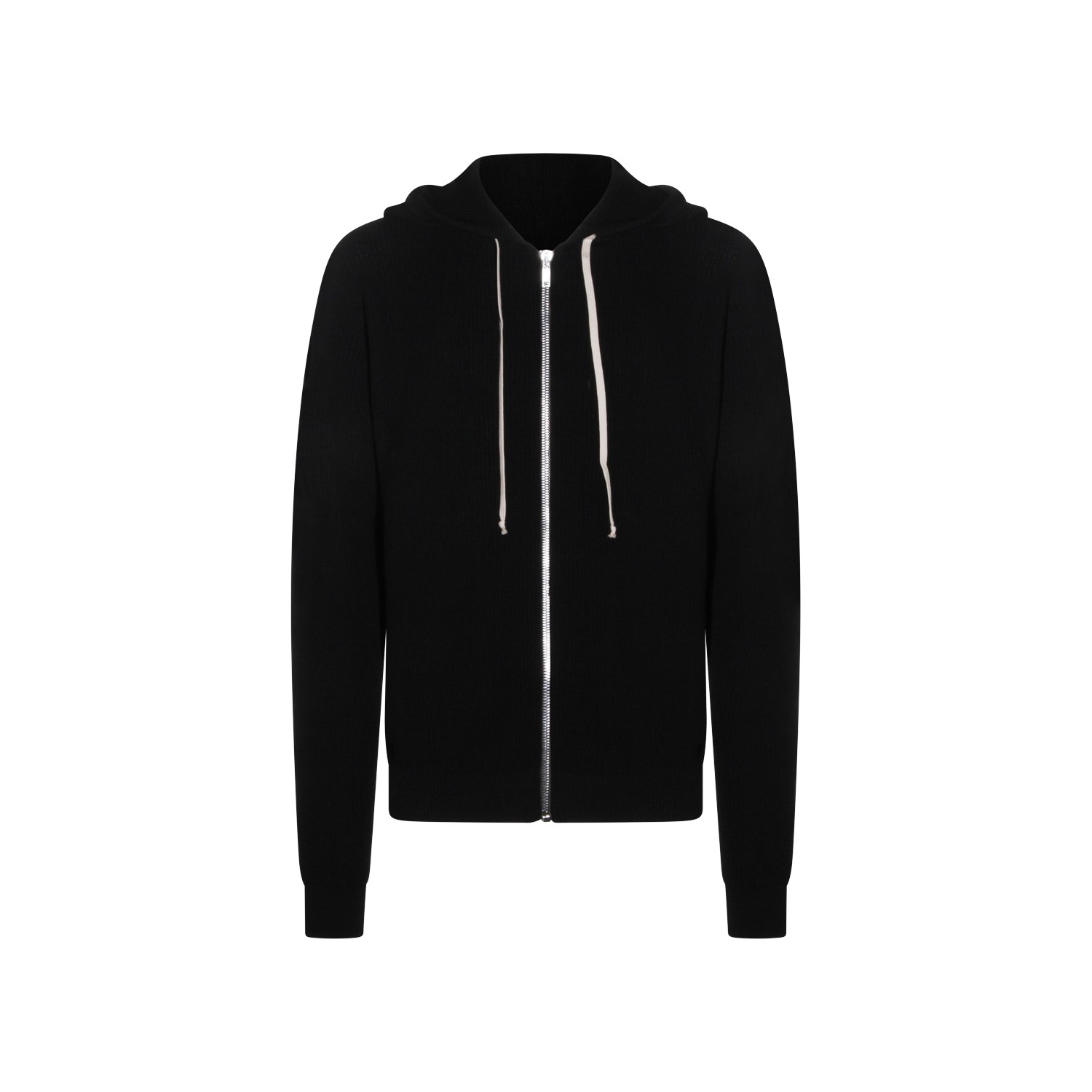 Black virgin wool hooded sweater from Rick Owens featuring zip closure, silver tone metal hardware, long sleeves, hoodie and ribbed hems.