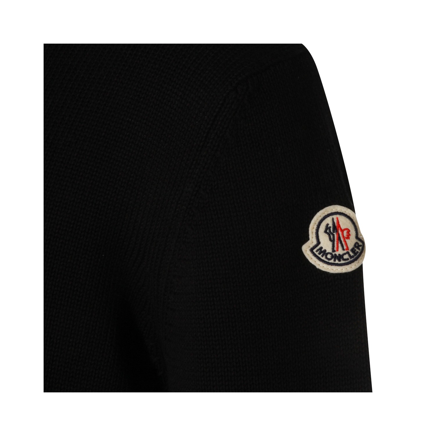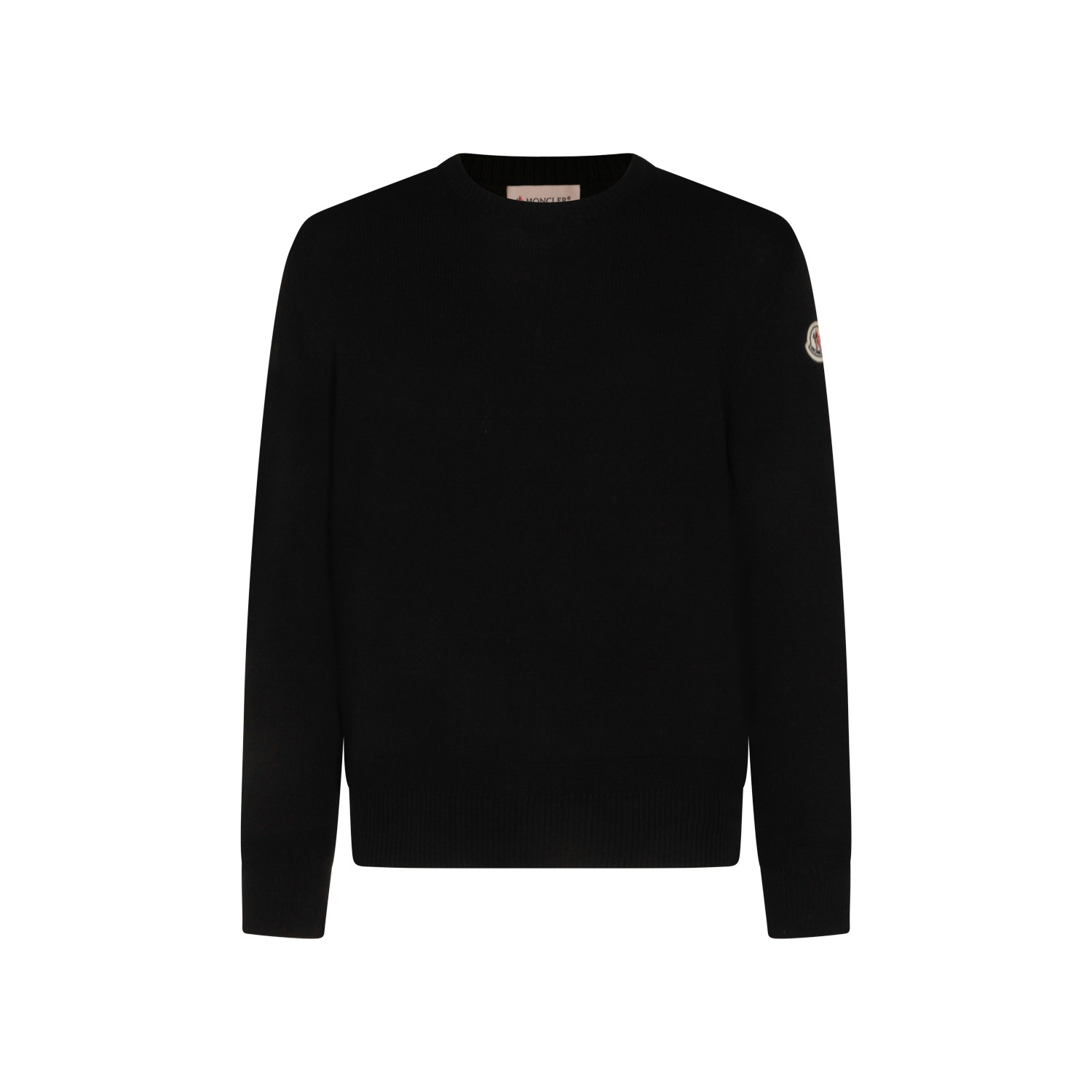 Black cotton knitwear from Moncler featuring crew neck, long sleeves, logo patch on arm and regular fit.