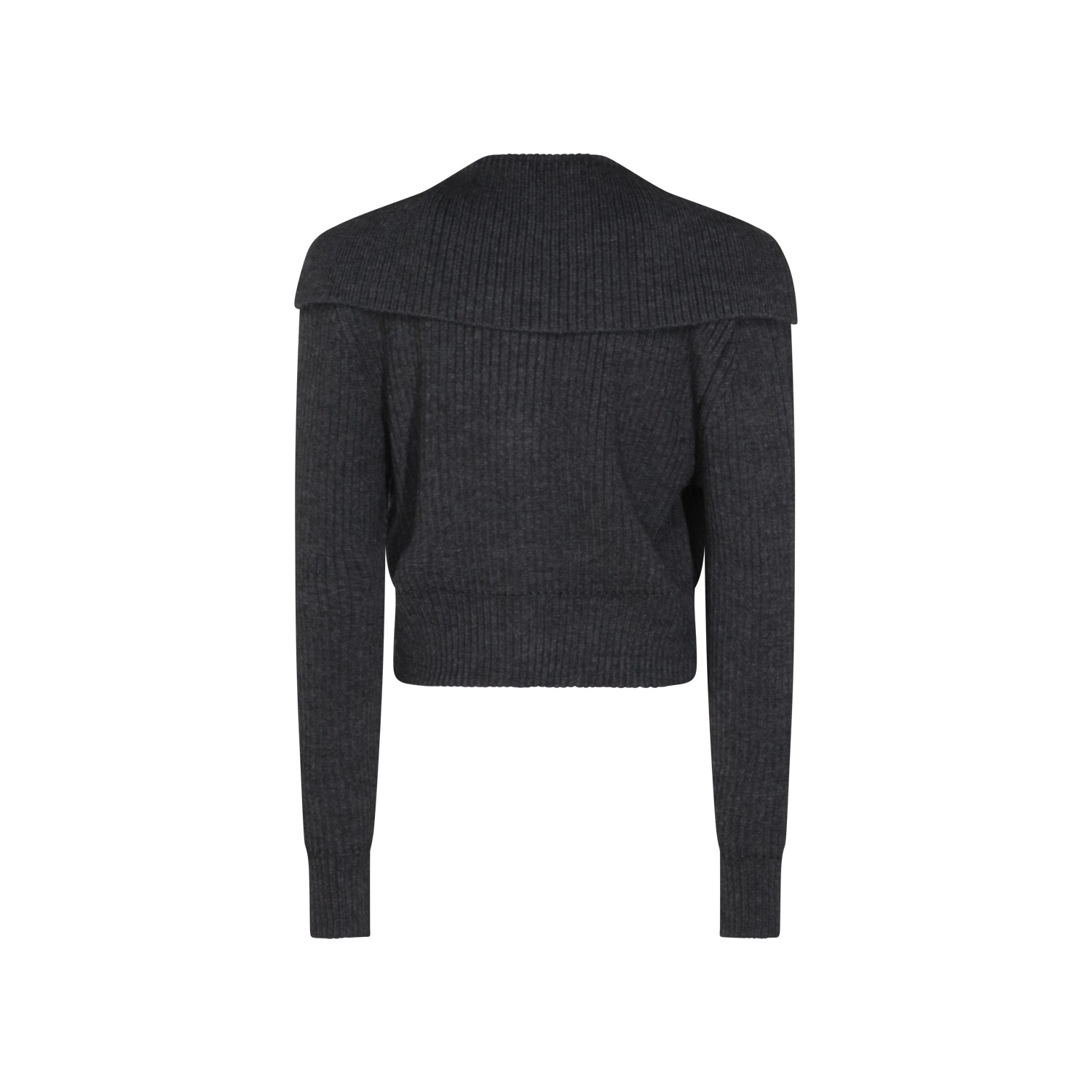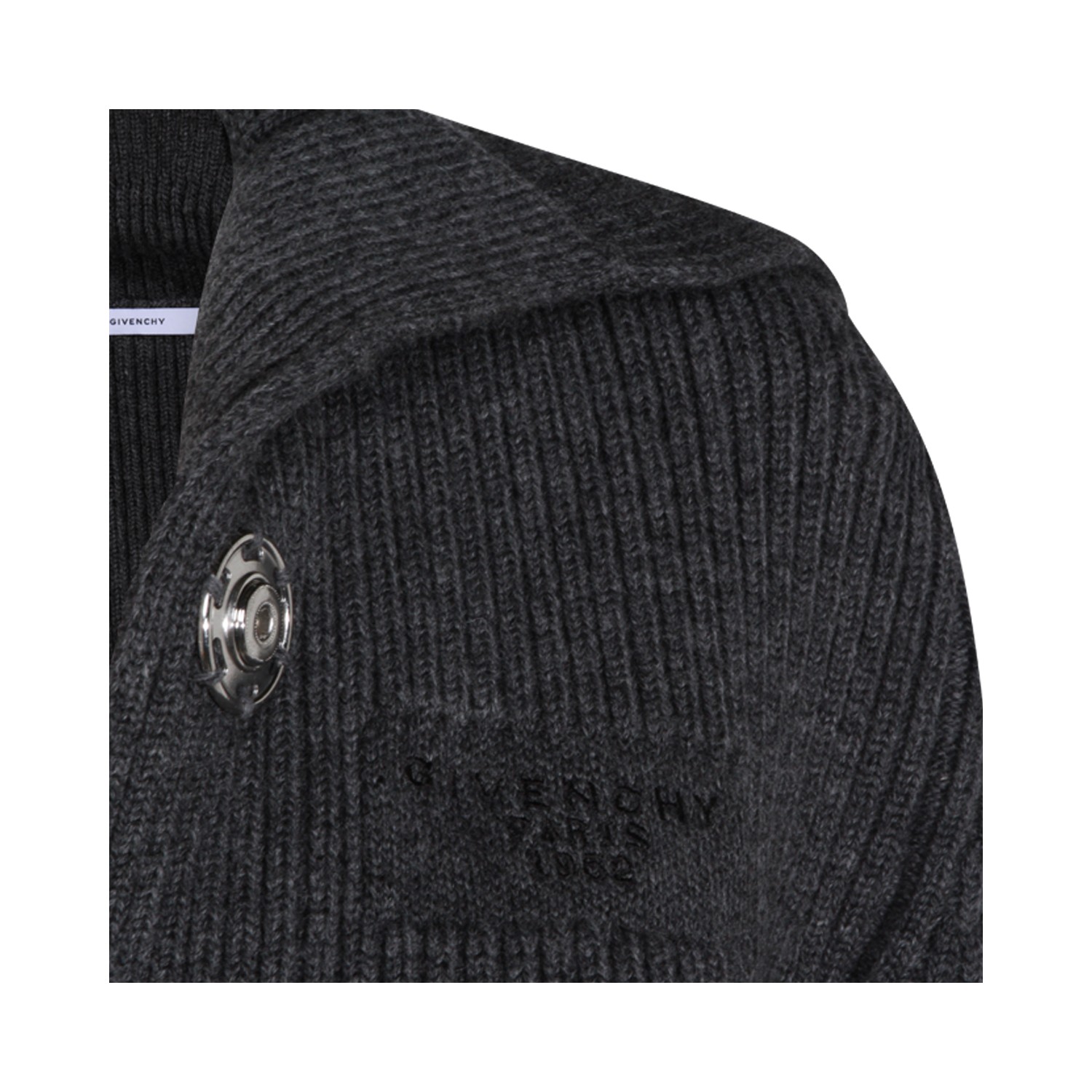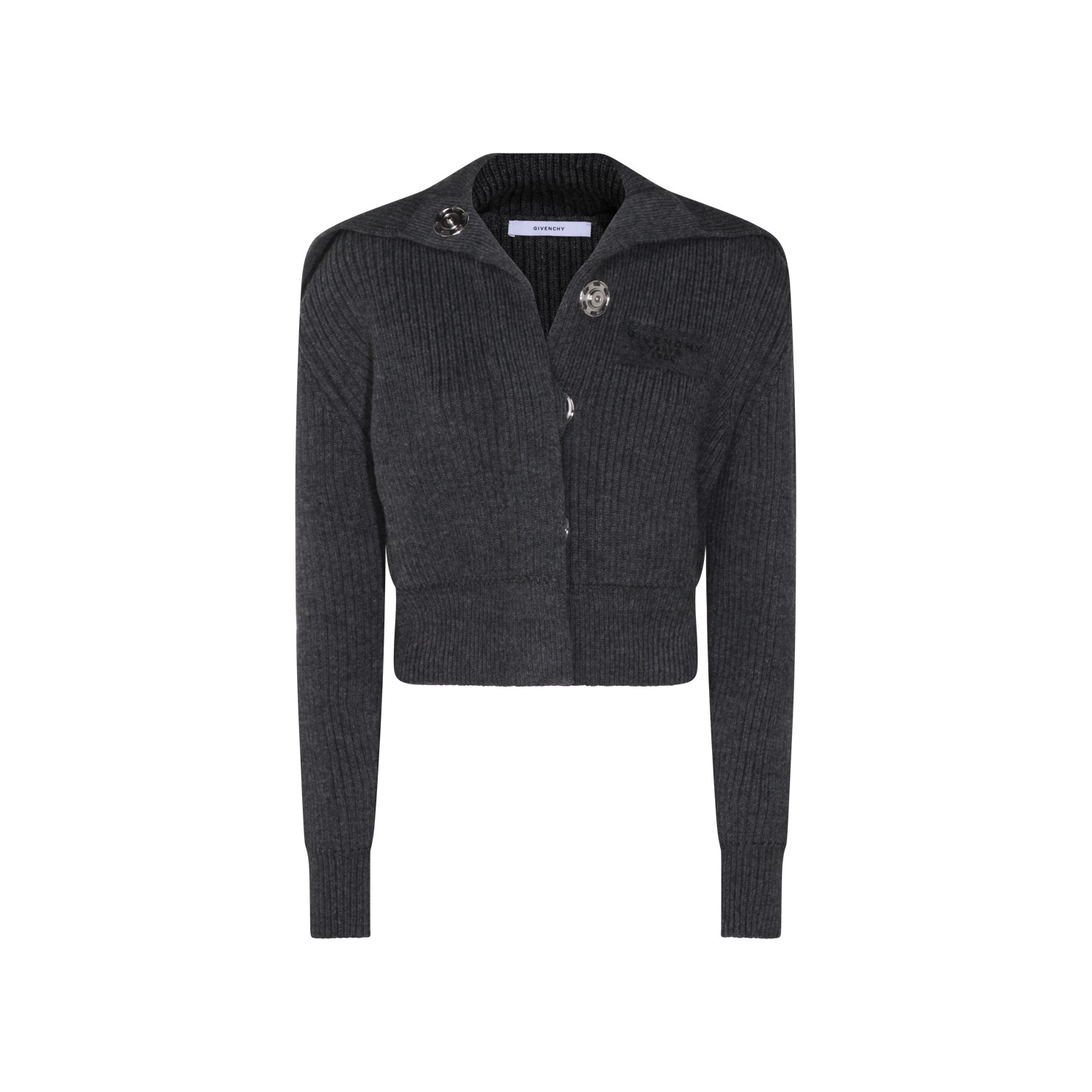 Dark grey wool knitwear from Givenchy featuring wide scarf, long sleeves, frontal fastening, embellishments and cropped.