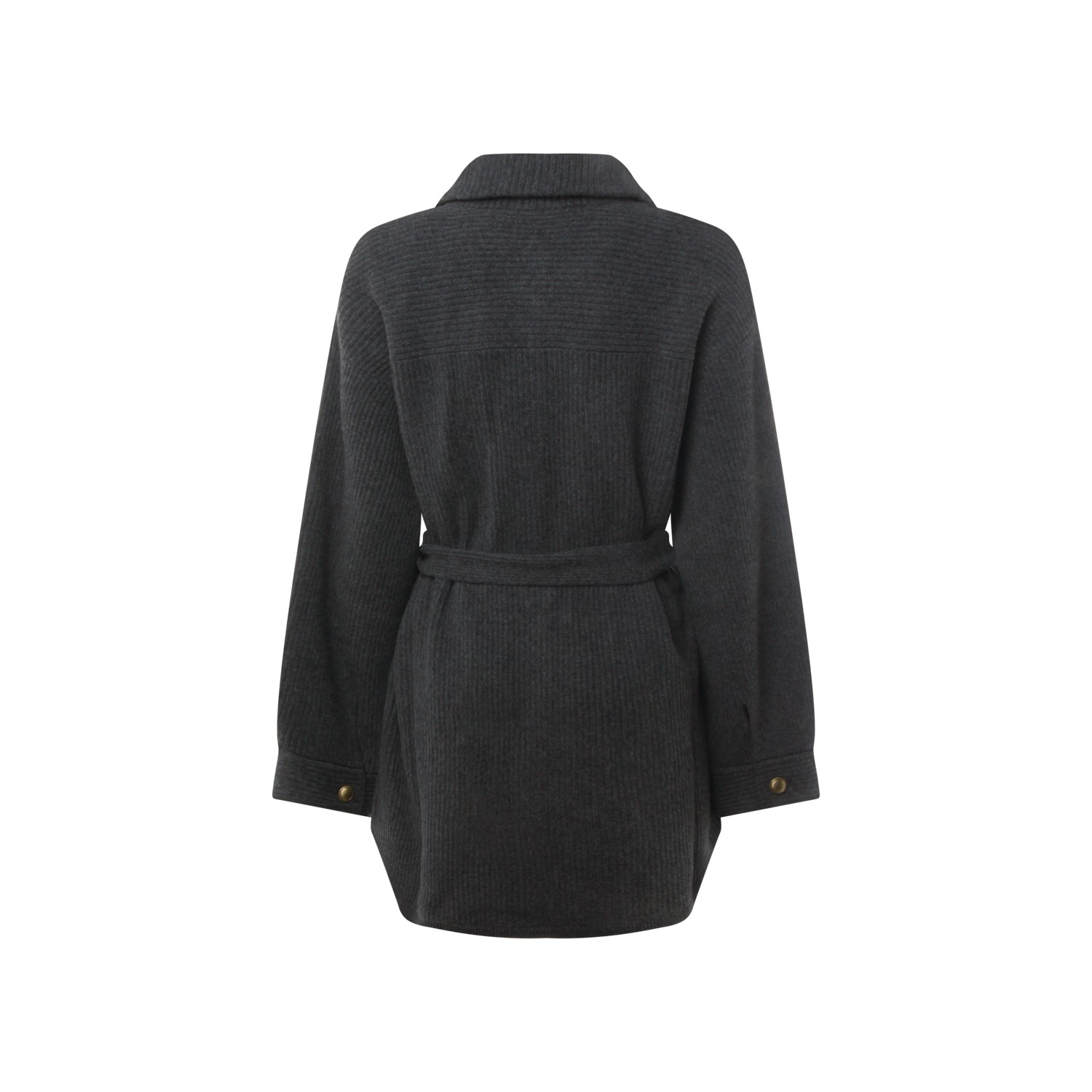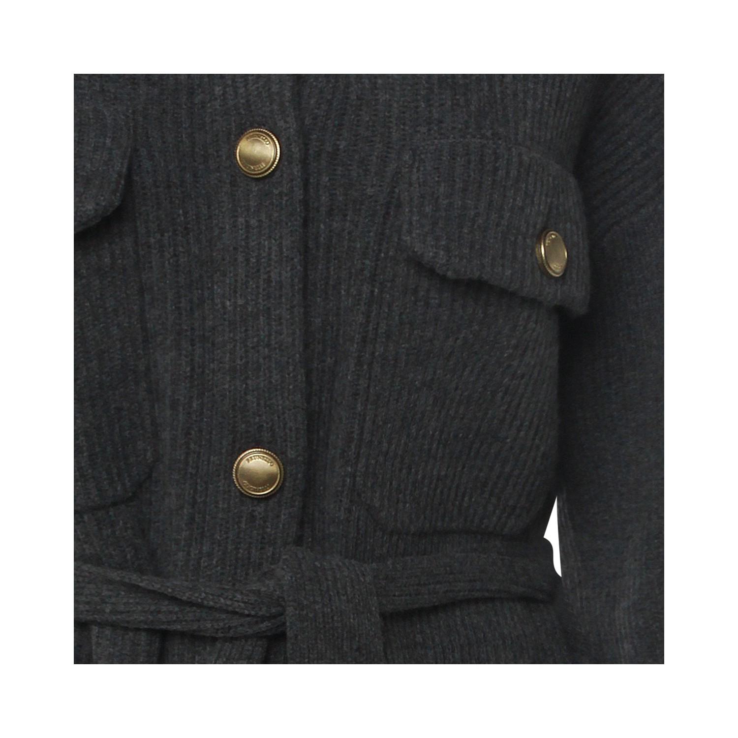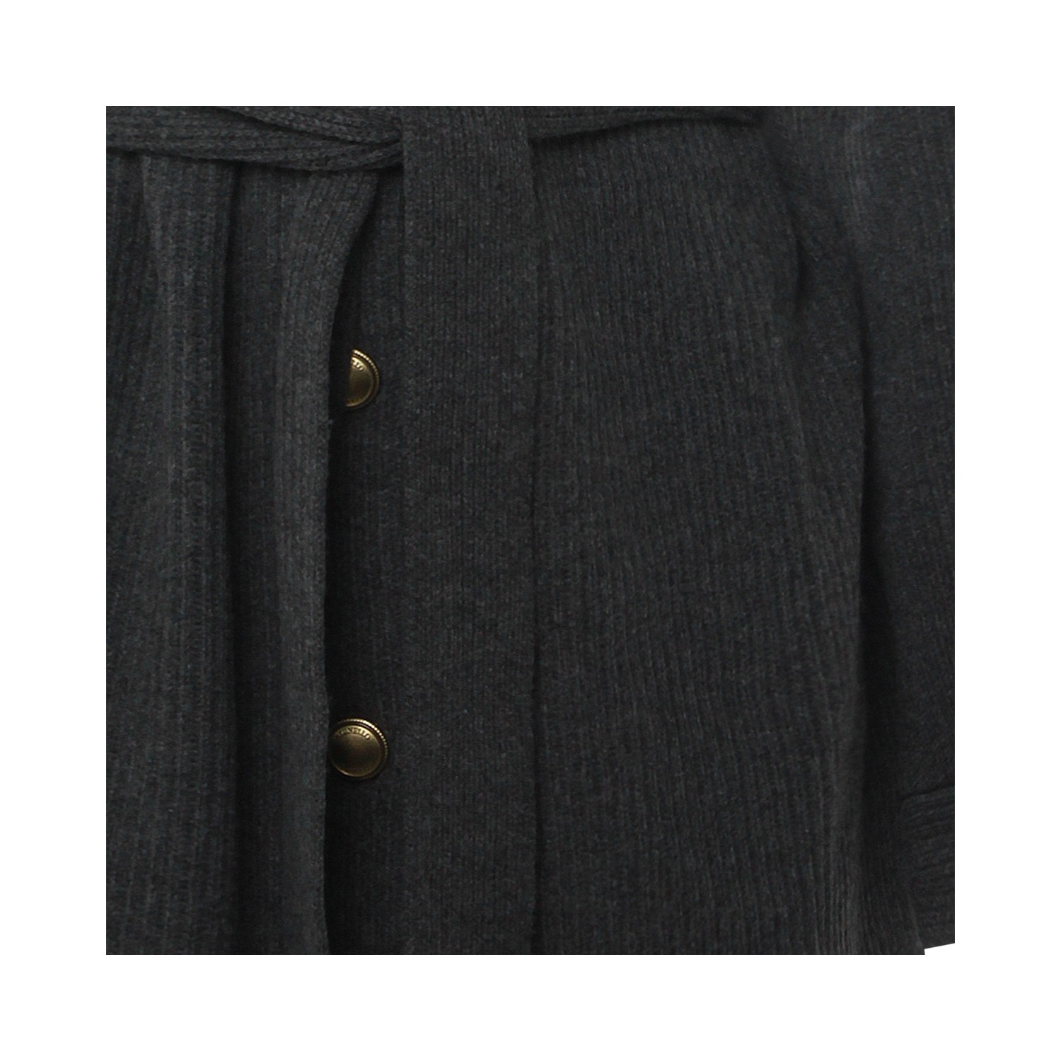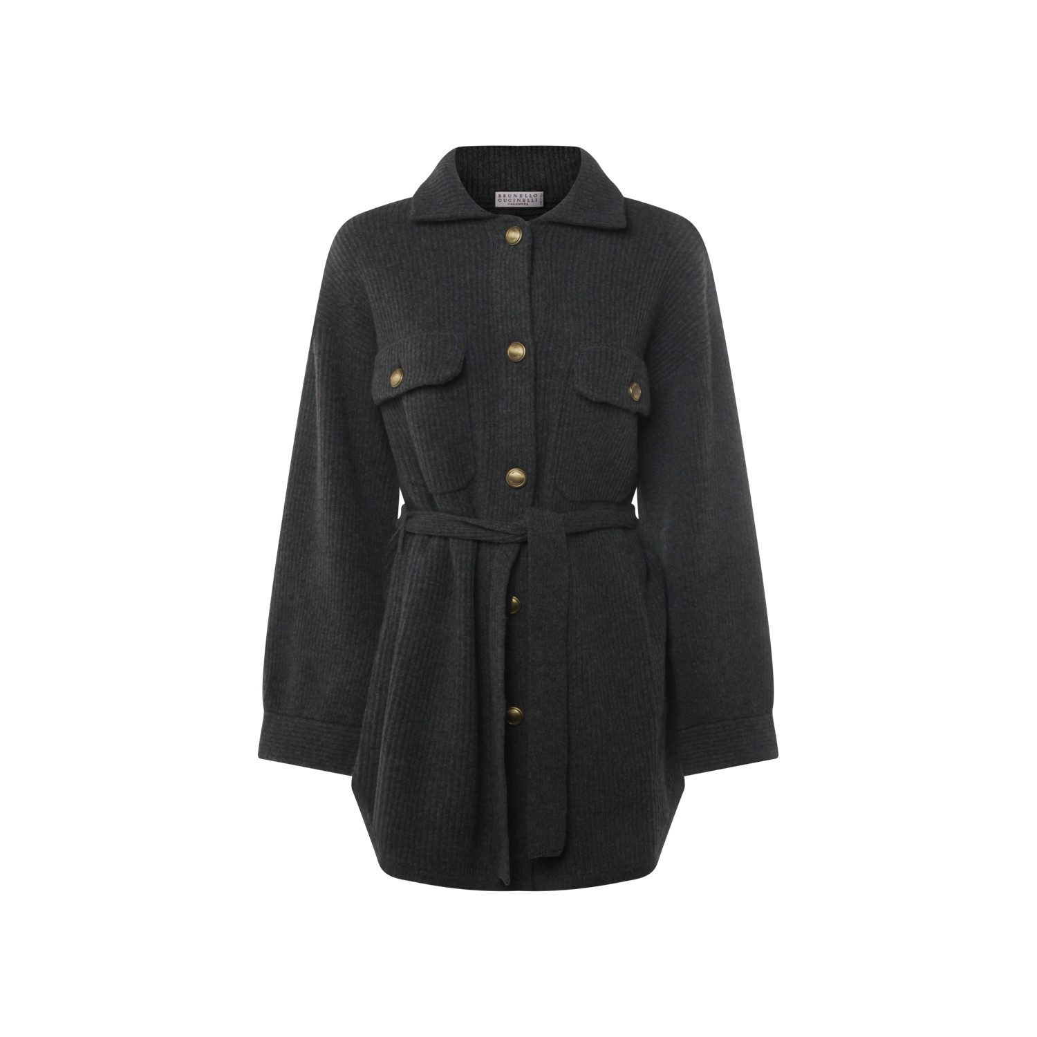 Dark grey wool blend knitwear from Brunello Cucinelli featuring shirt collar, frontal buttons fastening, long sleeves, belt loop and gold tone hardware