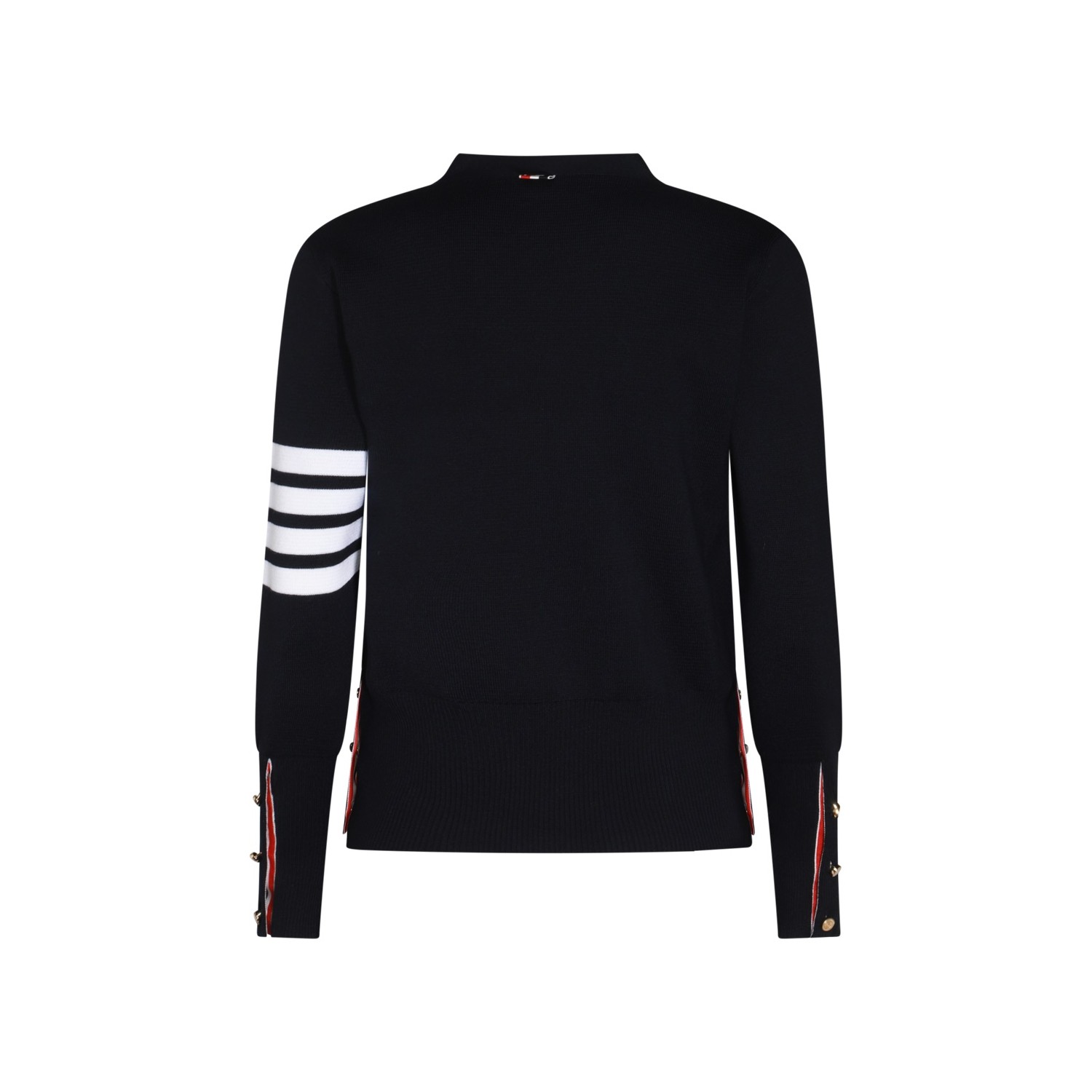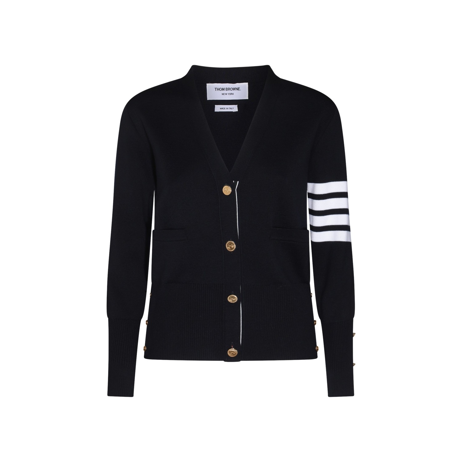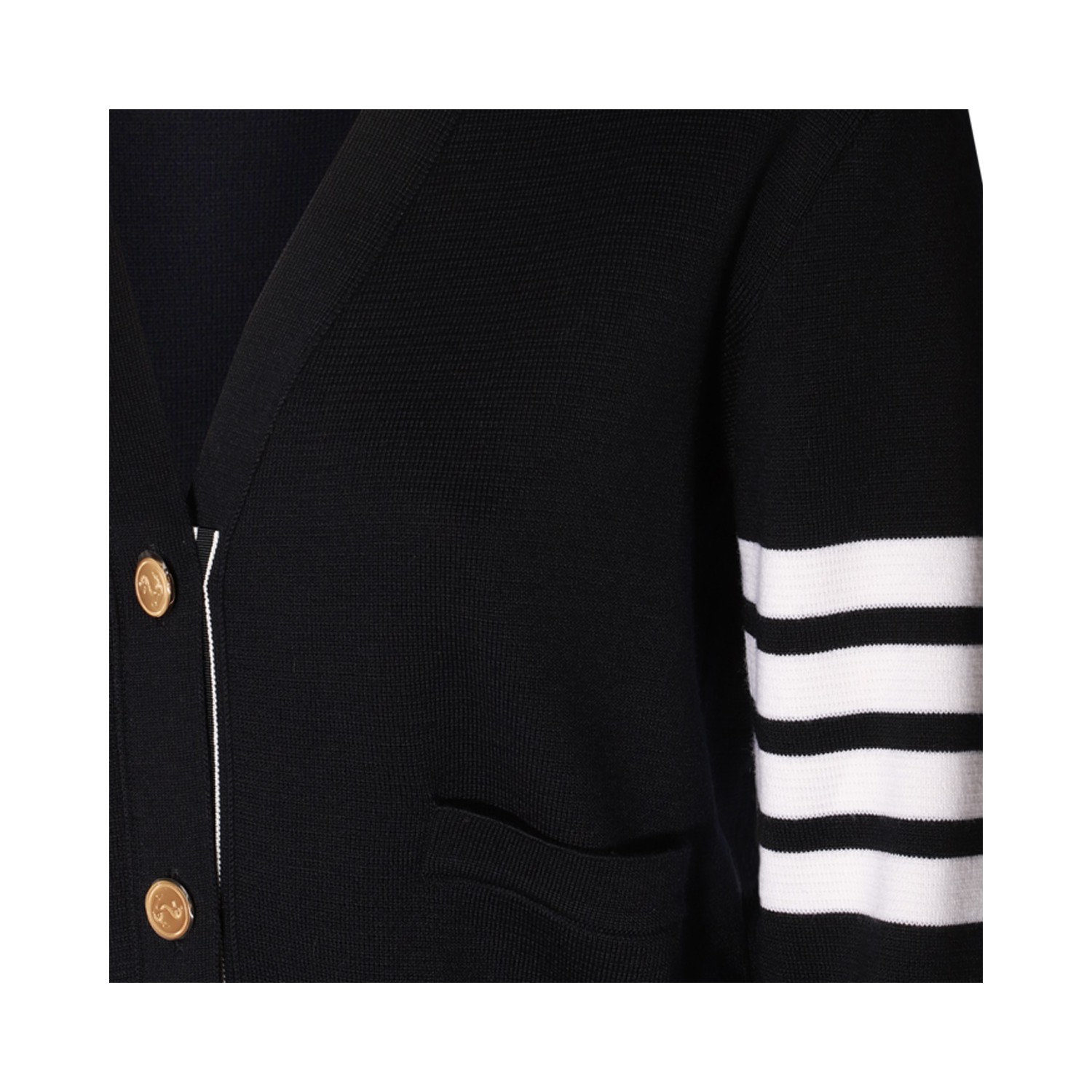 Navy blue wool cardigan from Thom Browne featuring V-neck, front button fastening, long sleeves, ribbed cuffs, ribbed hem, Milano stitching and signature 4-Bar stripes.