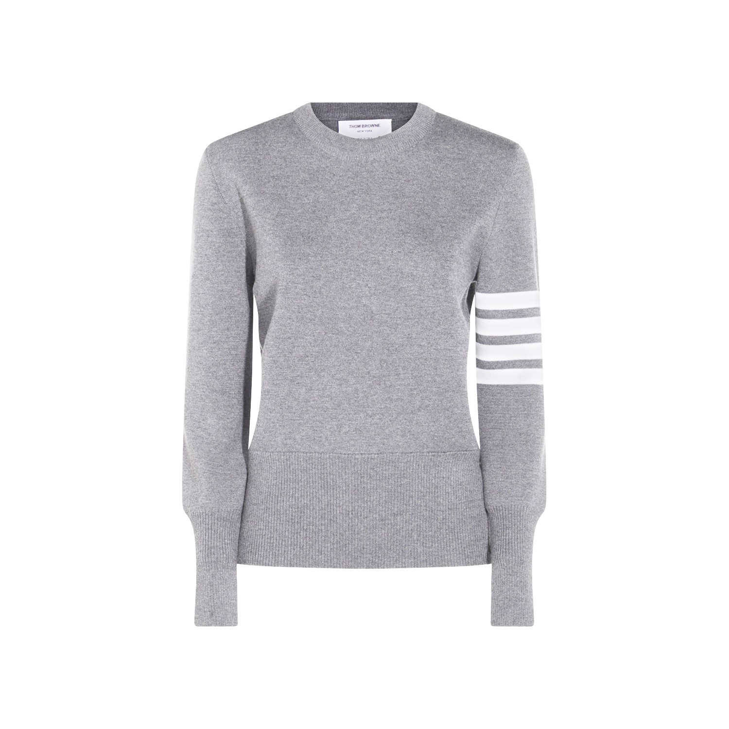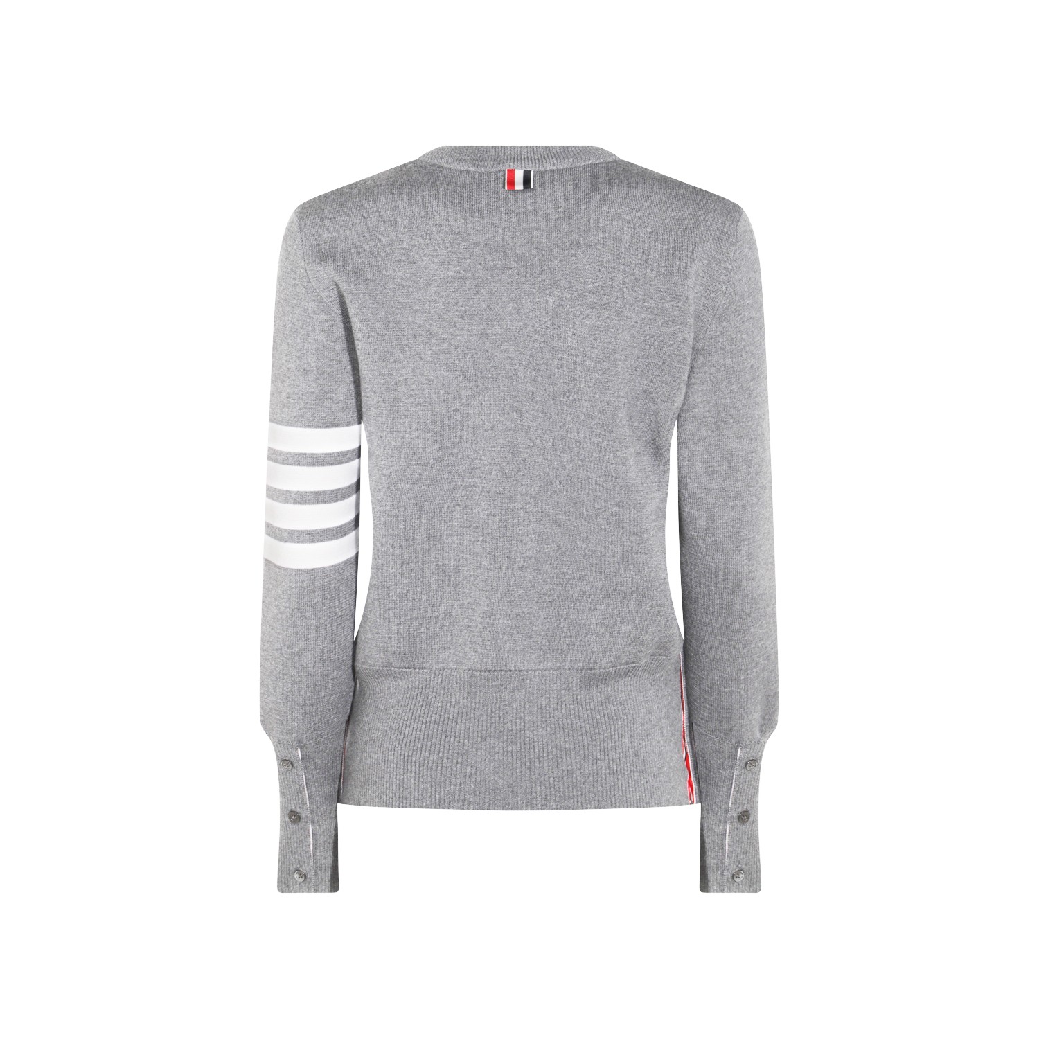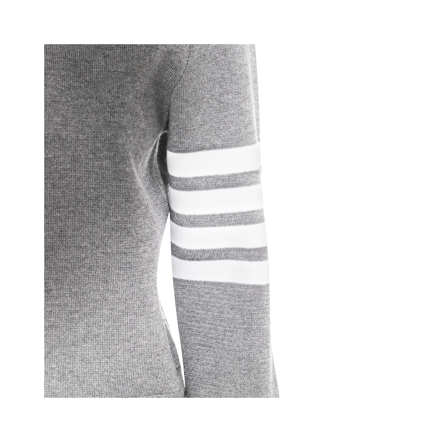 Dark grey wool knitwear from Thom Browne featuring round collar, long sleeves, ribbed cuffs and hem and regular vestibility.