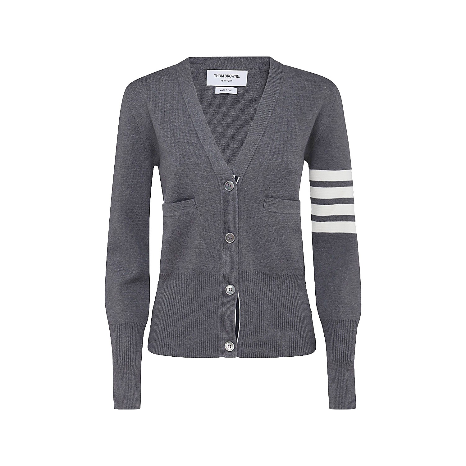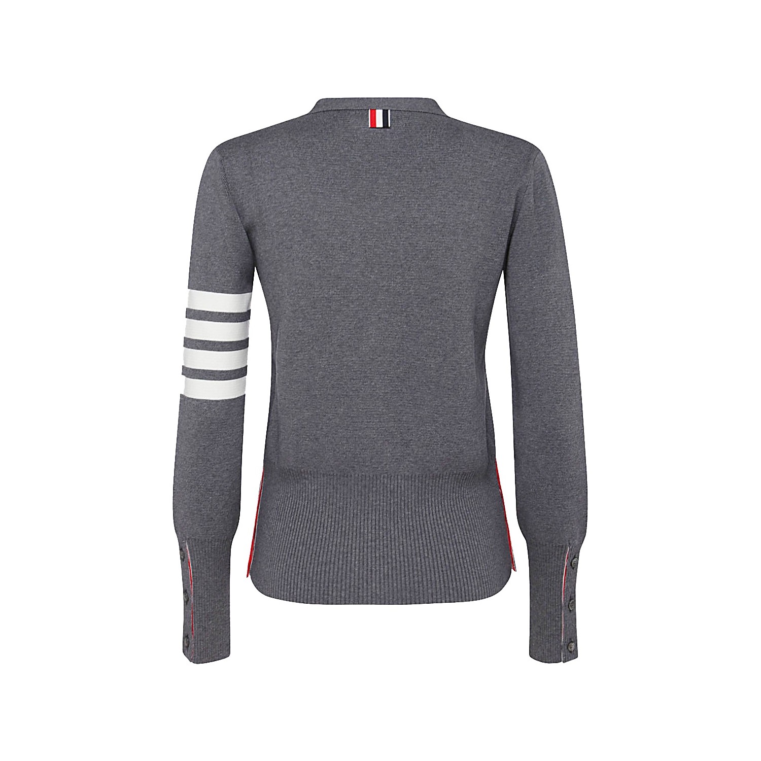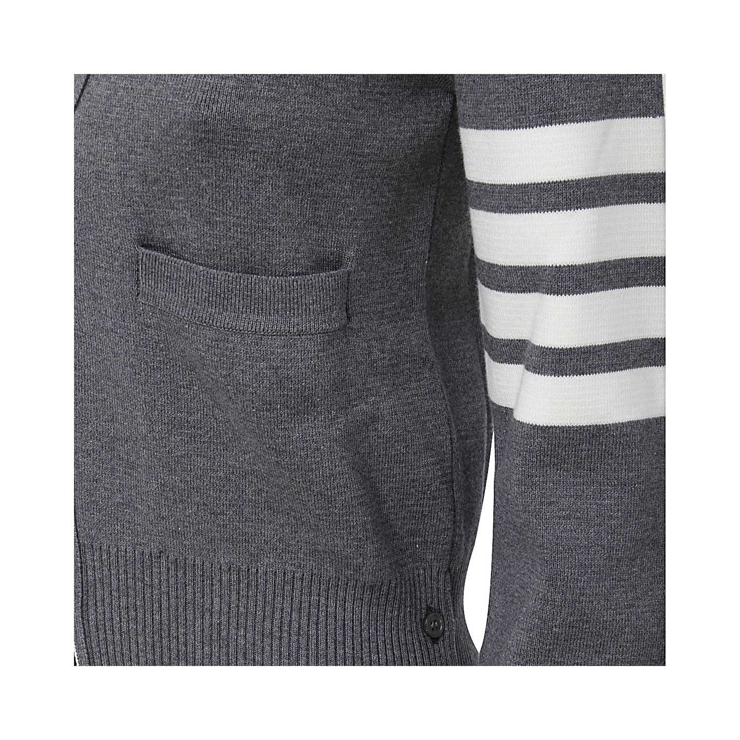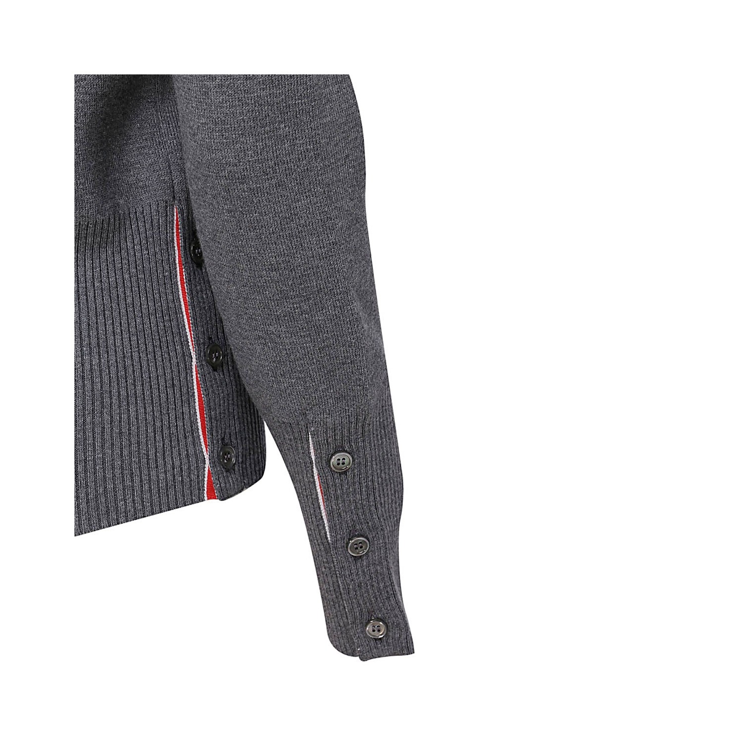 Med grey wool knitwear from Thom Browne featuring long sleeves, ribbed cuffs, two frontal pockets, buttons fastening and regular vestibility.